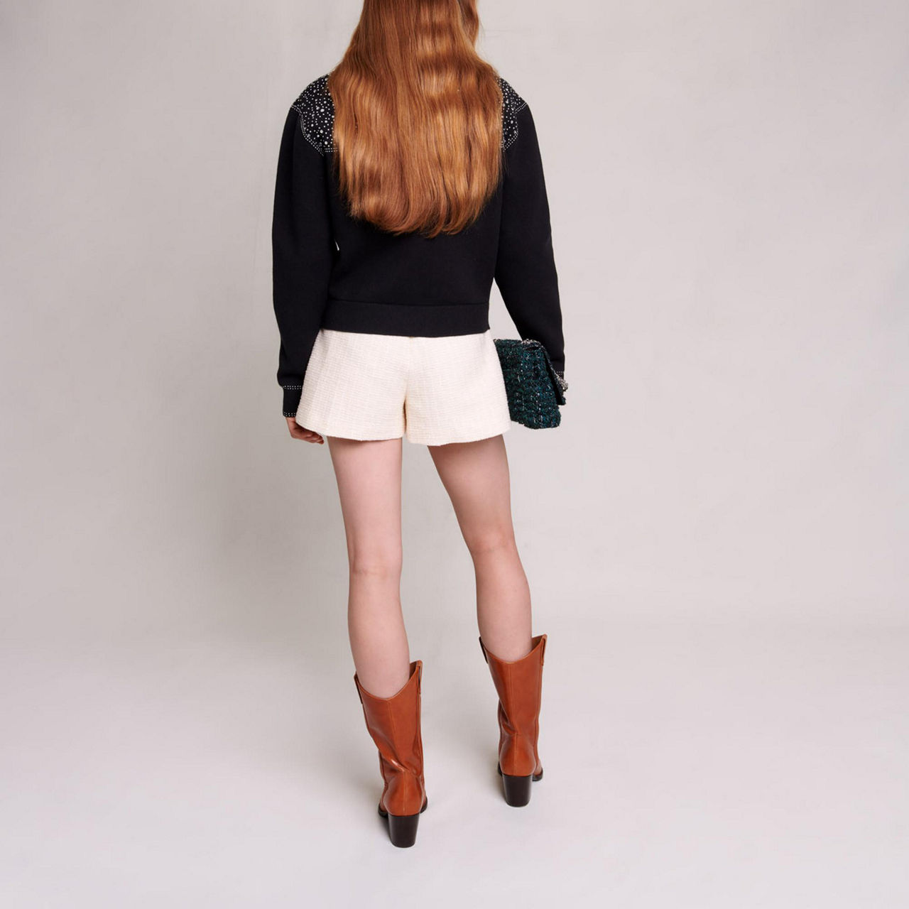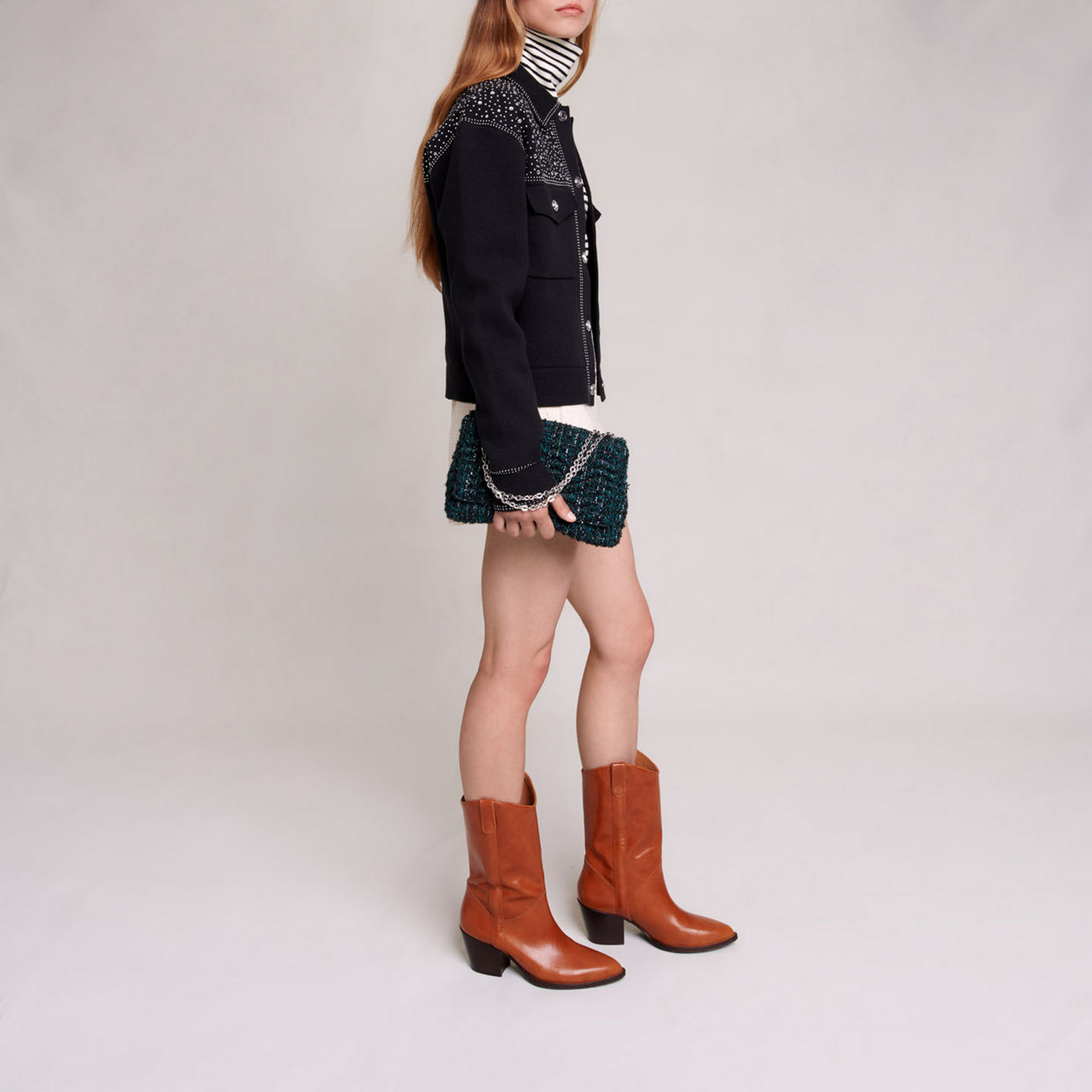 - Pointed shirt collar, long sleeves, cropped knit finish, two flap pockets, studs and rhinestones embellishments on the shoulders, top-stitched hem, fastening with Clover logo buttons