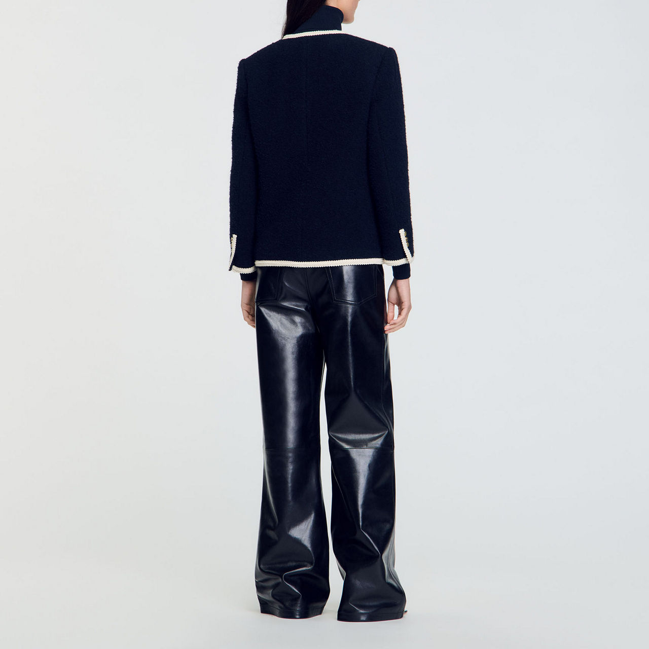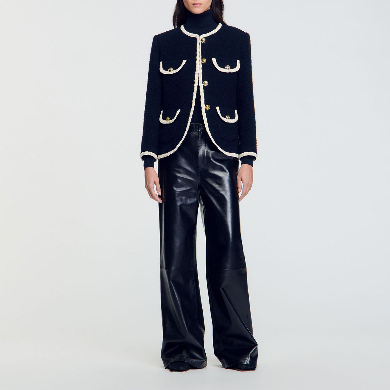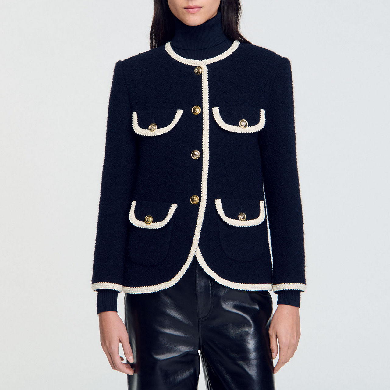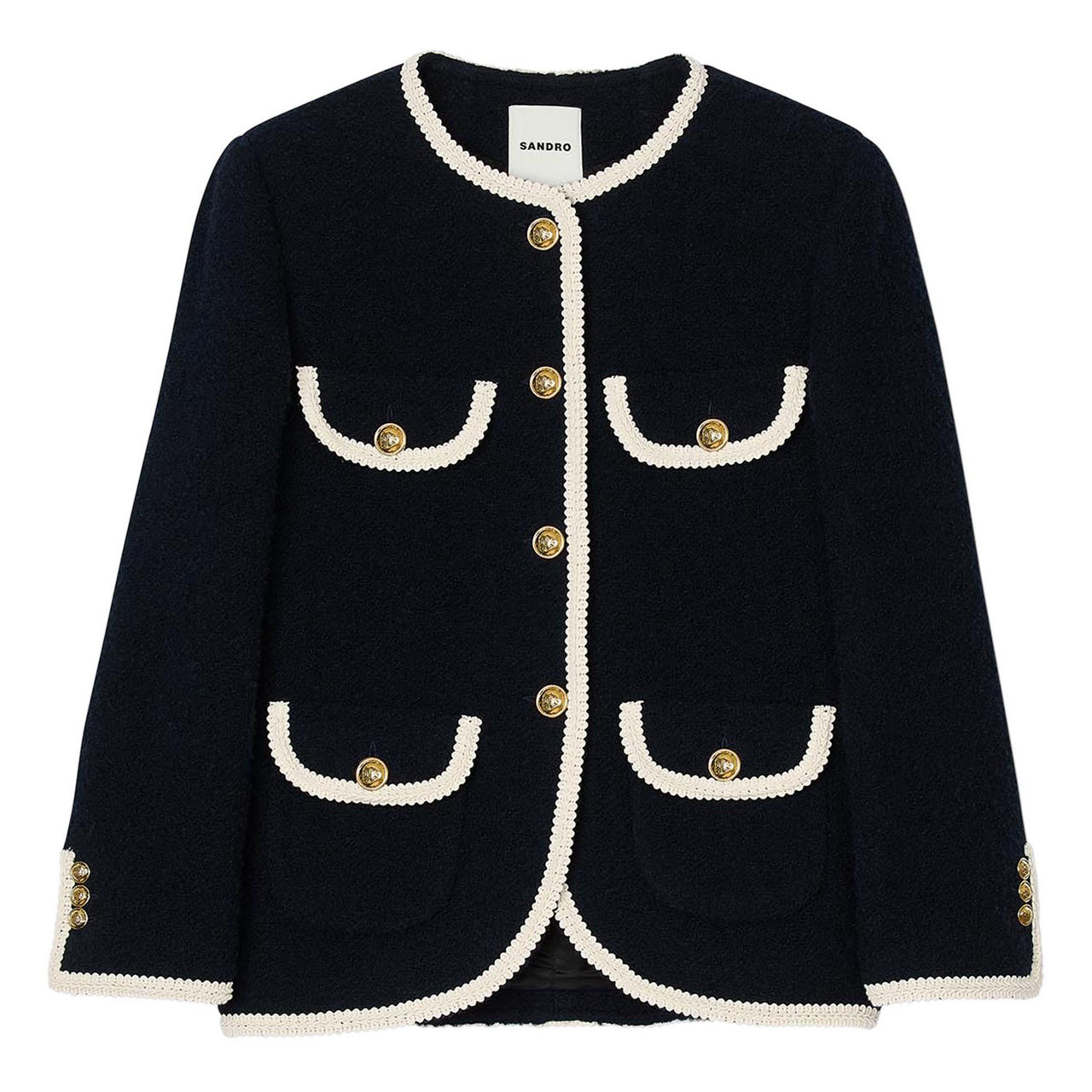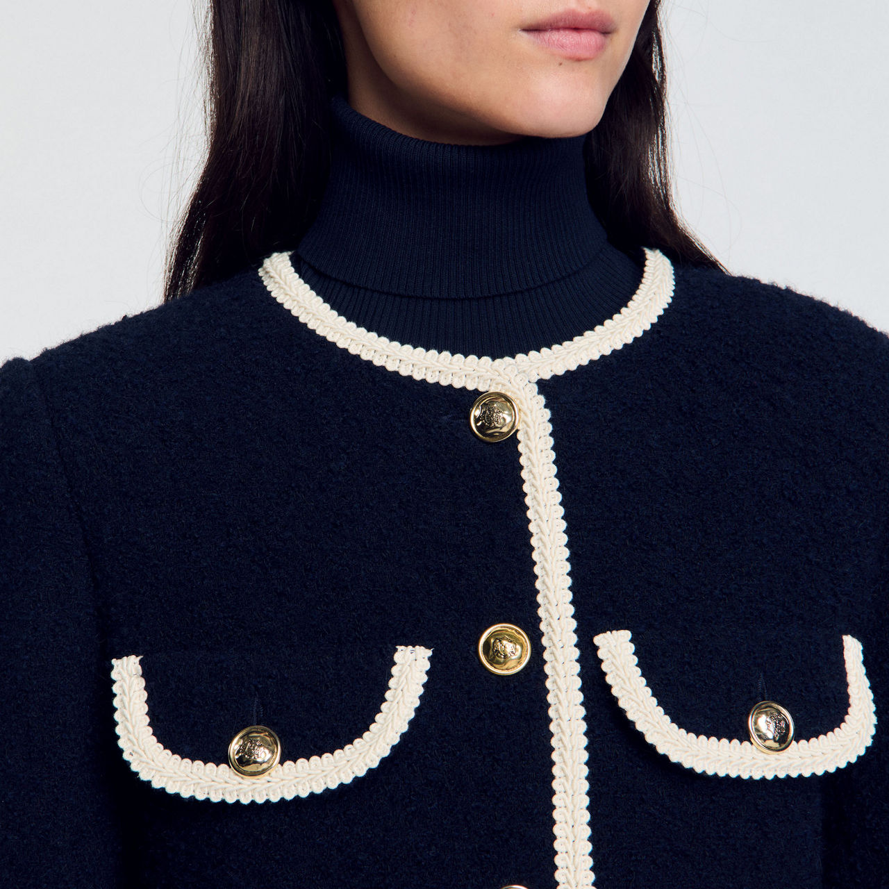 - Round neckline, long sleeves, multiple patch pockets with button fastening, gold-tone button fastening, braided trims, buttoned cuffs, tweed finish