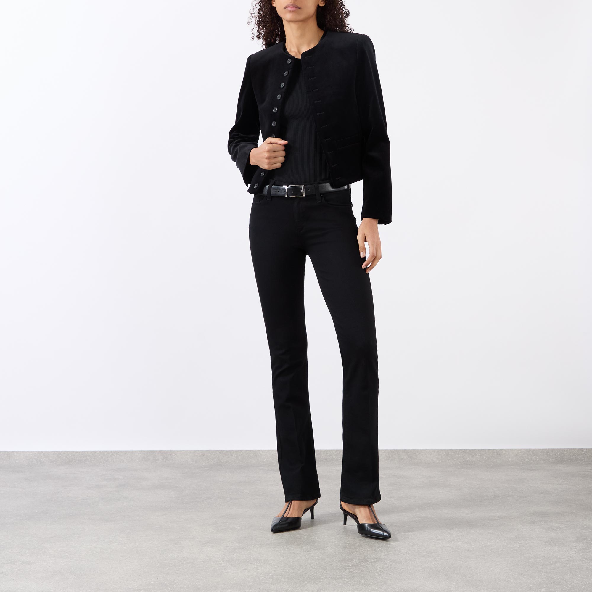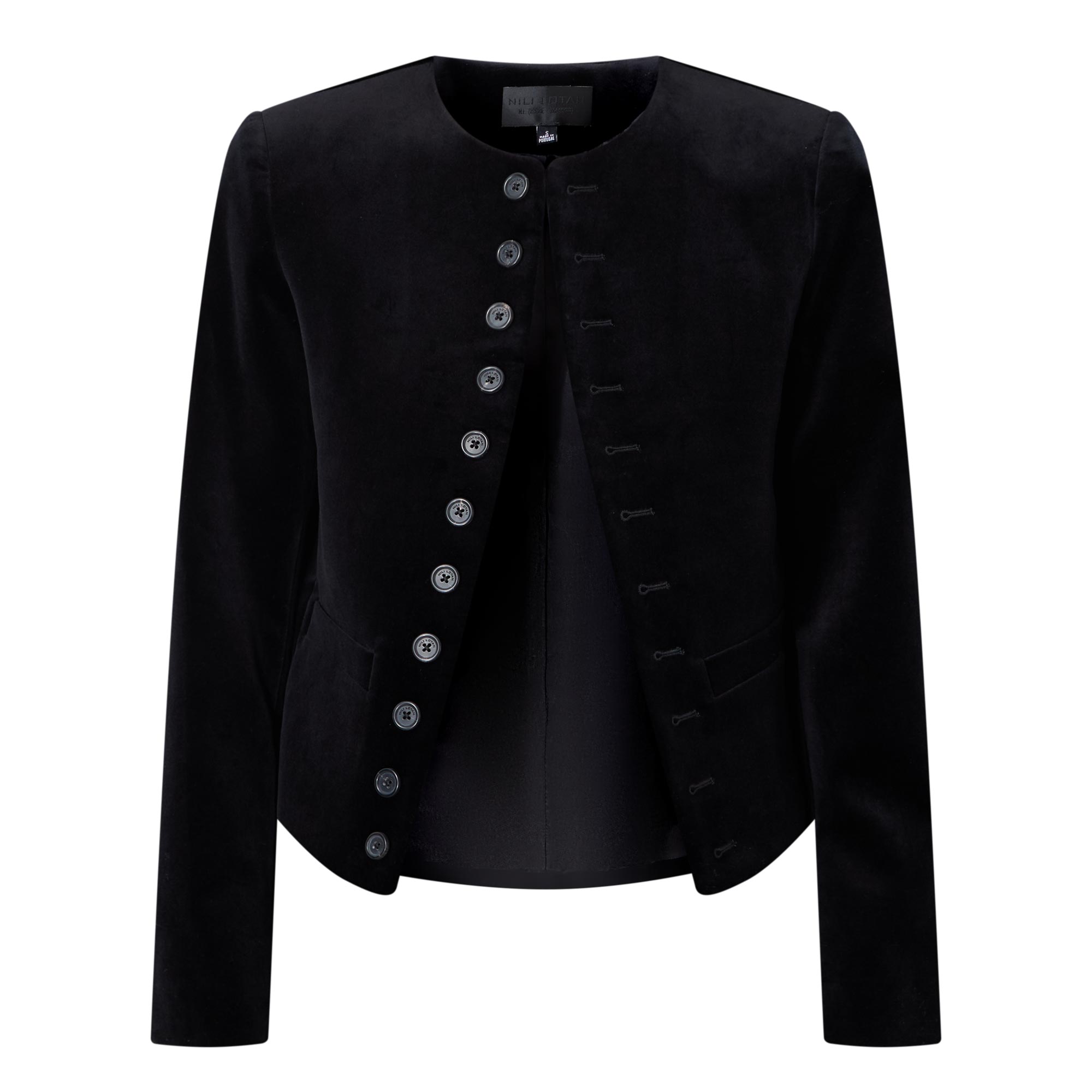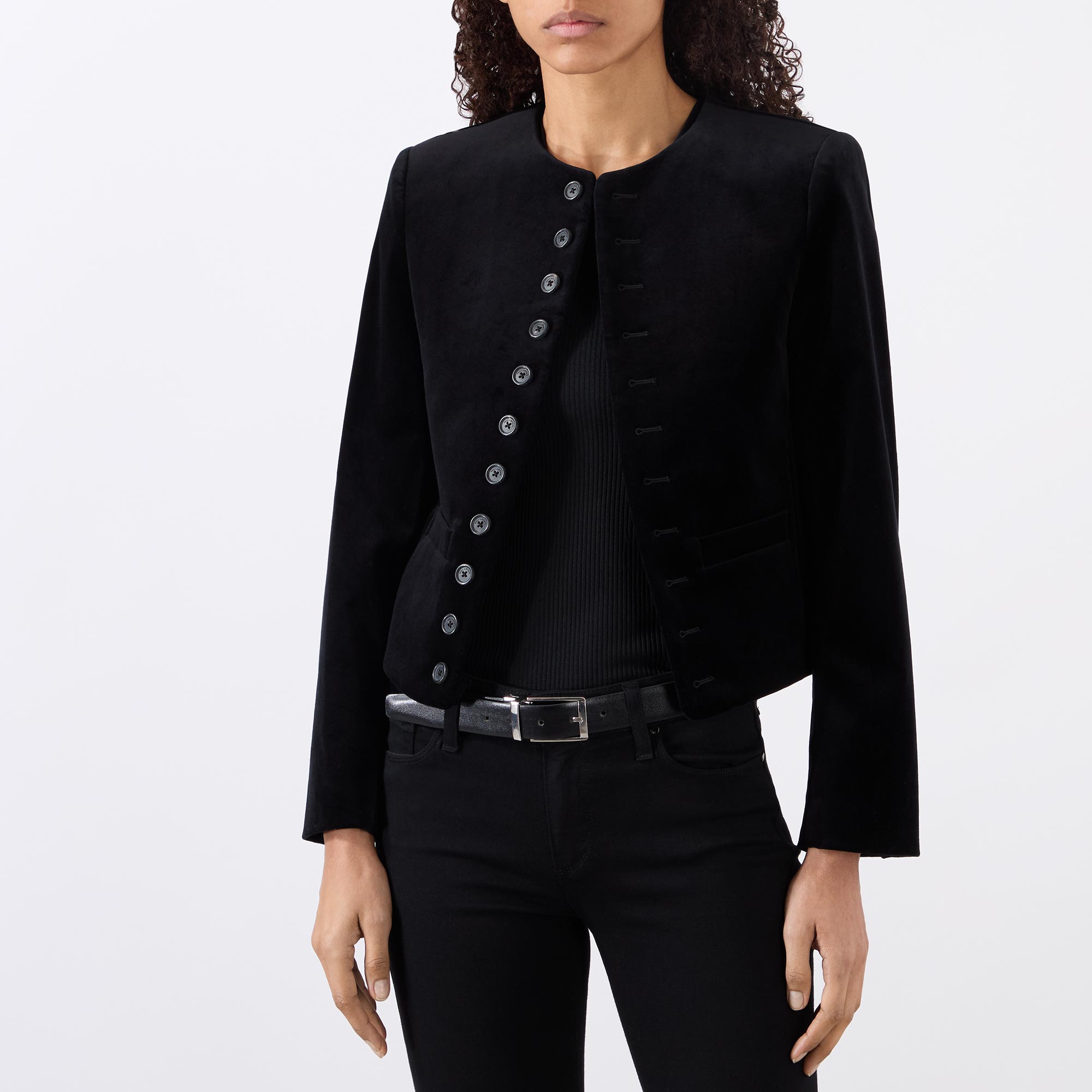 • Round neckline, structured shoulder padded design, long sleeves, front button fastening, two front welt pockets, straight hem, cropped length, velvet finish, lined