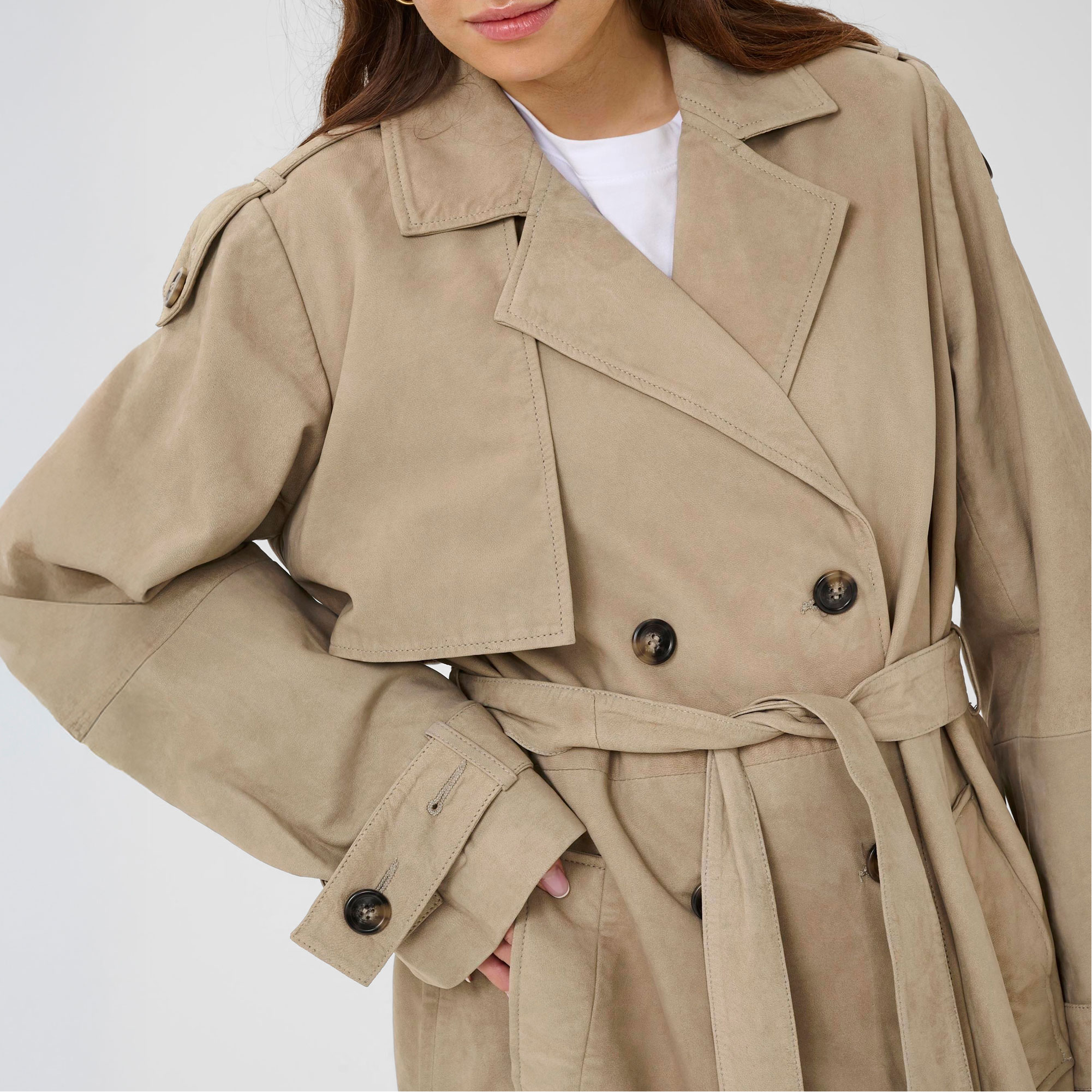 - Trench style, soft sheep suede, long sleeves, collar