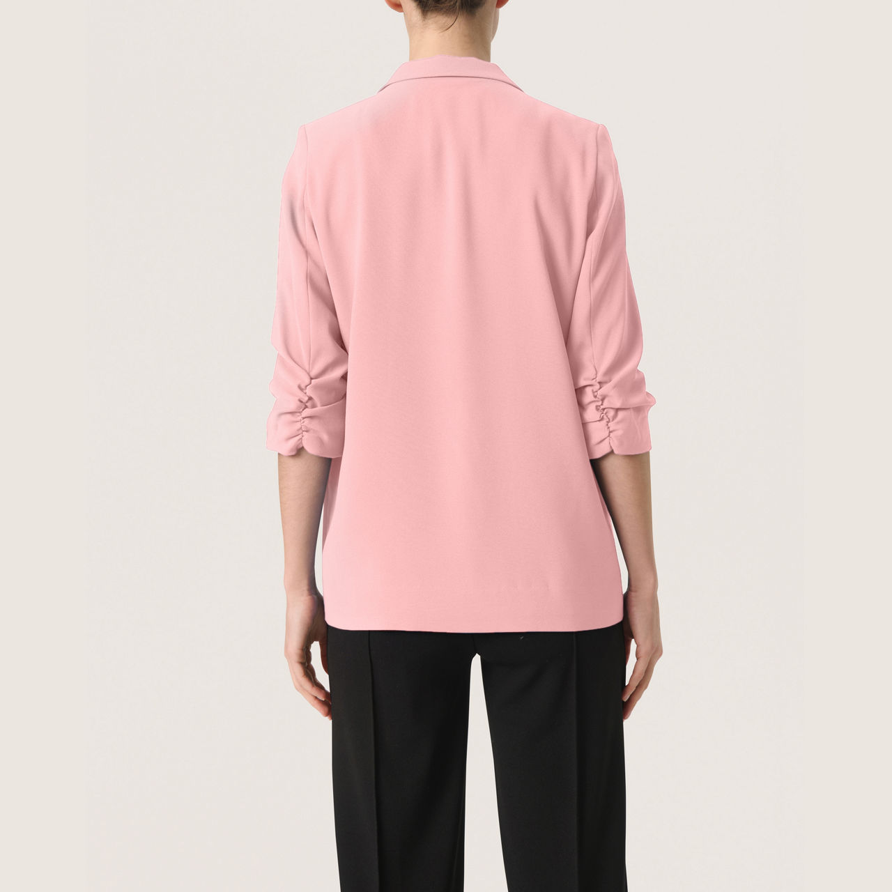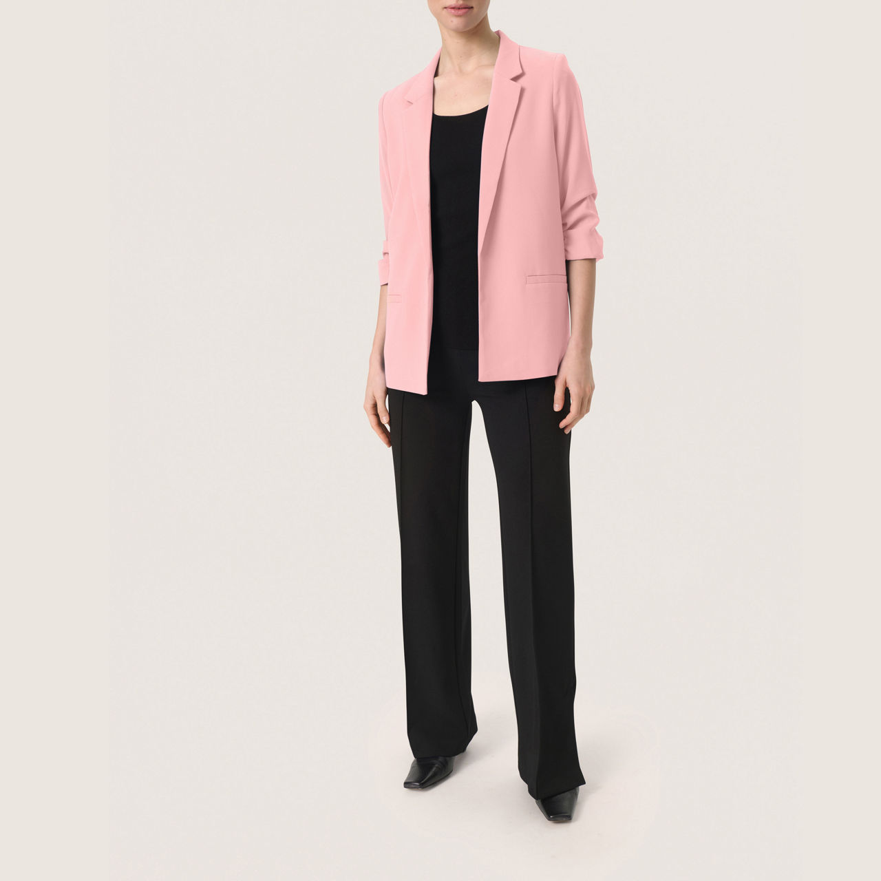 - Notch lapels, jetted front pockets, three-quarter-length sleeves, ruched edges, lined