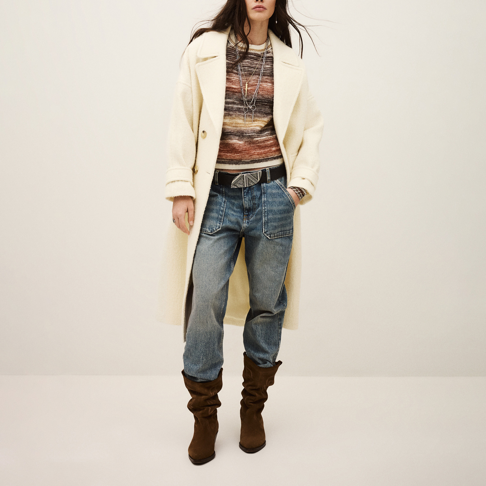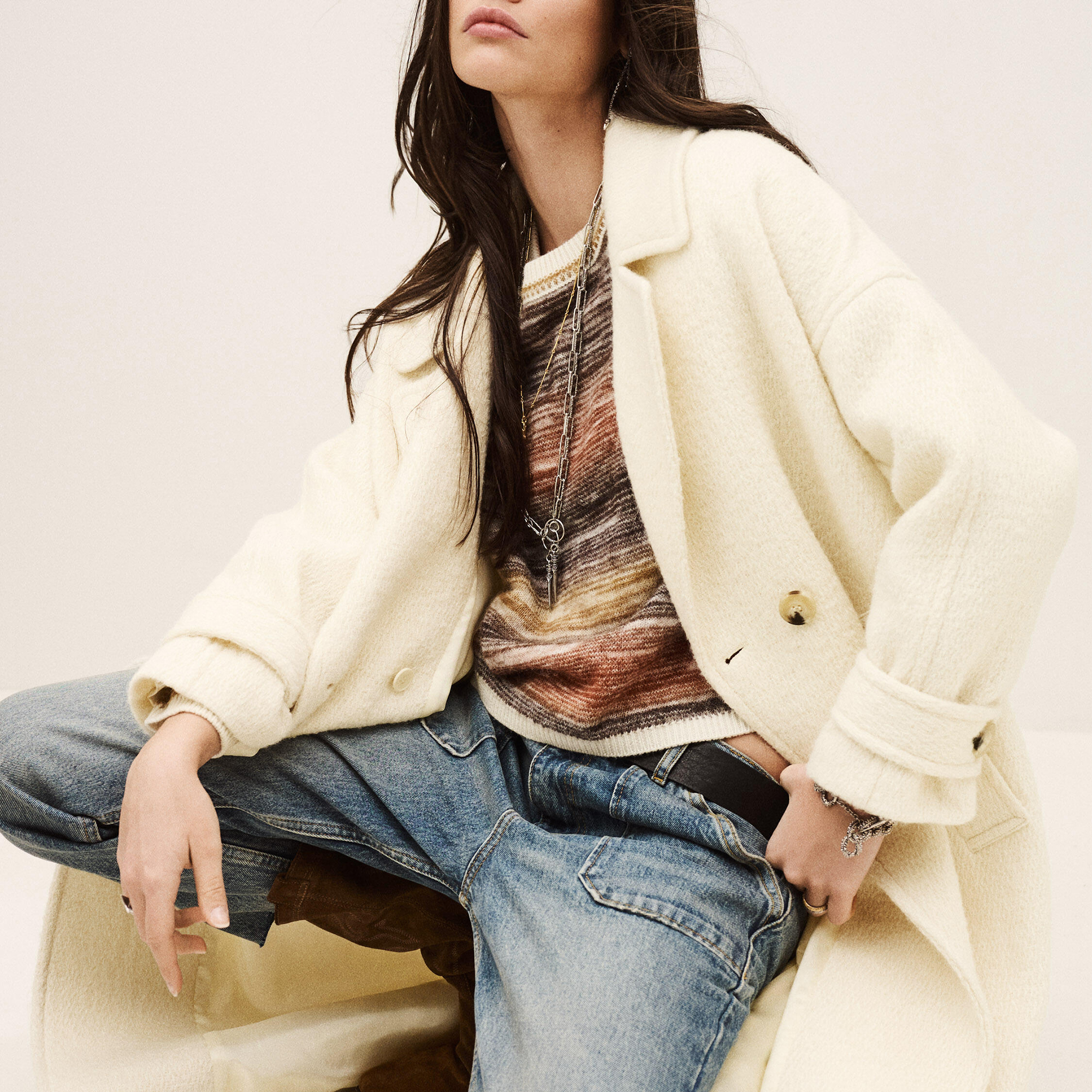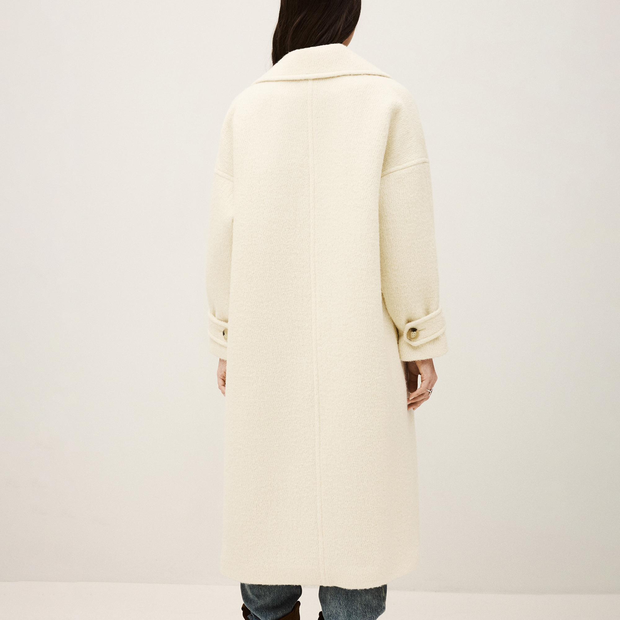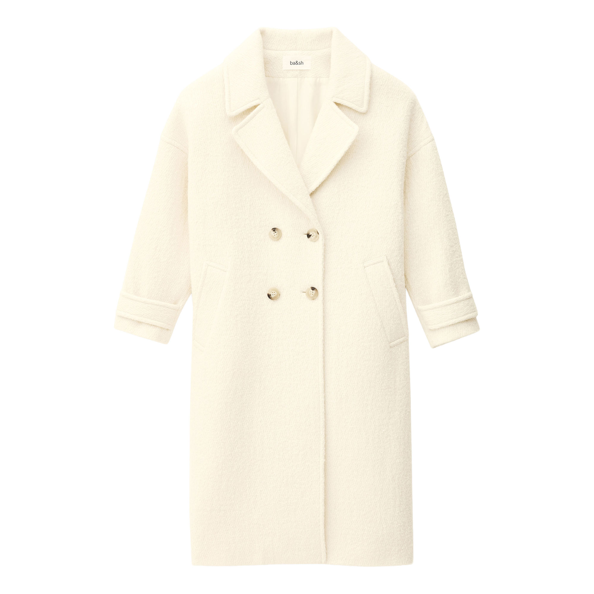 - Tailored suit collar, double-breasted front, raglan pocket detailing, buttoned cuff placket, longline design