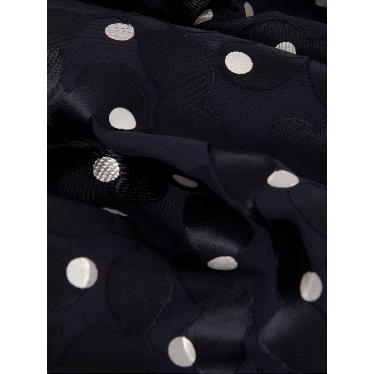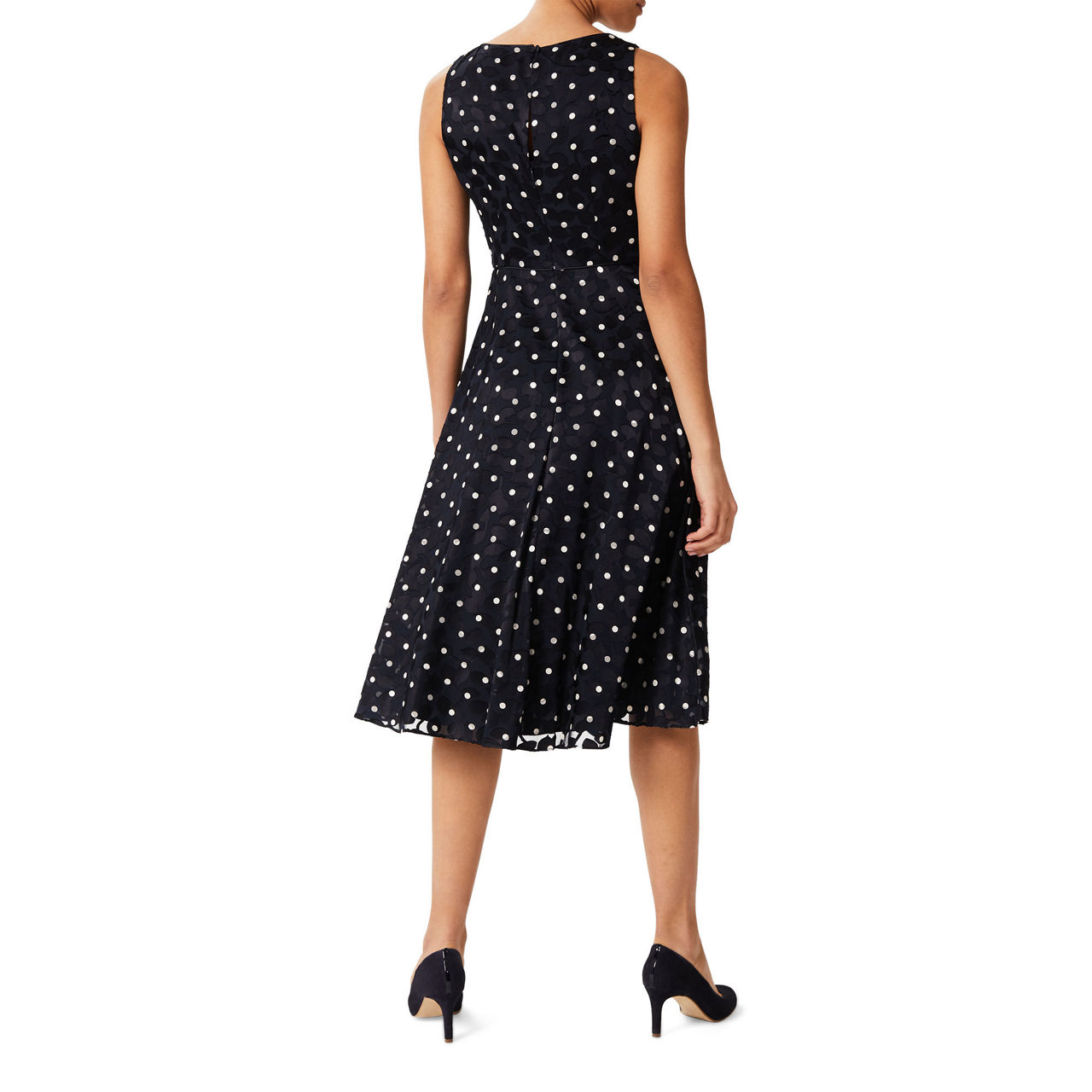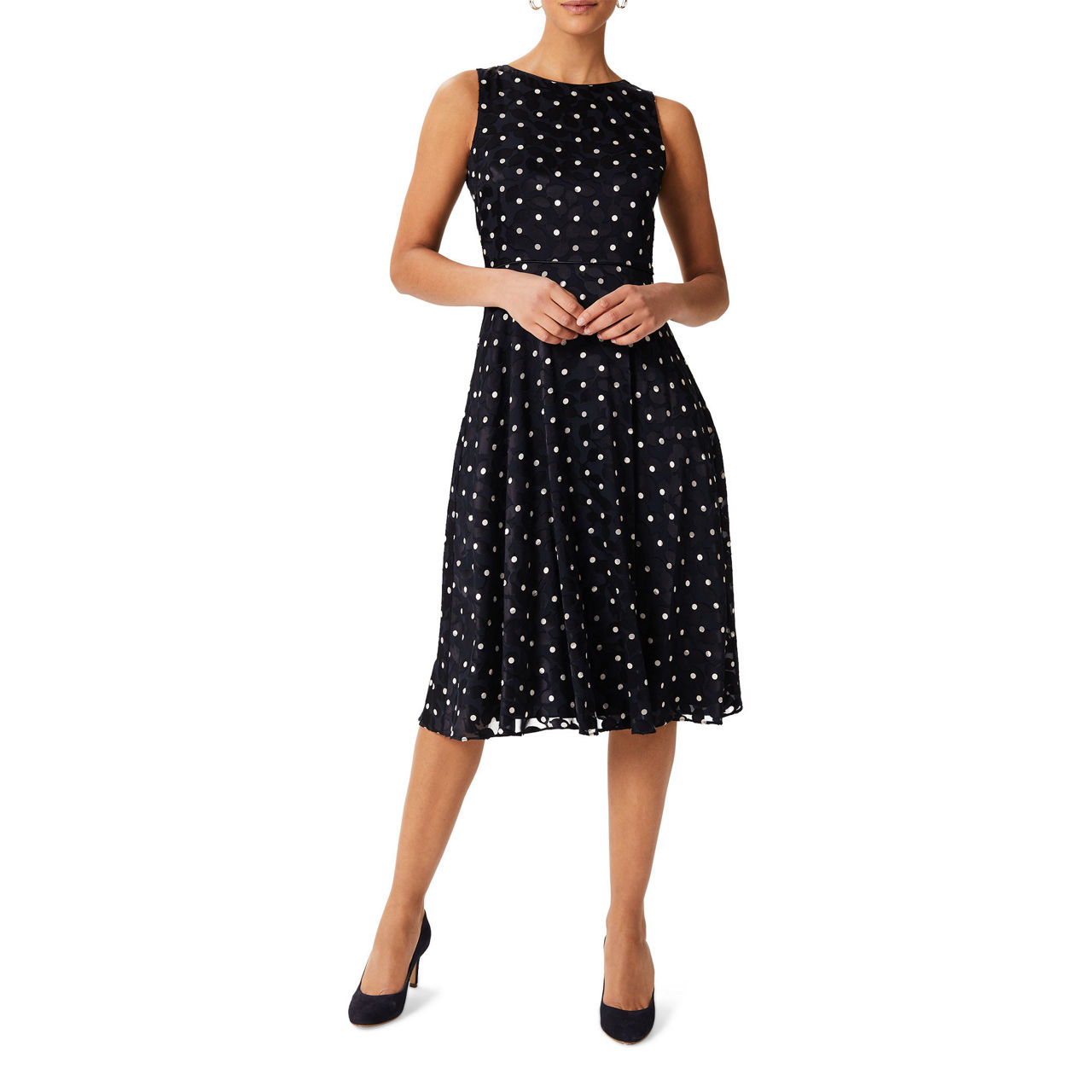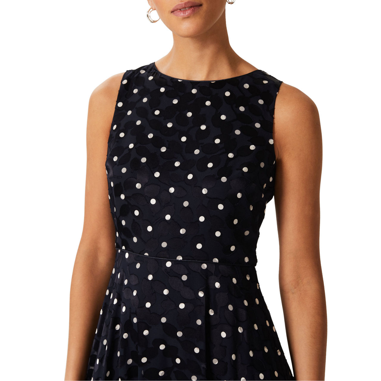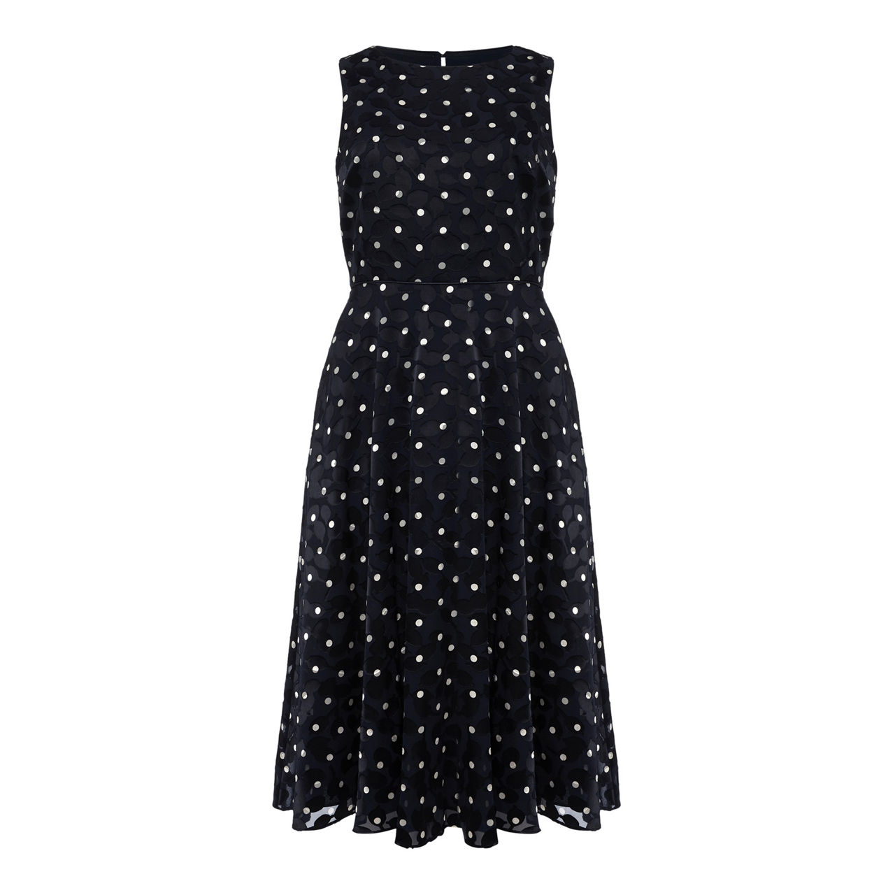 - Sleeveless, round neck, semi-sheer jacquard overlay, knee length, zip fastening, polka dot print.