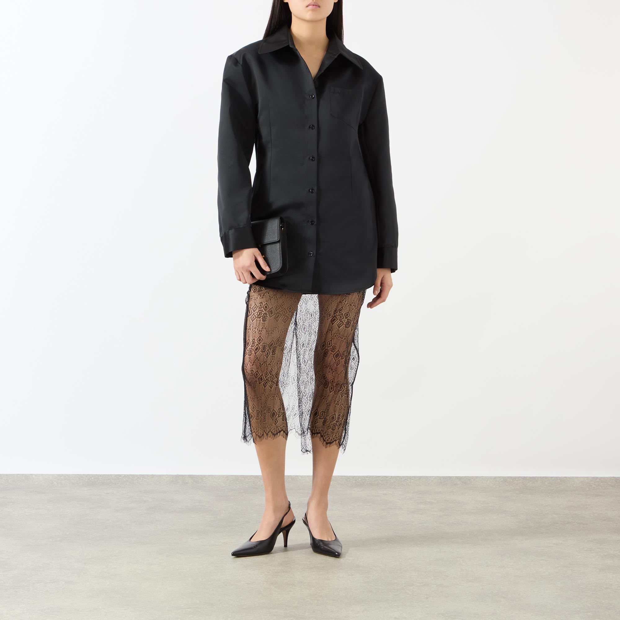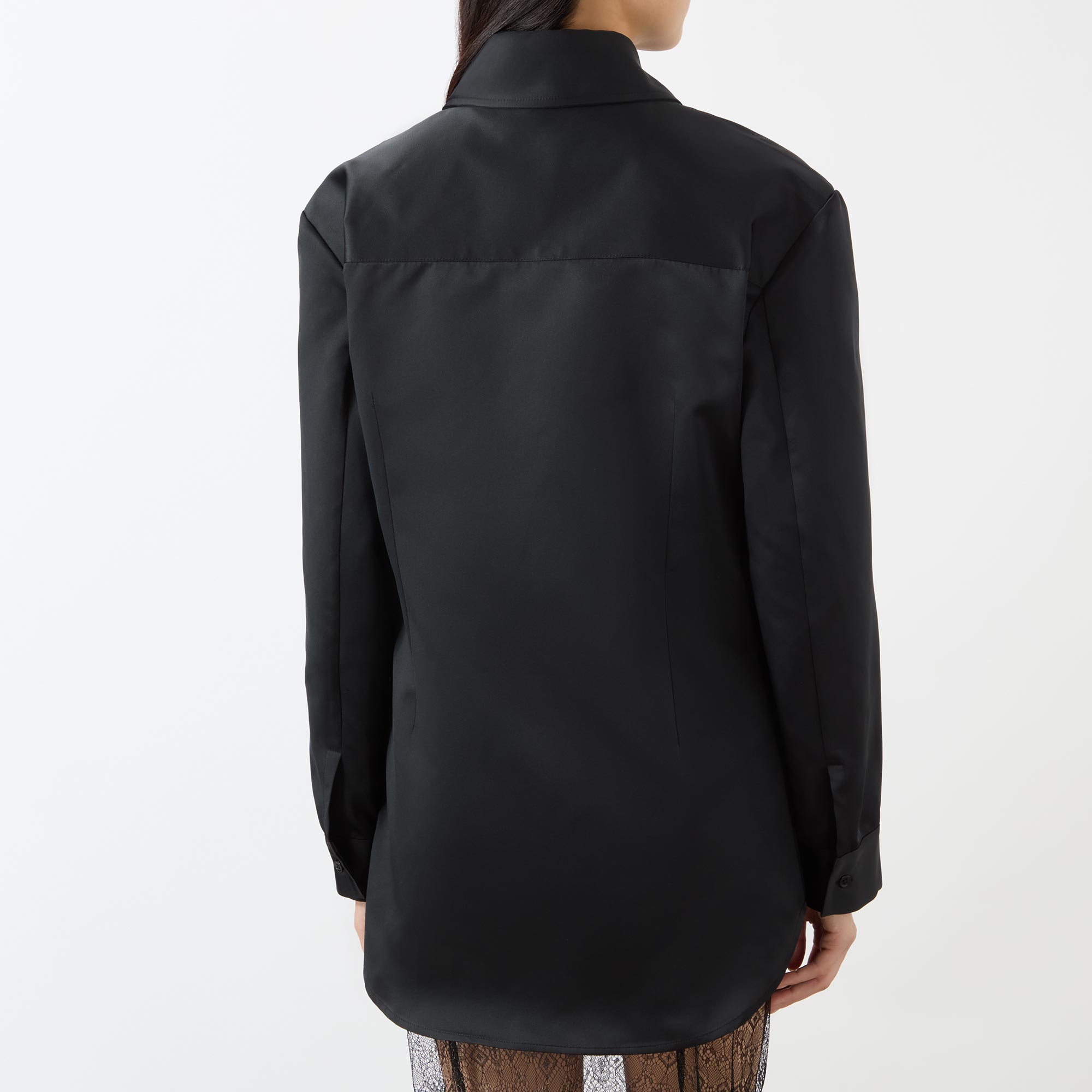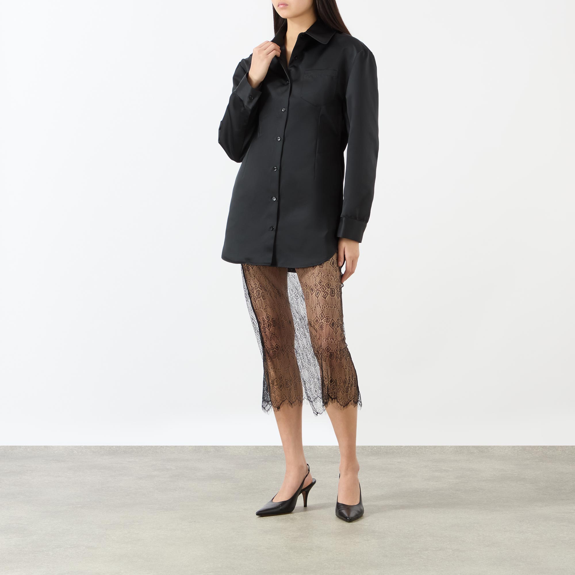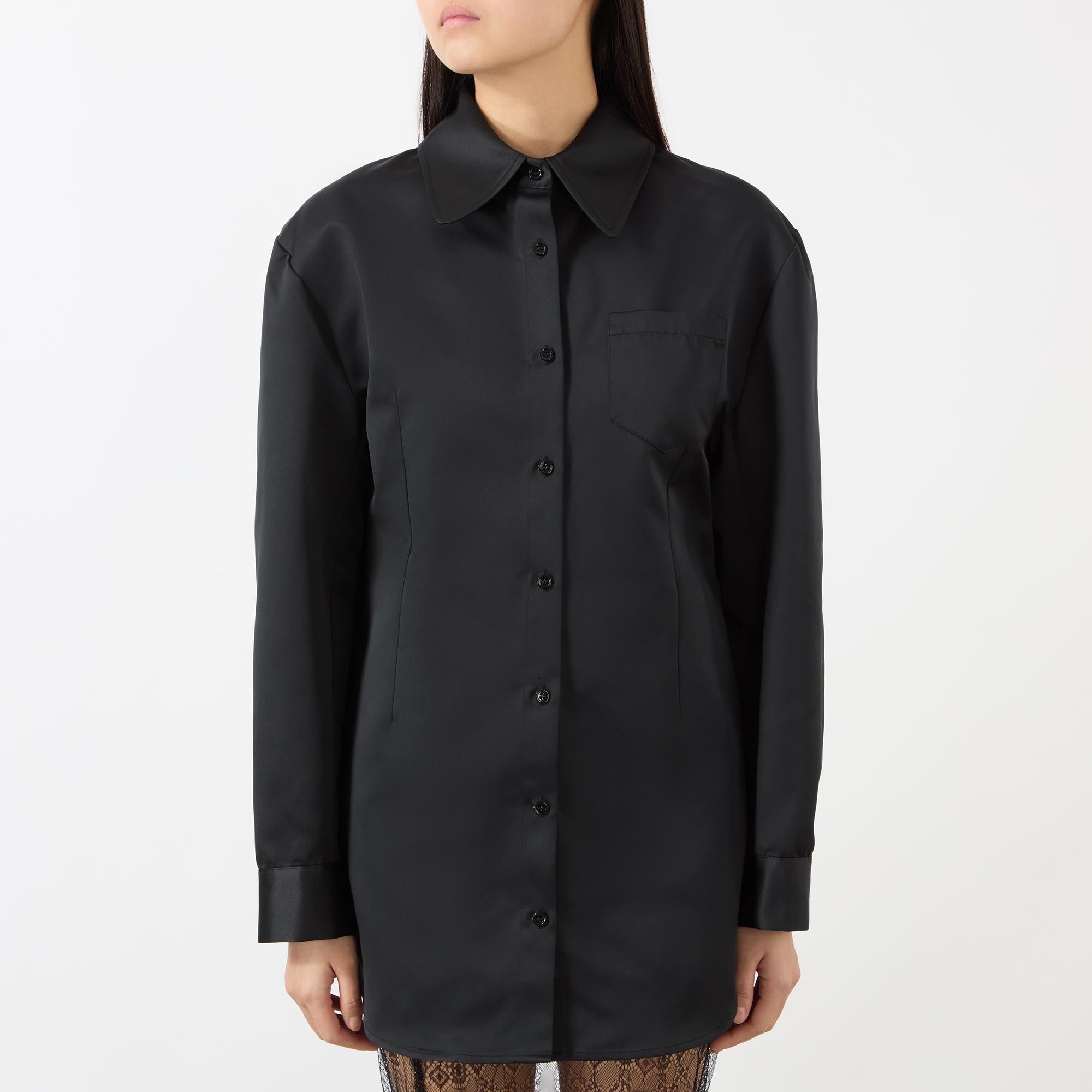 - Point collar, long sleeves, dropped shoulders, front button fastenings, chest patch pocket, darting to the front, single-button cuffs, curved hemline, mini length, smooth fabric
