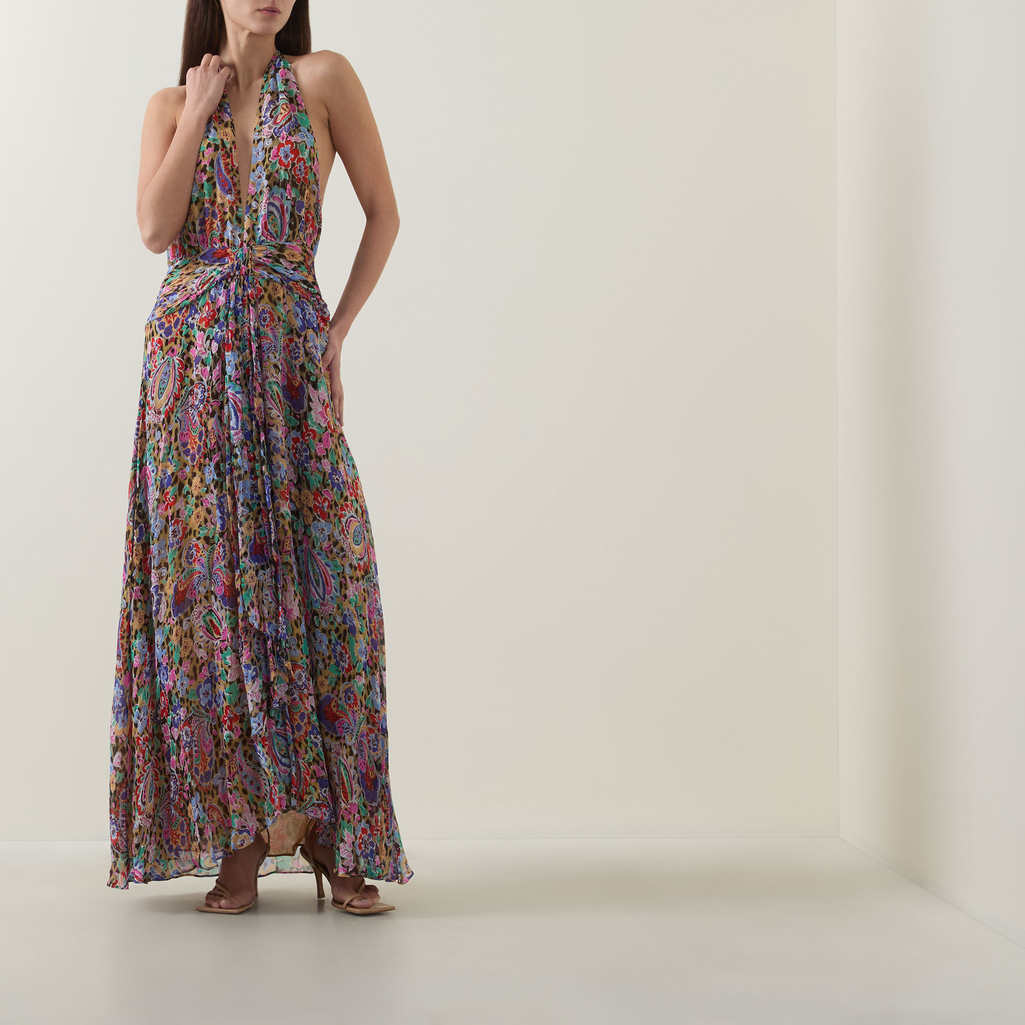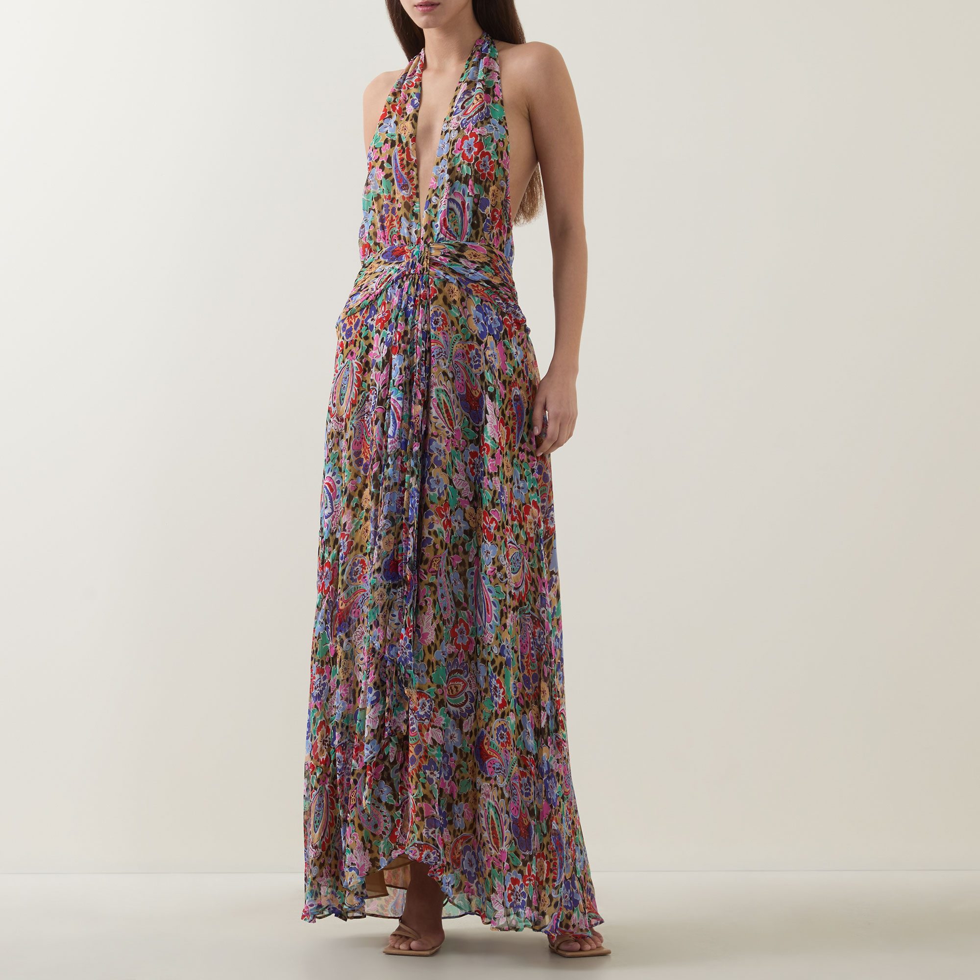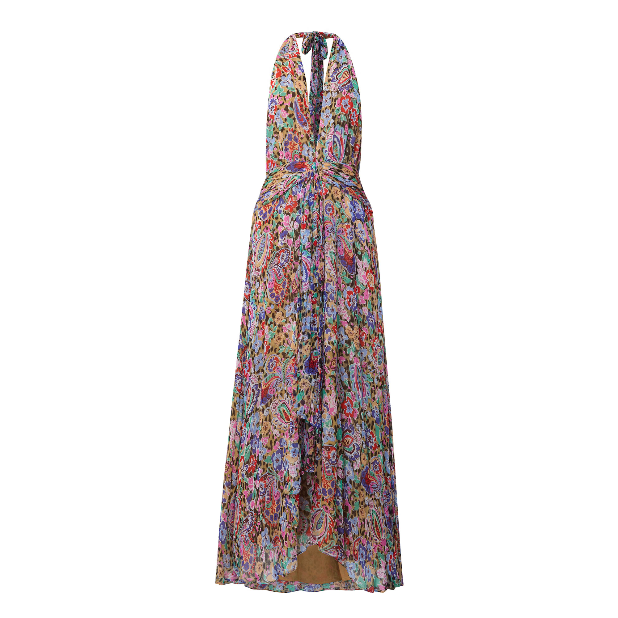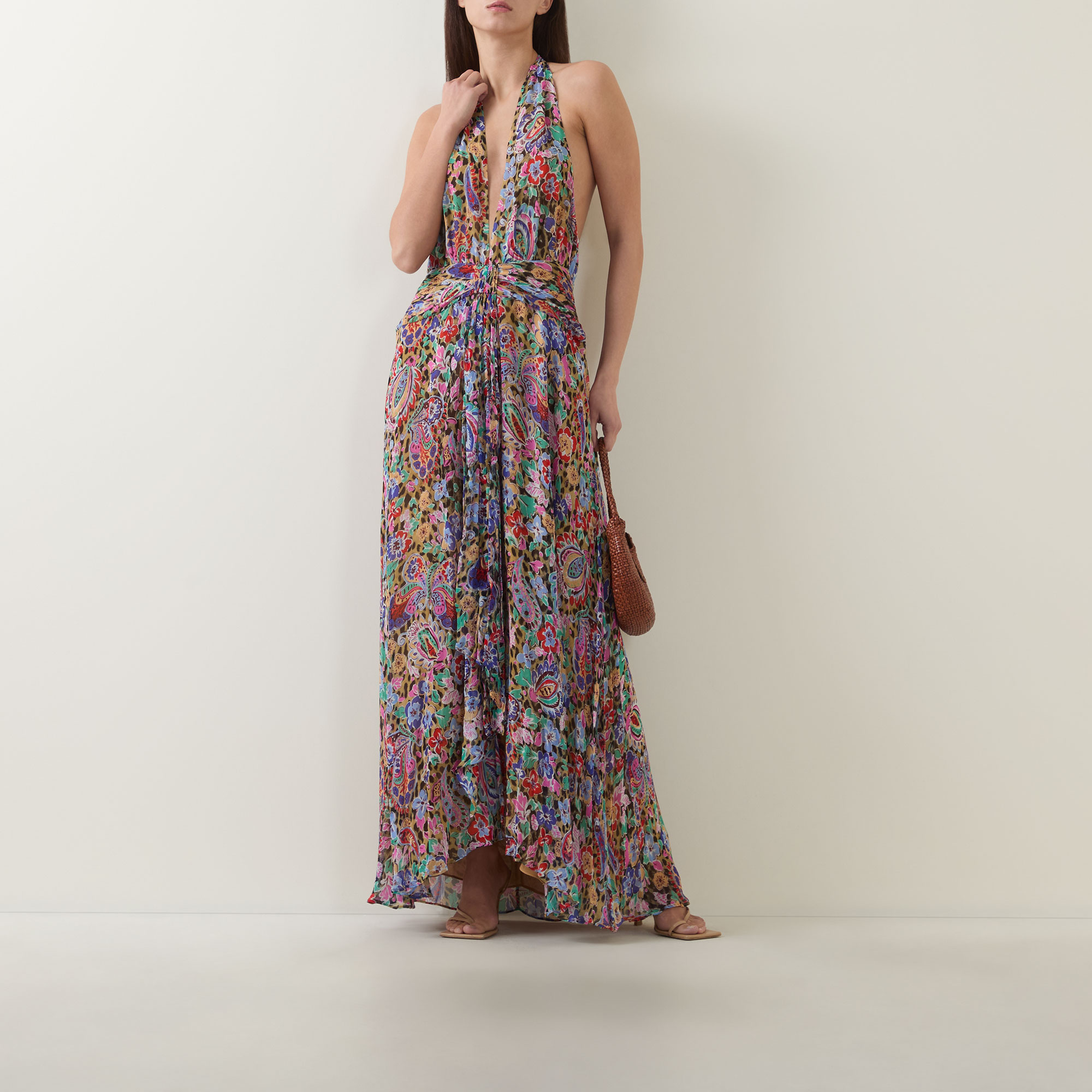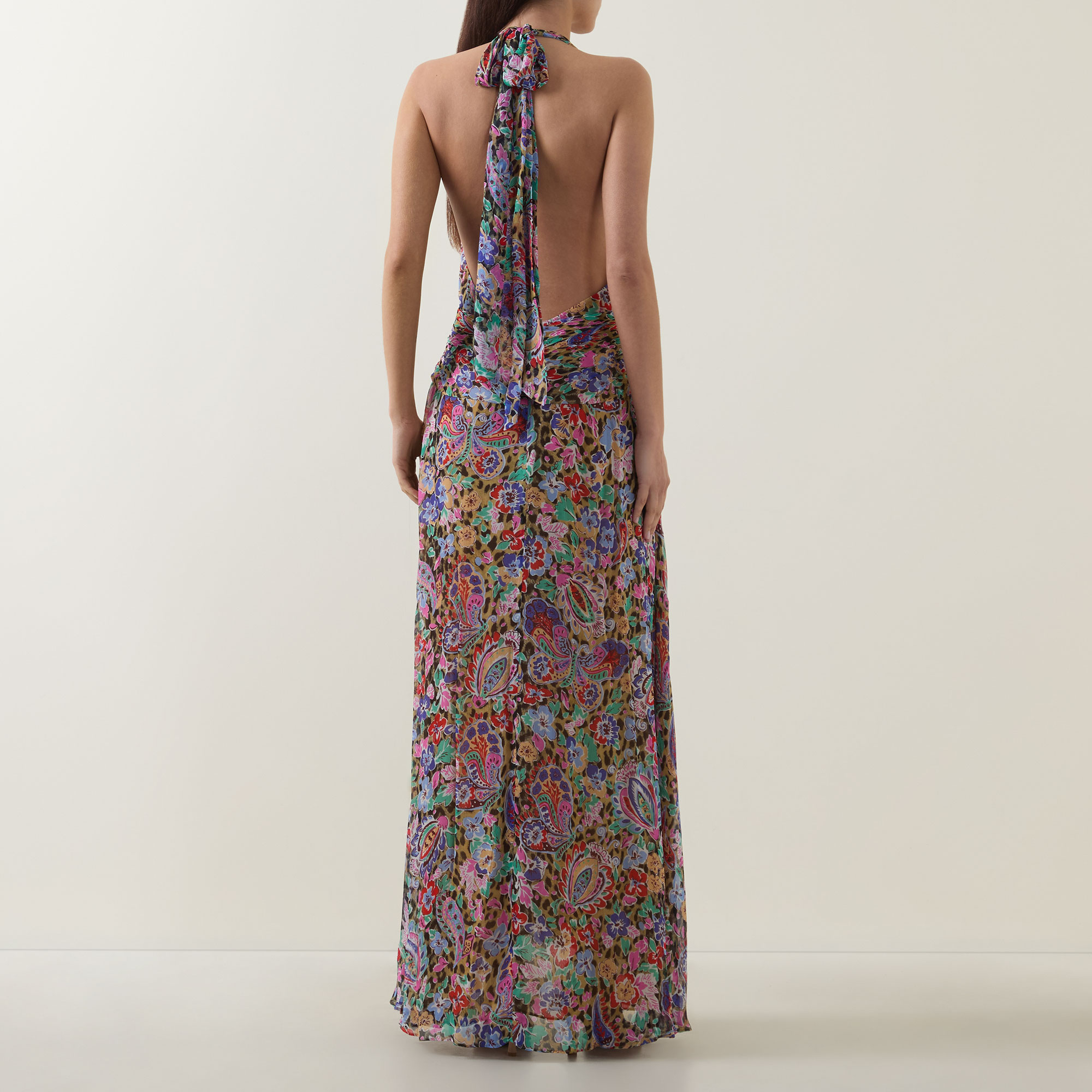 - Deep V-neckline, sleeveless, maxi length, fitted at the waist, slit at skirt, adjustable neck tie fastening, concealed zip fastening to the back, low back, fully lined, floral and leopard pattern