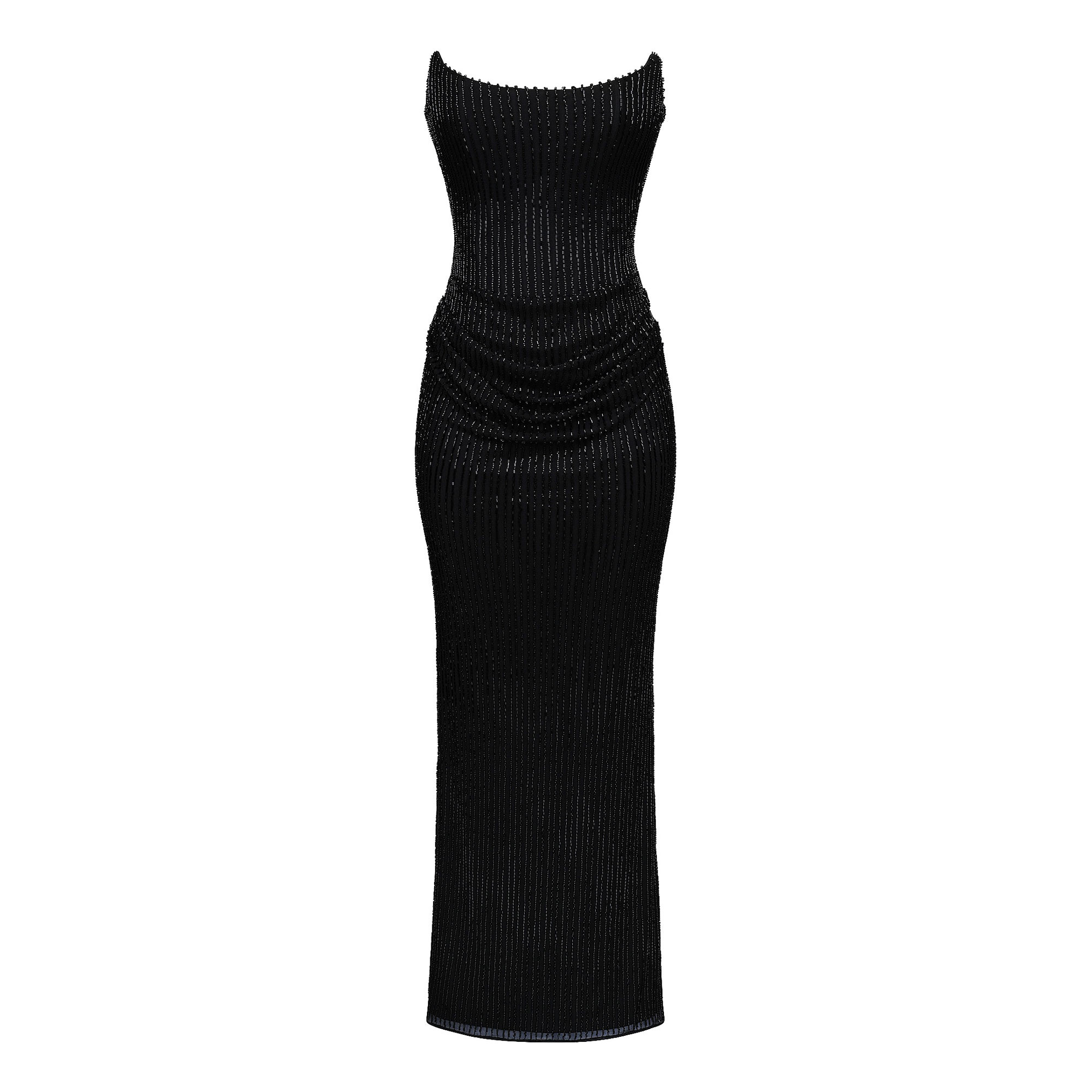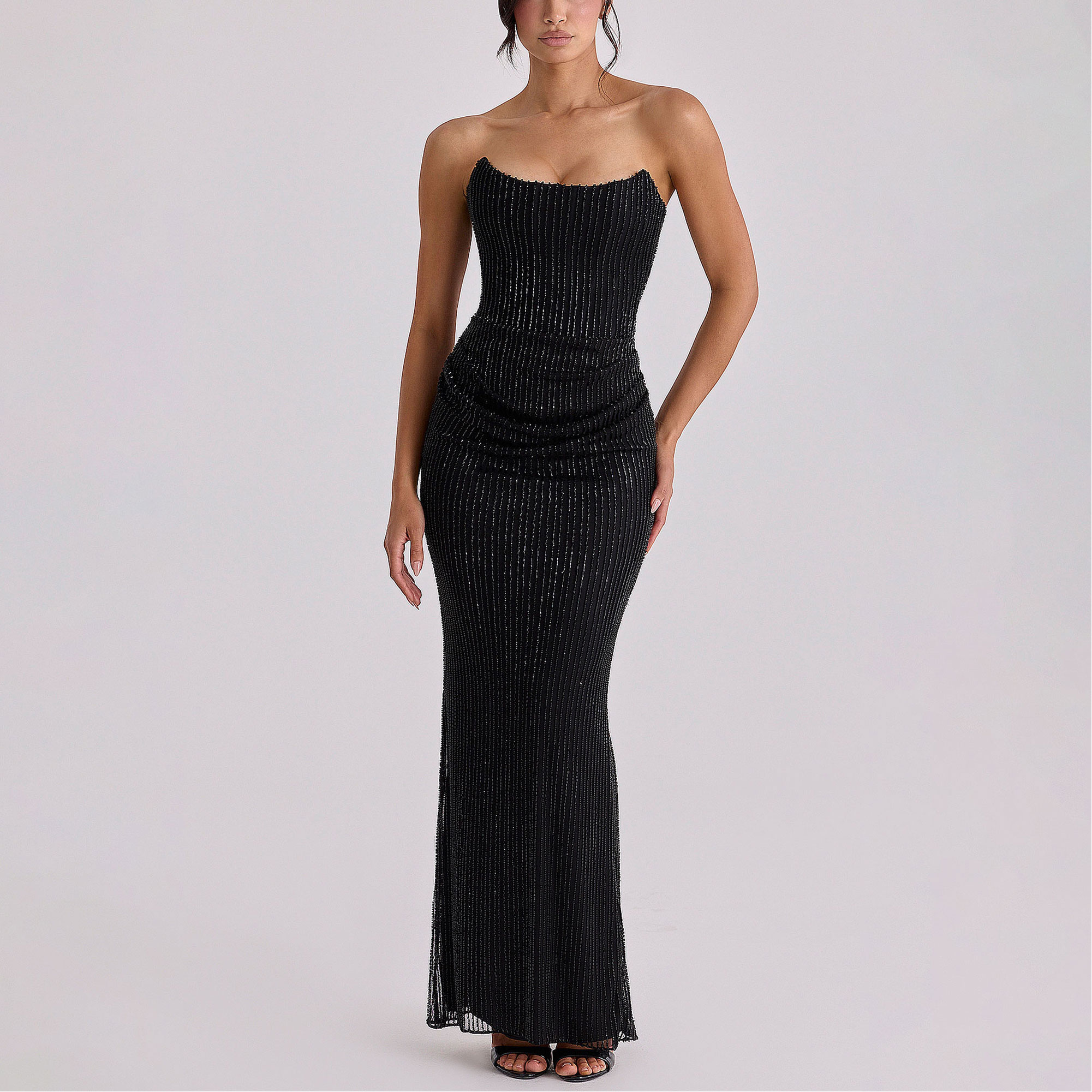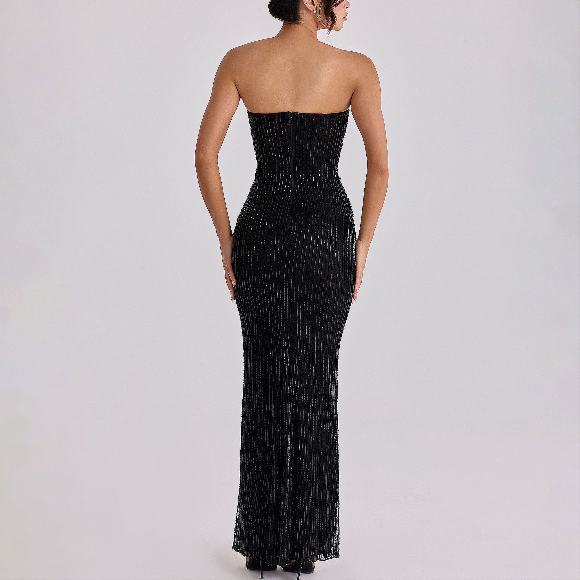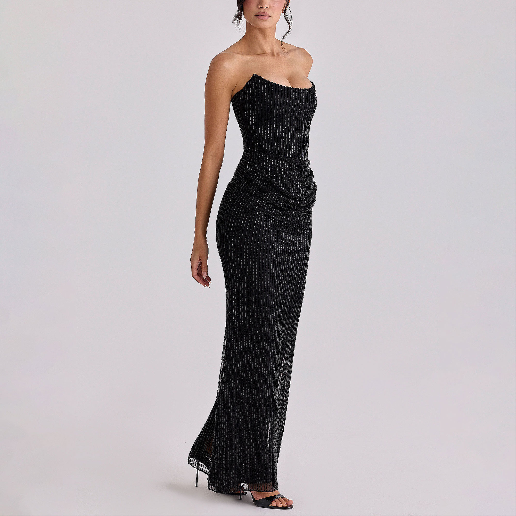 - Draping, hand-beaded embellishment, strapless, boned corset, zip fastening
