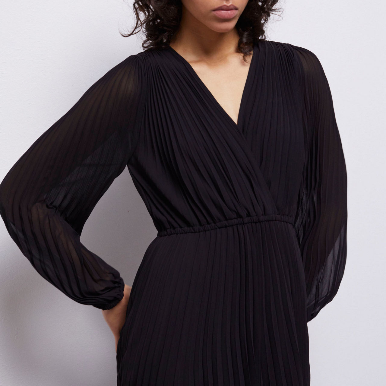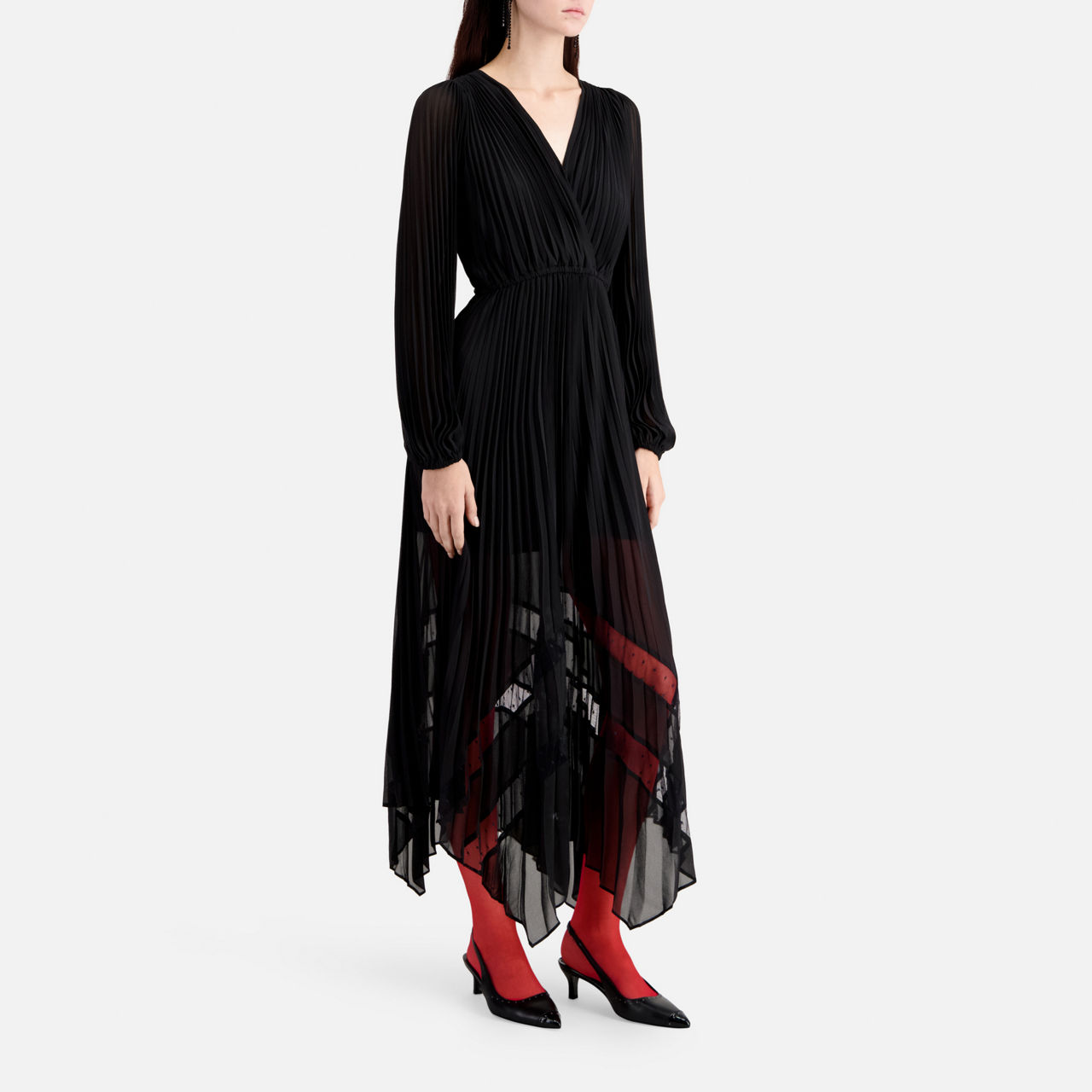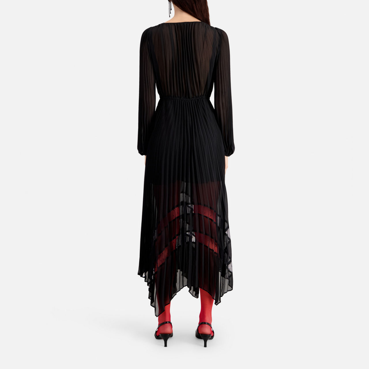 - Sun pleats, long sleeves, crossed V-neckline, adjusted elastic waist, elasticated cuffs, asymmetric flared skirt with lace details