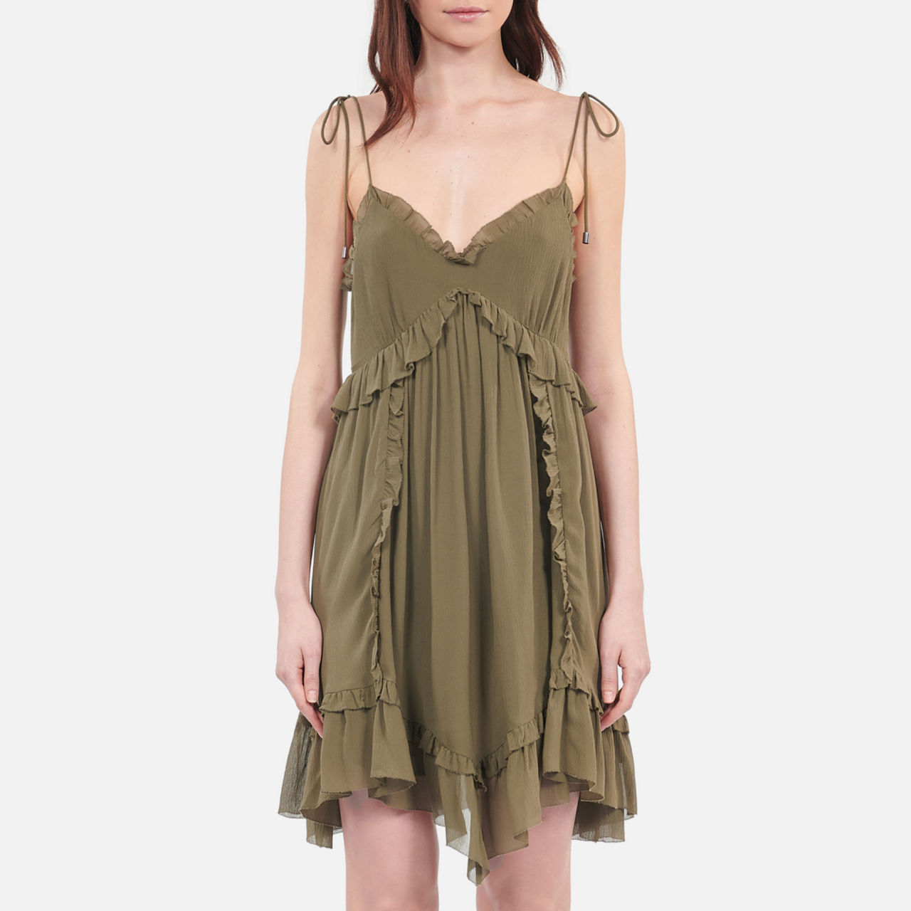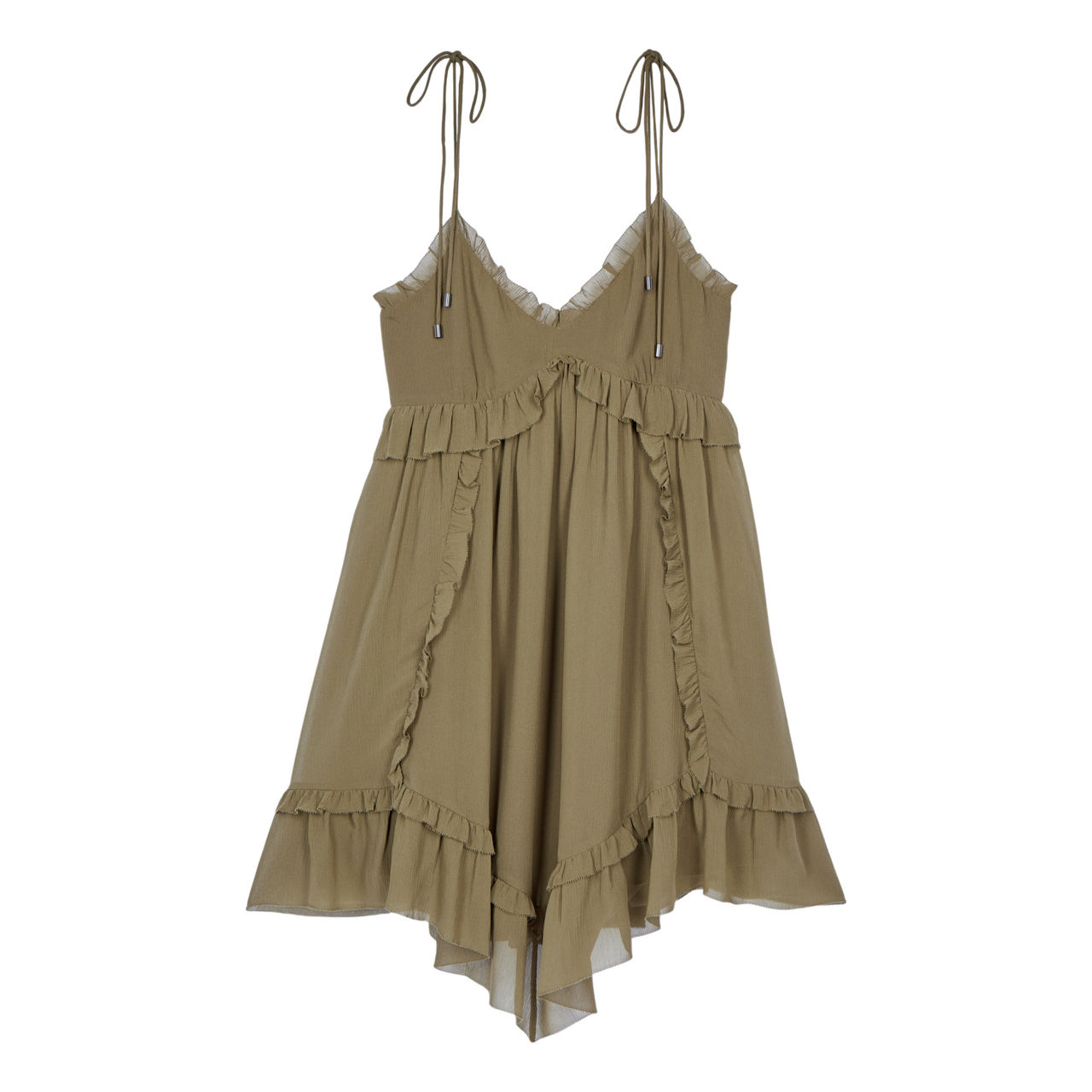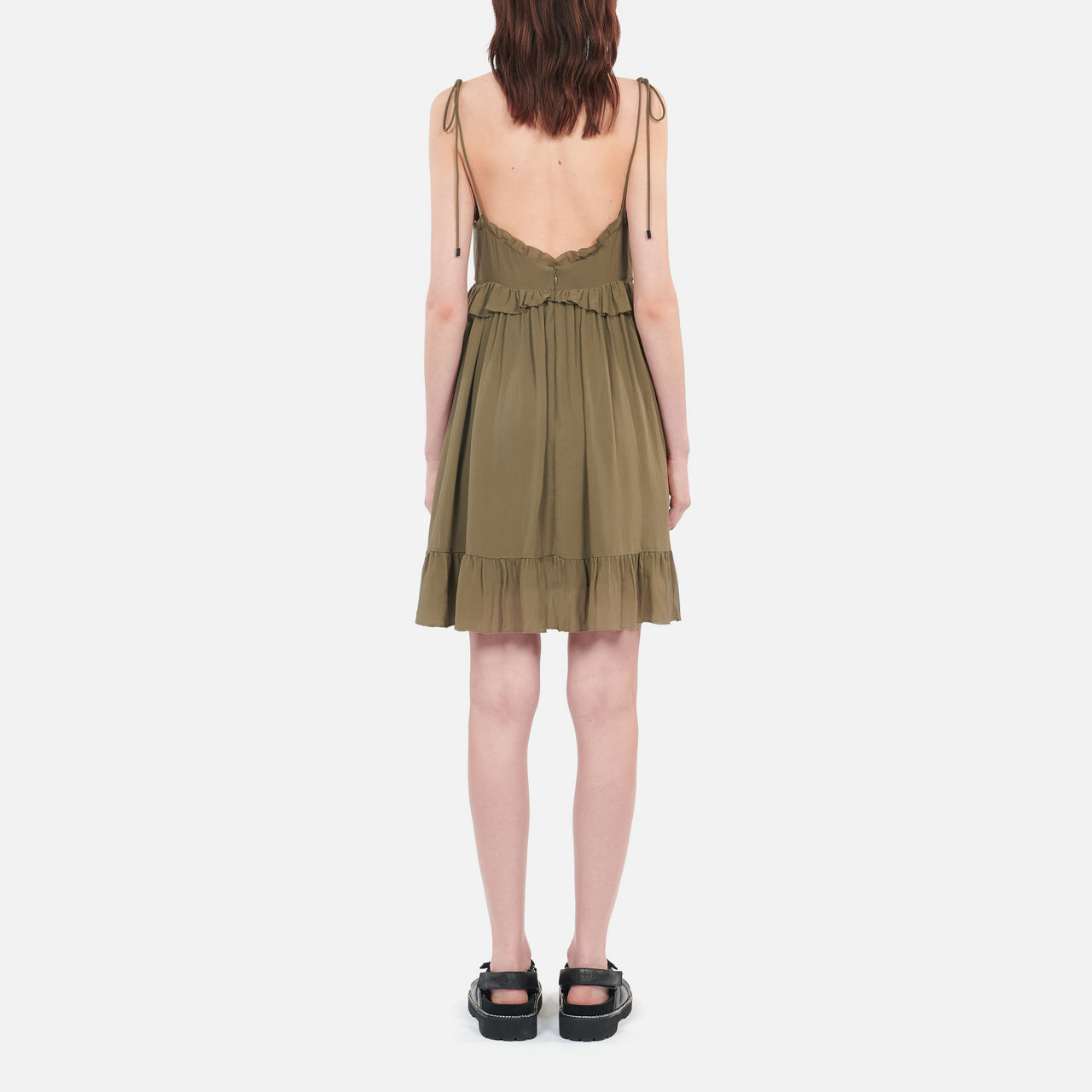 - Mini length, sleeveless, silk fabric, thin adjustable tie straps, empire fitted waist, ruffle trim, V-neckline, asymmetric hem, low back, lined