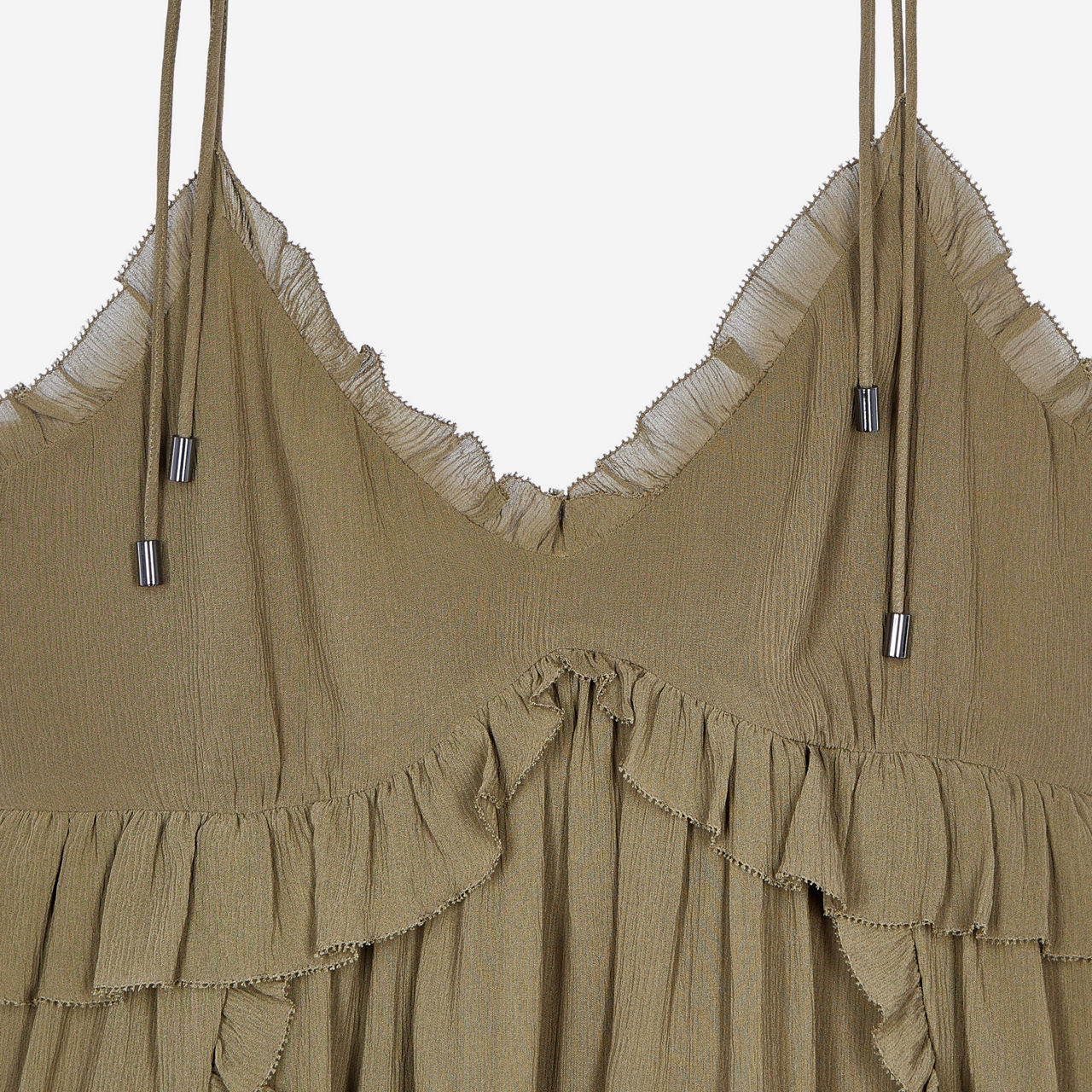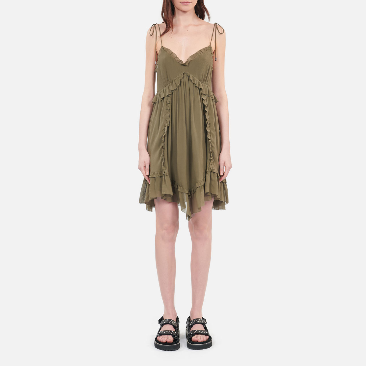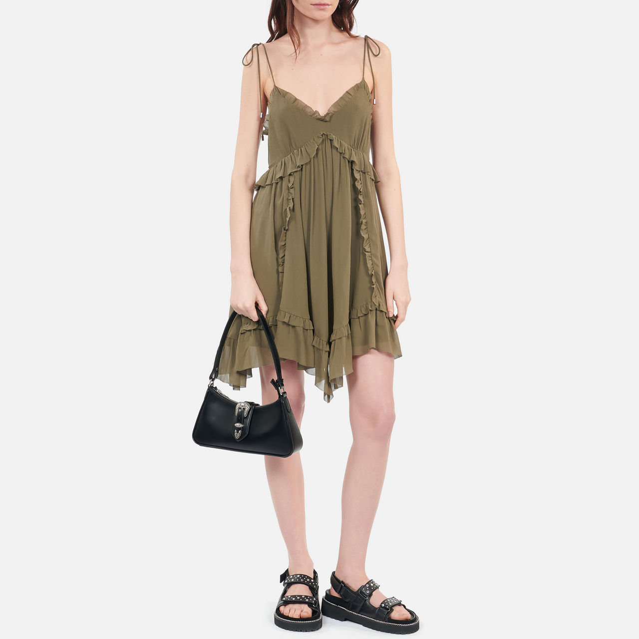 - Mini length, sleeveless, silk fabric, thin adjustable tie straps, empire fitted waist, ruffle trim, V-neckline, asymmetric hem, low back, lined