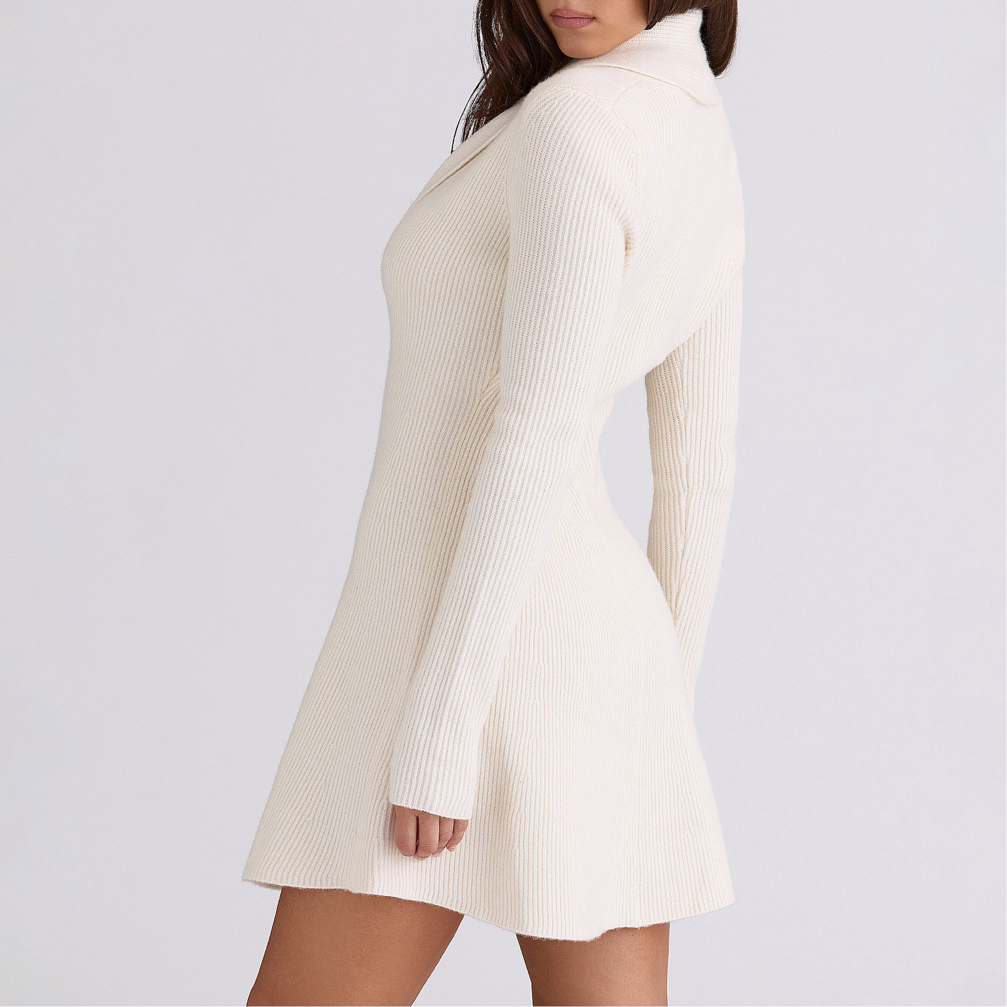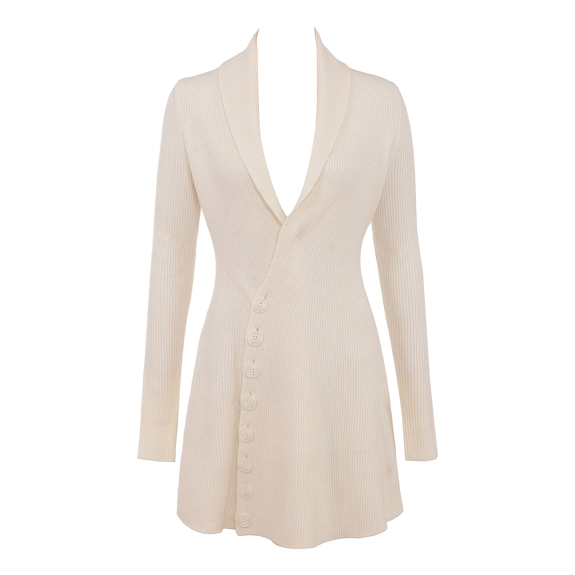 - Chunky ribbed contouring shape, asymmetric silhouette, long sleeves, draped collar neckline