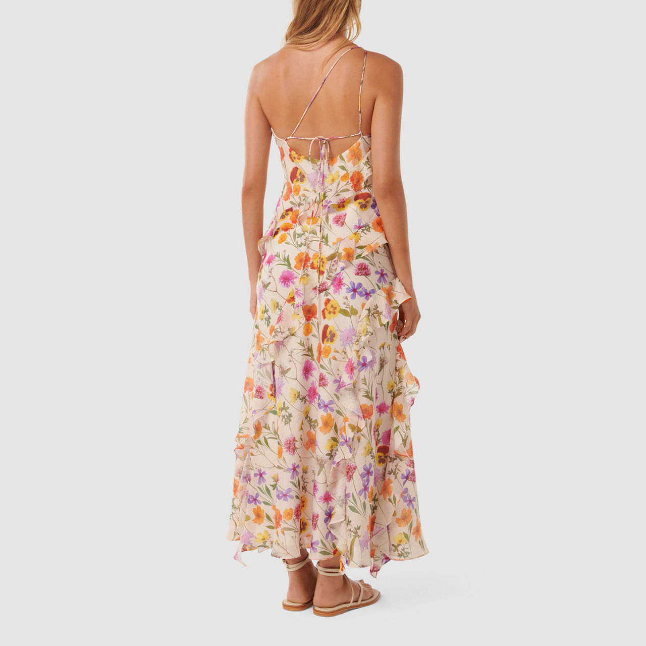- Fitted silhouette, asymmetrical neckline, sleeveless, one-shoulder design, ruffle detailing, floral print, midi length, low back with self-tie detail, lined