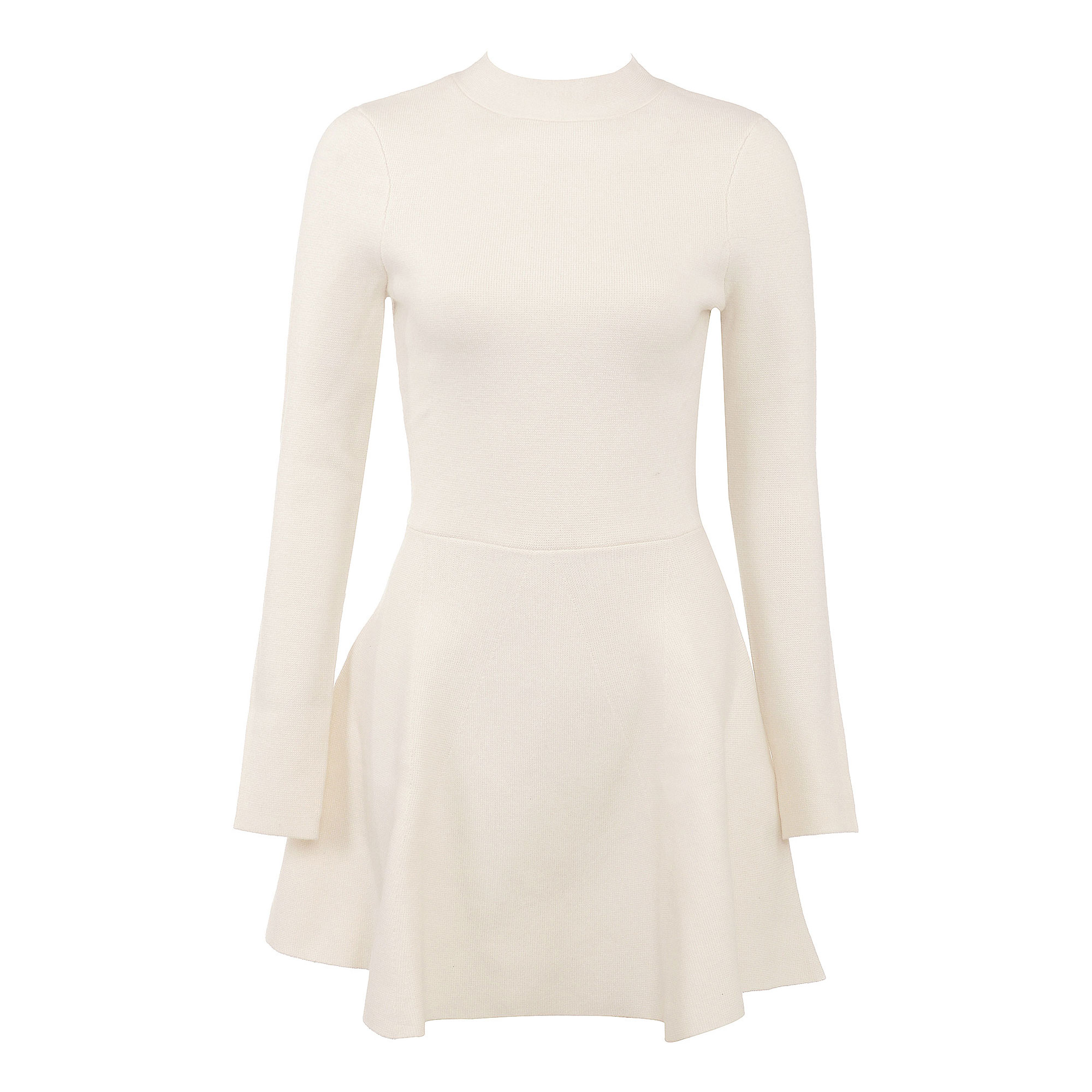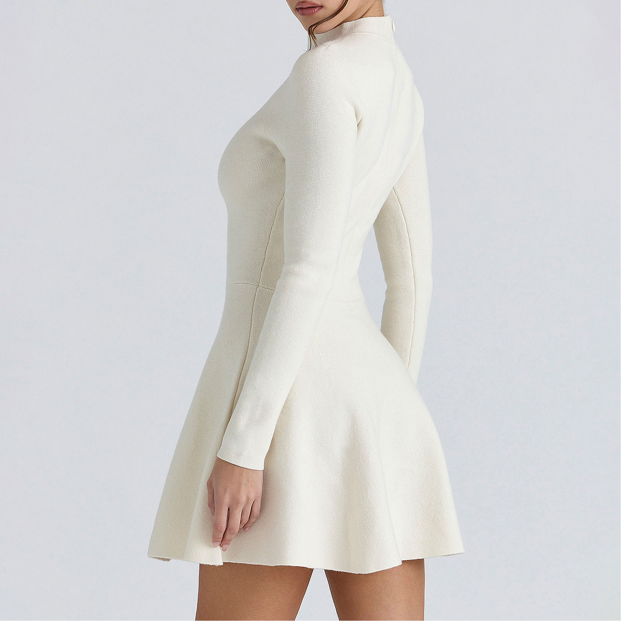 - Mini length, skater shape, long sleeves, high neck, smooth close fit, flared skirt, back zip, plenty of stretch