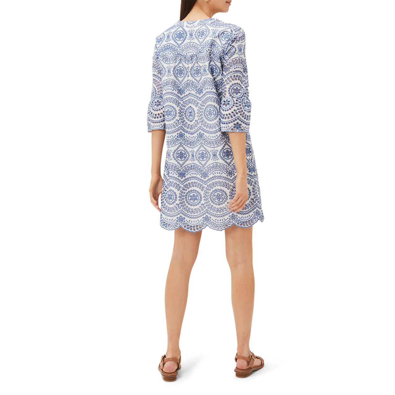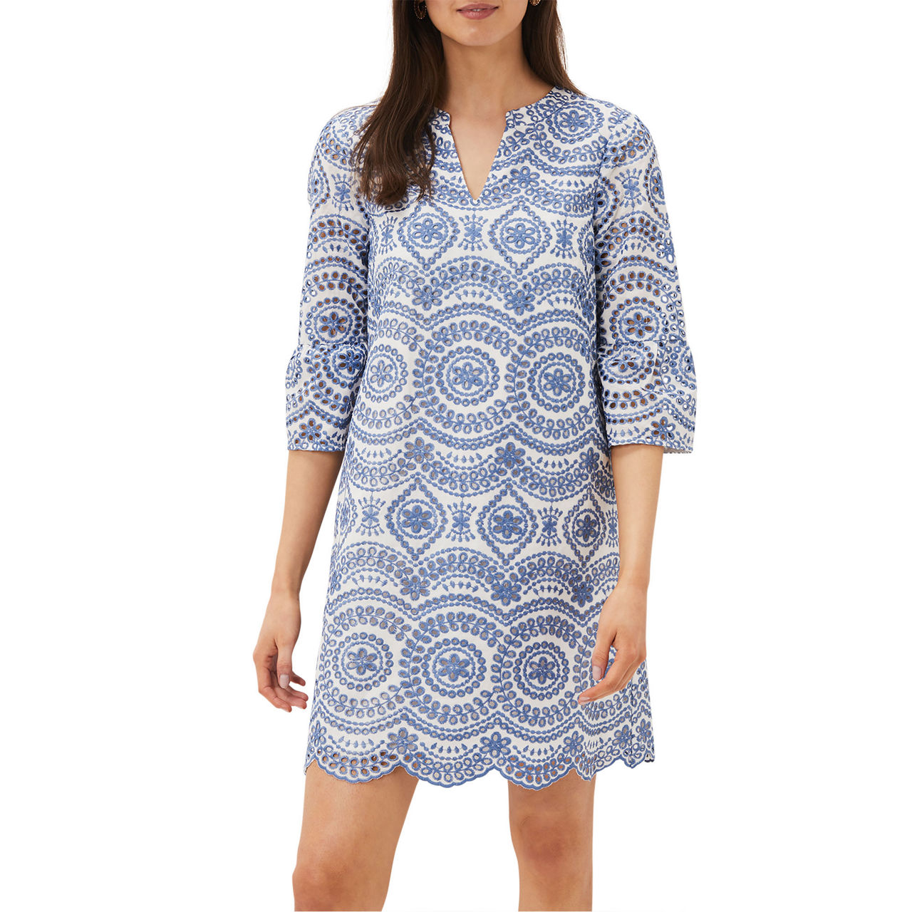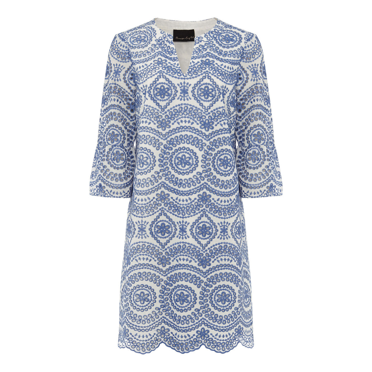 The perfect spring/summer dress. Crafted from a cool cotton blend, this dress from Phase Eight features delicate blue and white broderie detailing throughout. Designed in a shift silhouette, this style features a notched neckline, softly blouson half sleeves and a scalloped hem. You'll be wearing this style on repeat in the sunshine with raffia accessories.