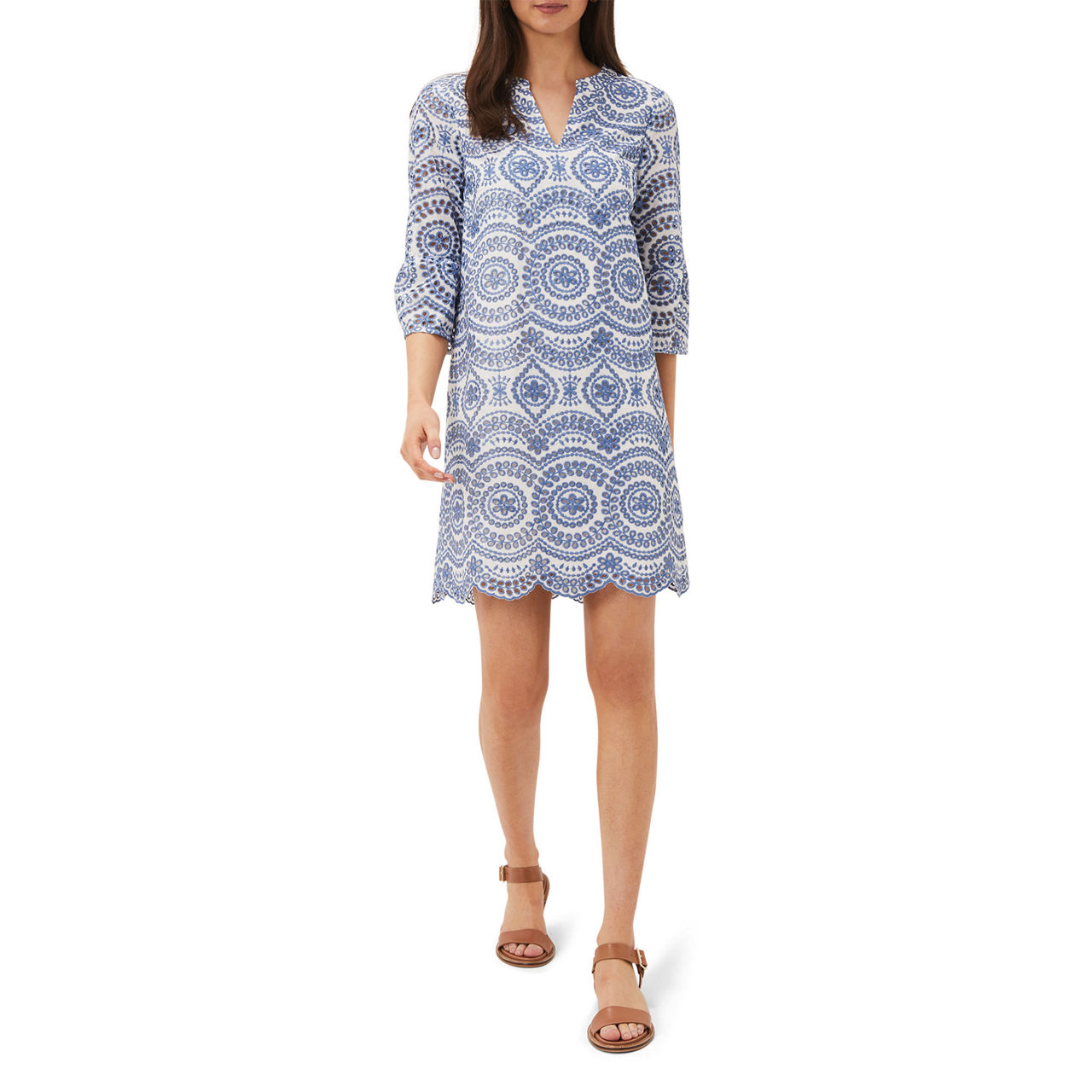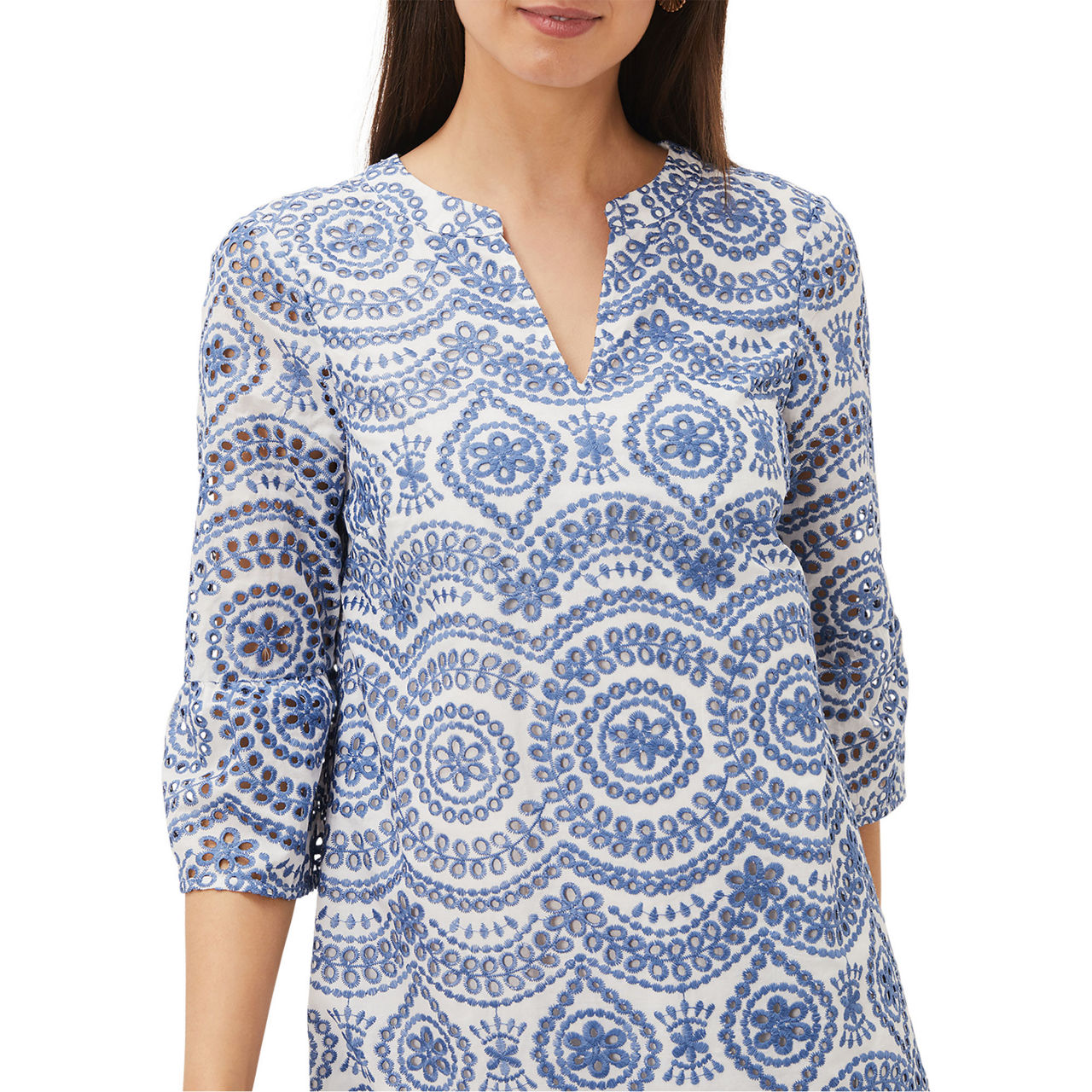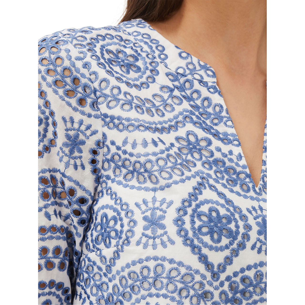The perfect spring/summer dress. Crafted from a cool cotton blend, this dress from Phase Eight features delicate blue and white broderie detailing throughout. Designed in a shift silhouette, this style features a notched neckline, softly blouson half sleeves and a scalloped hem. You'll be wearing this style on repeat in the sunshine with raffia accessories.