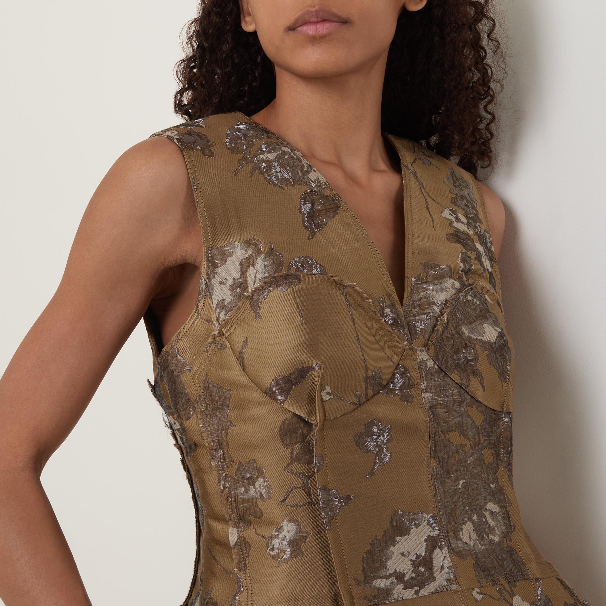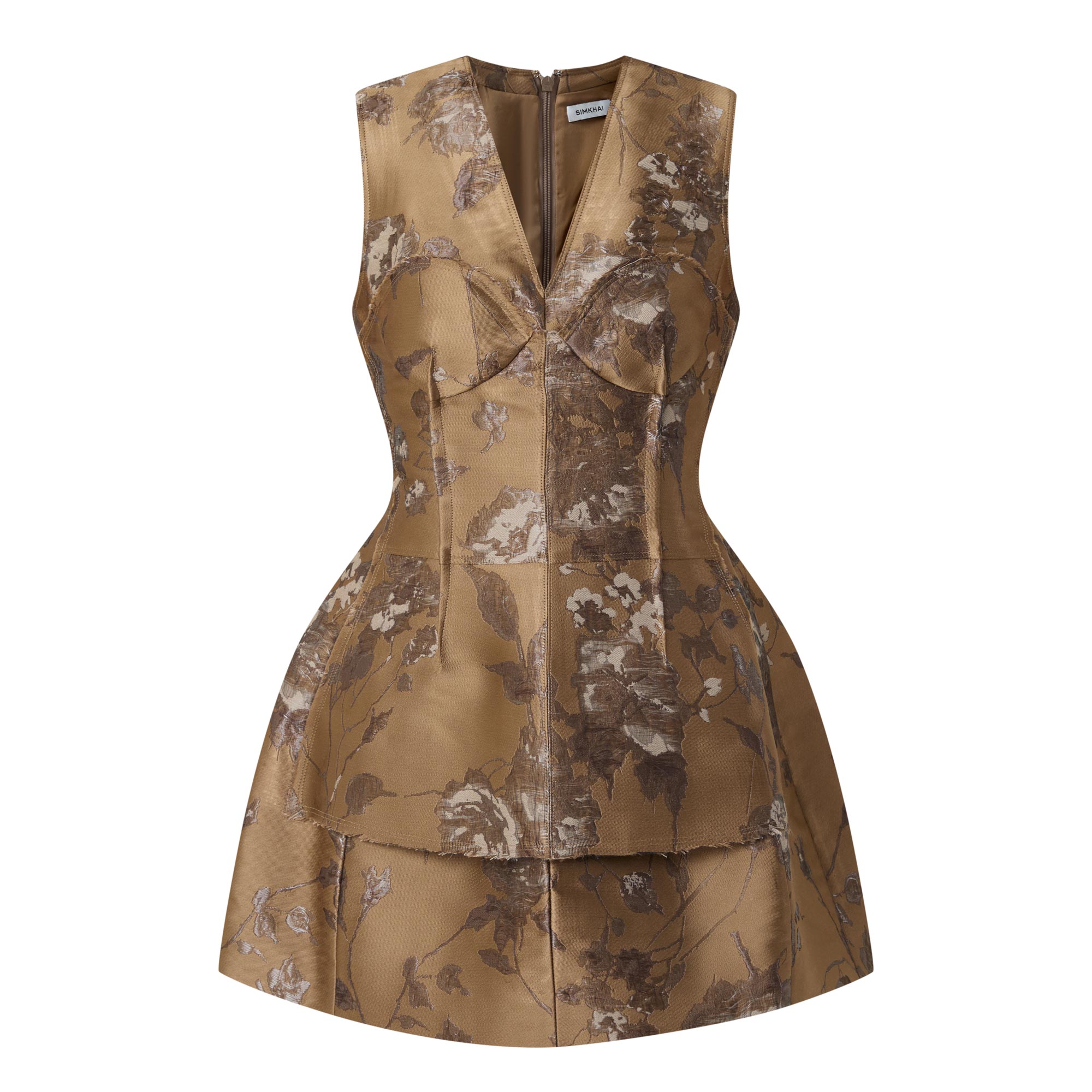 - V-neckline, seamed bust, mini length, sleeveless, voluminous skirt, jacquard fabric, fully lined, rear zip fastening, layered details