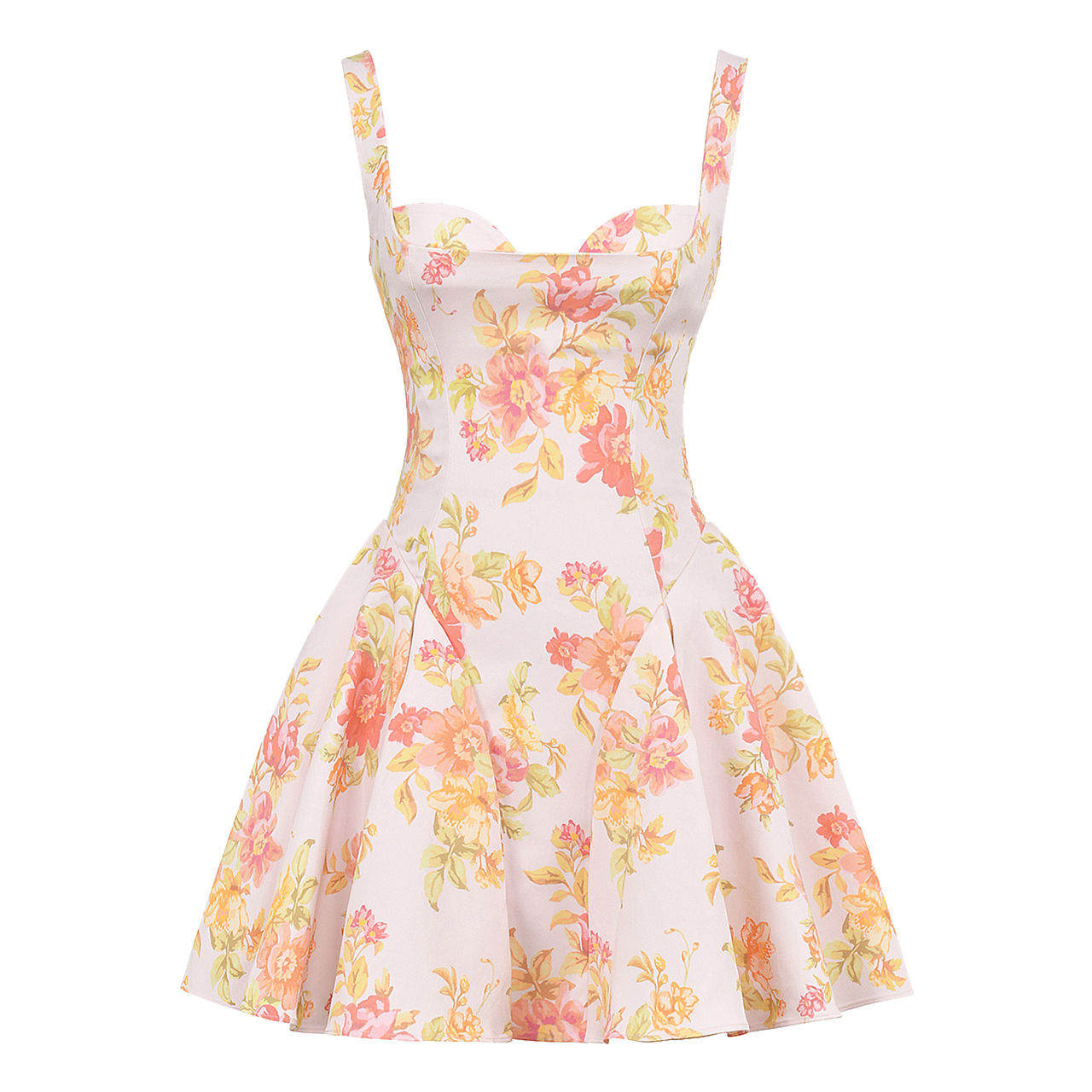 - Sleeveless, wide straps, sweetheart neckline, back zip-fastening closure, floral pattern, flared pleated hemline, mini length, smooth fabric