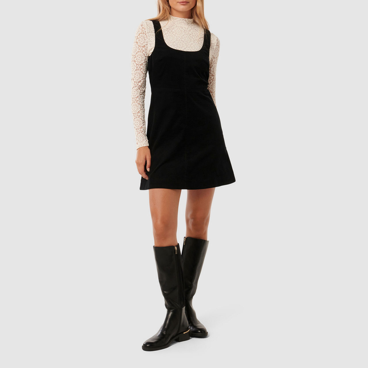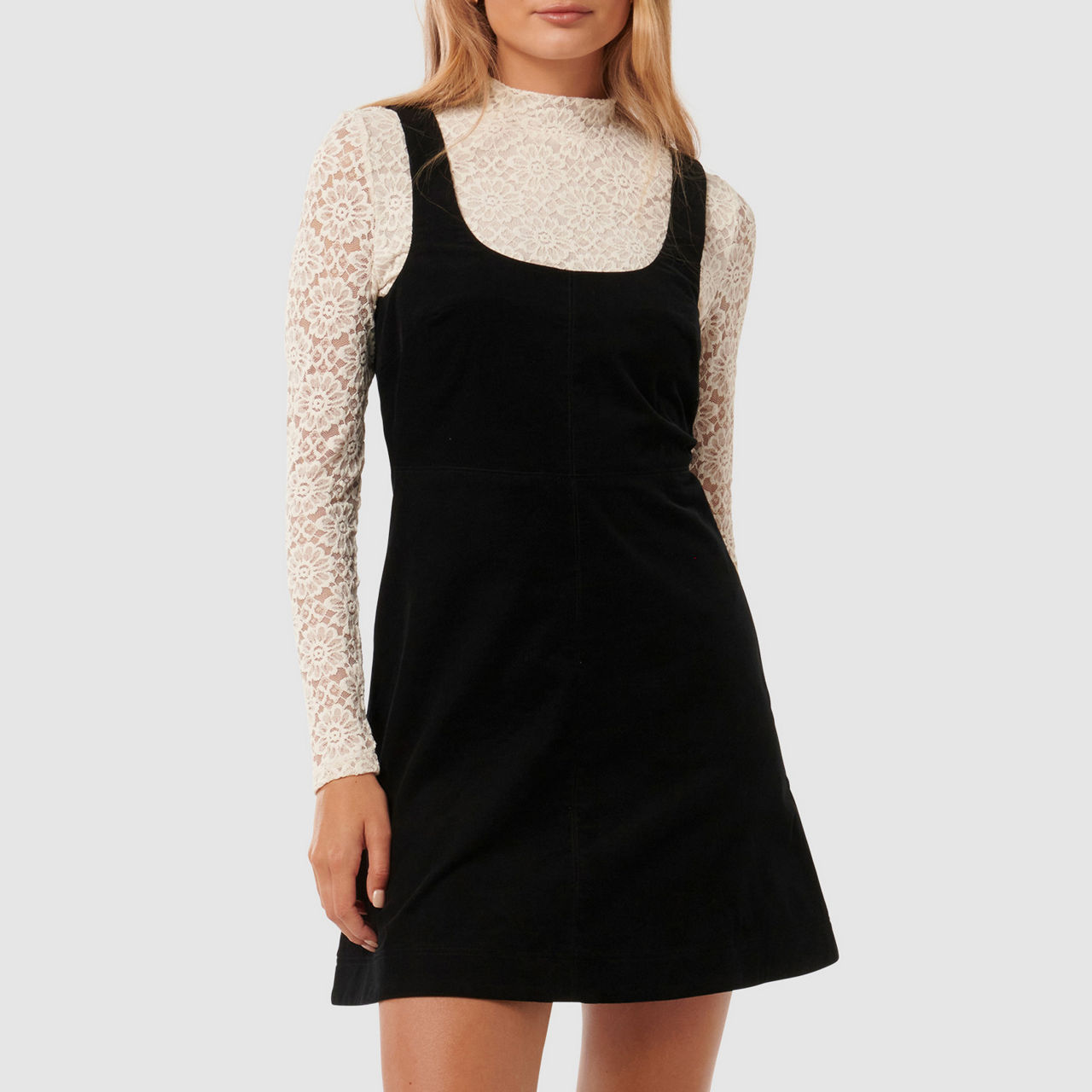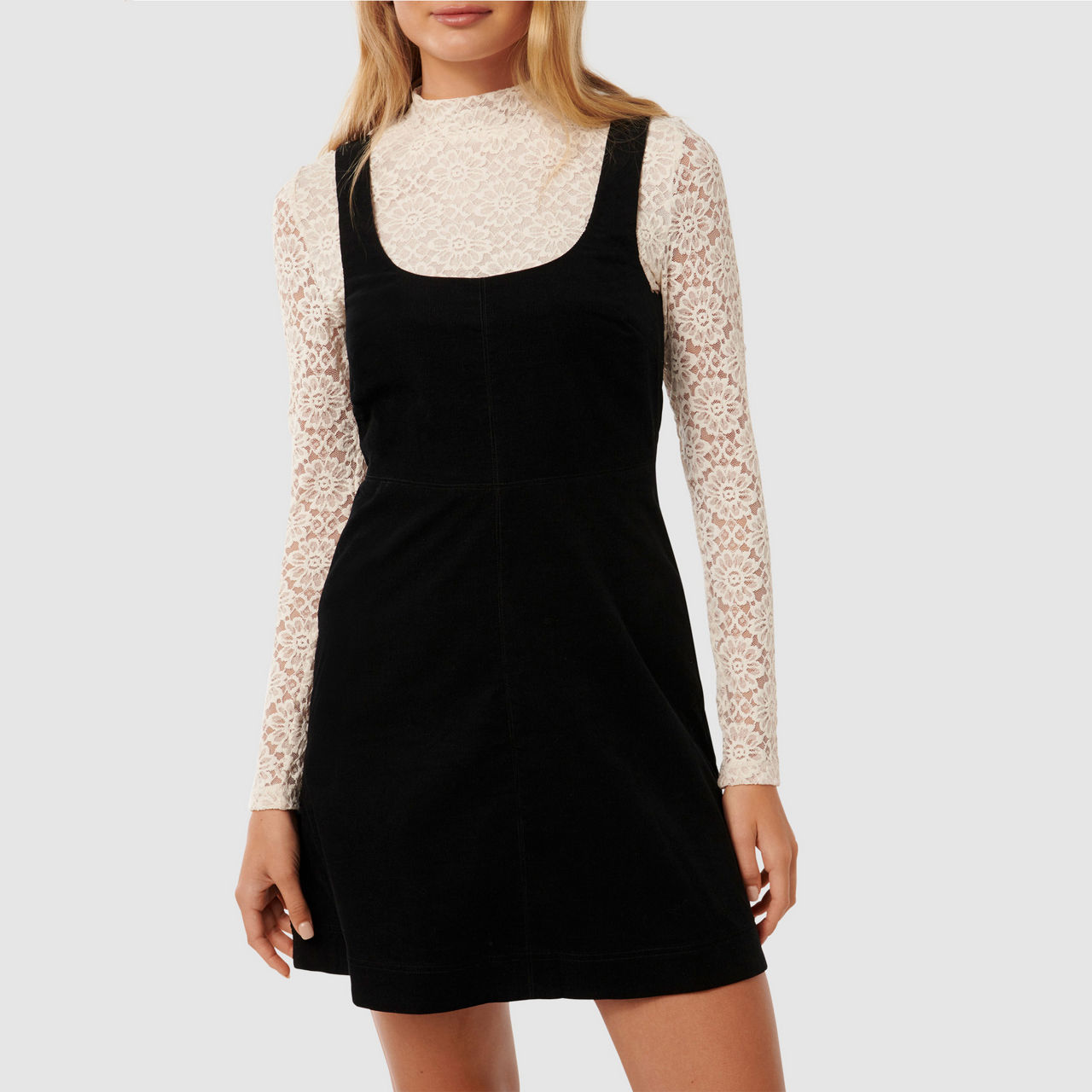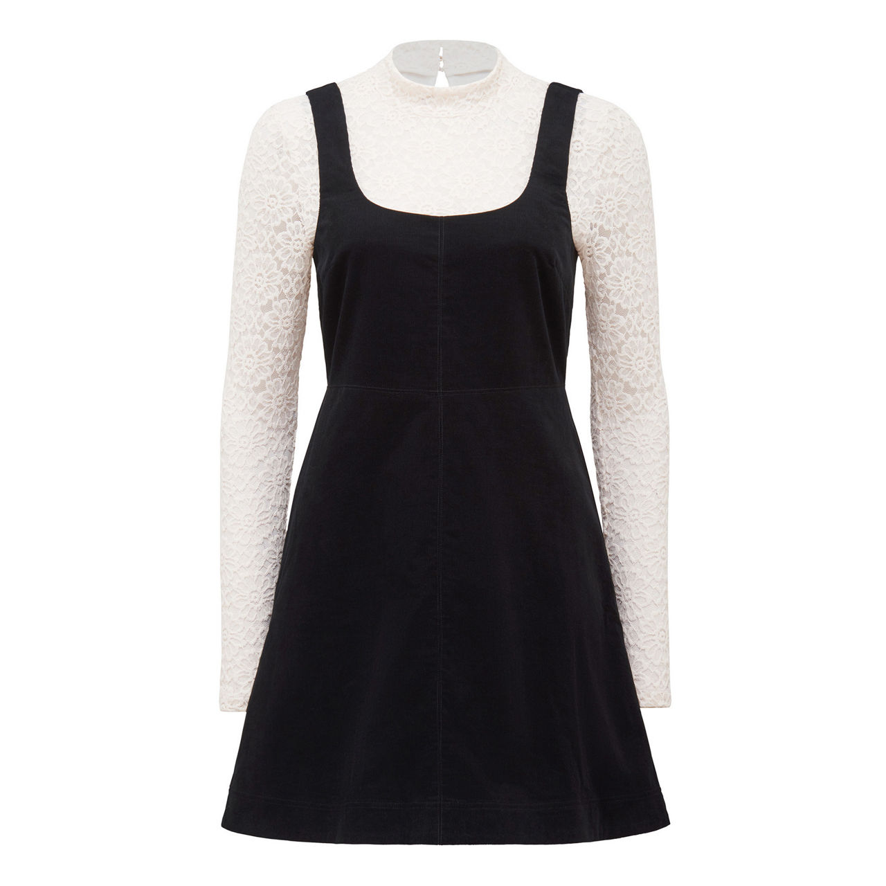 - Long-sleeved lace top with high neck and button fastening, corduroy mini dress with square neckline