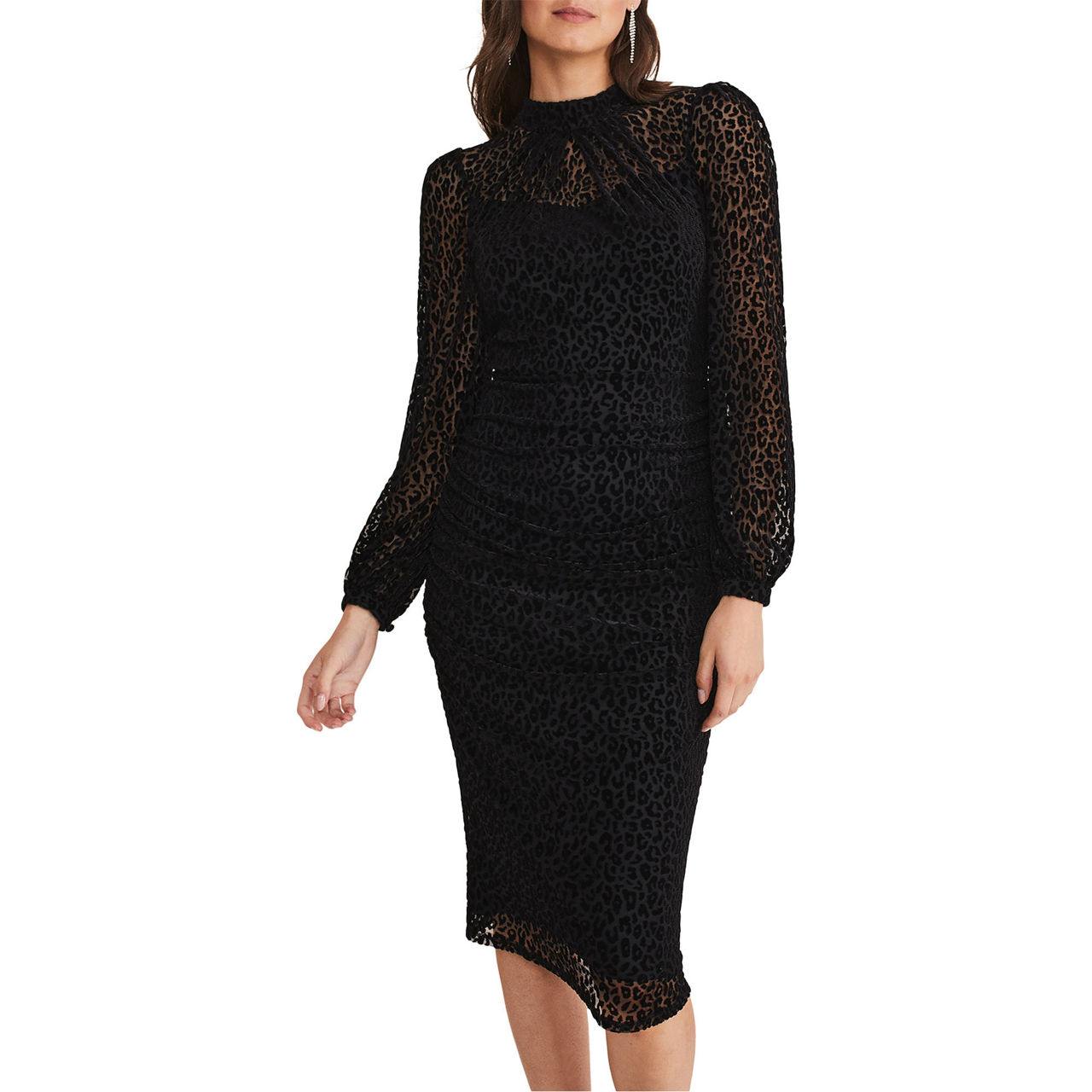 Your new go-to occasion style. Designed with a stunning on-trend animal print, this dress features a semi-sheer design with blouson sleeves to a slim fit silhouette. Style with heels and matching accessories for the perfect event-ready look.