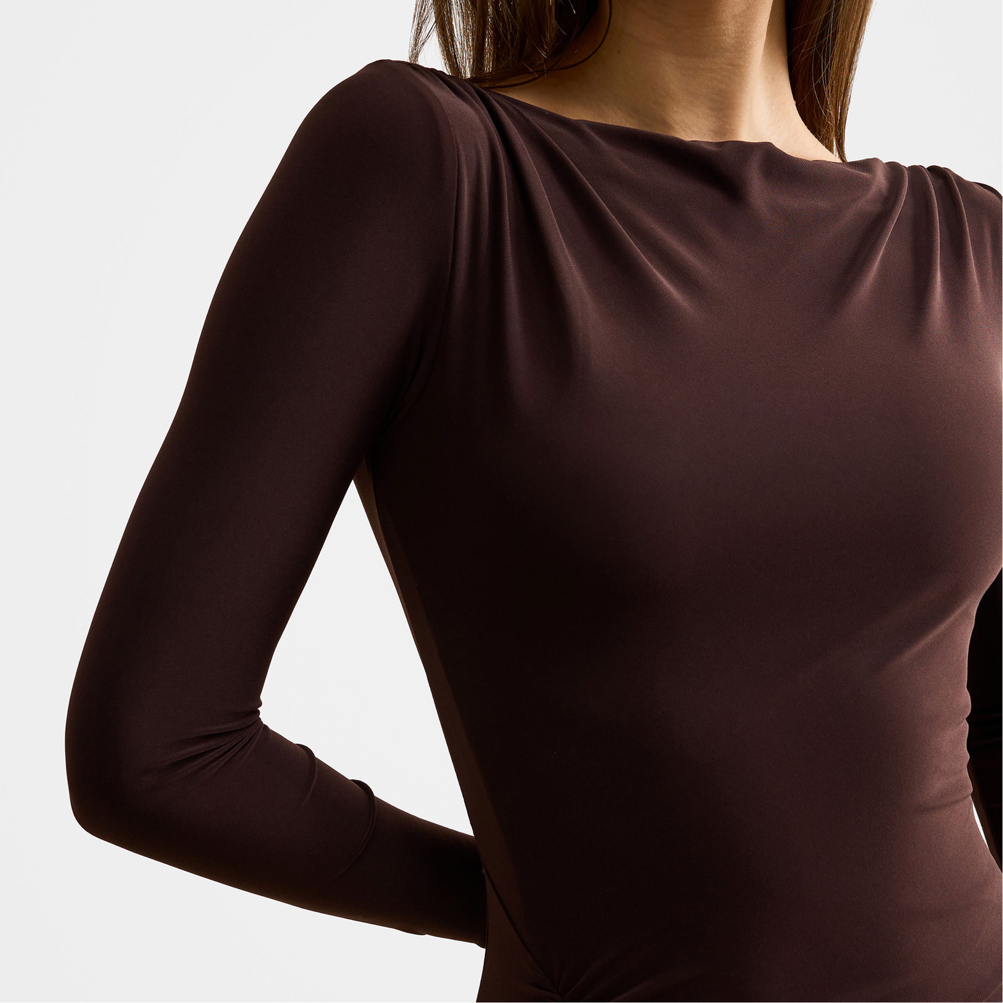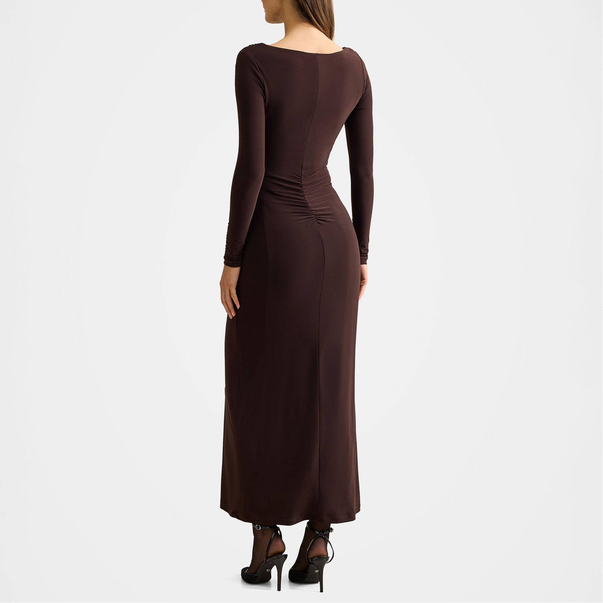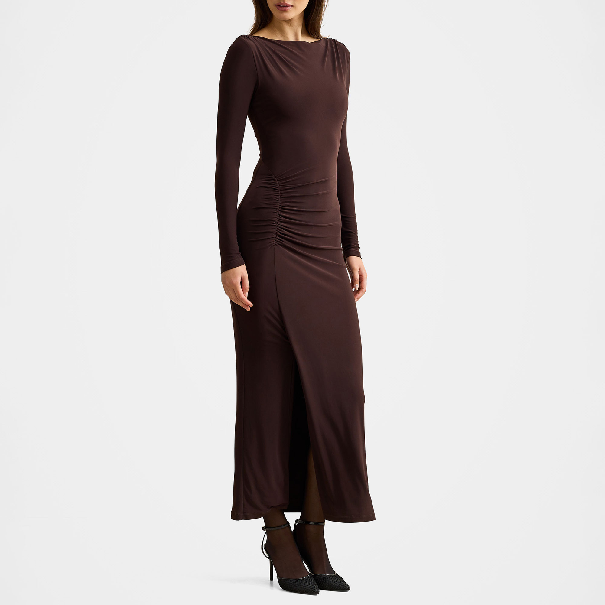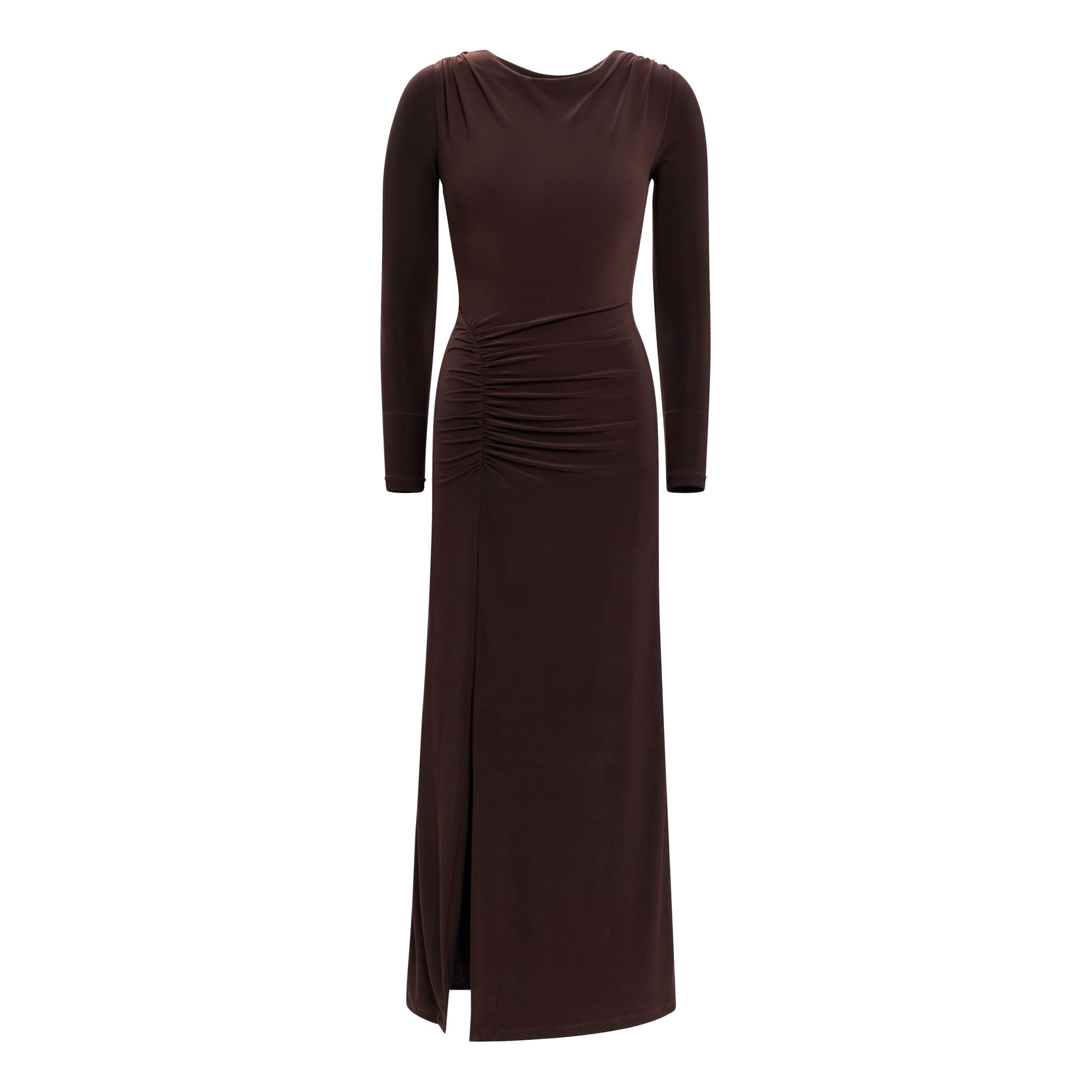 - Fitted silhouette, lightweight knit fabrication, boat neckline, long sleeves, gathering, ruching, column skirt silhouette, front split, lined