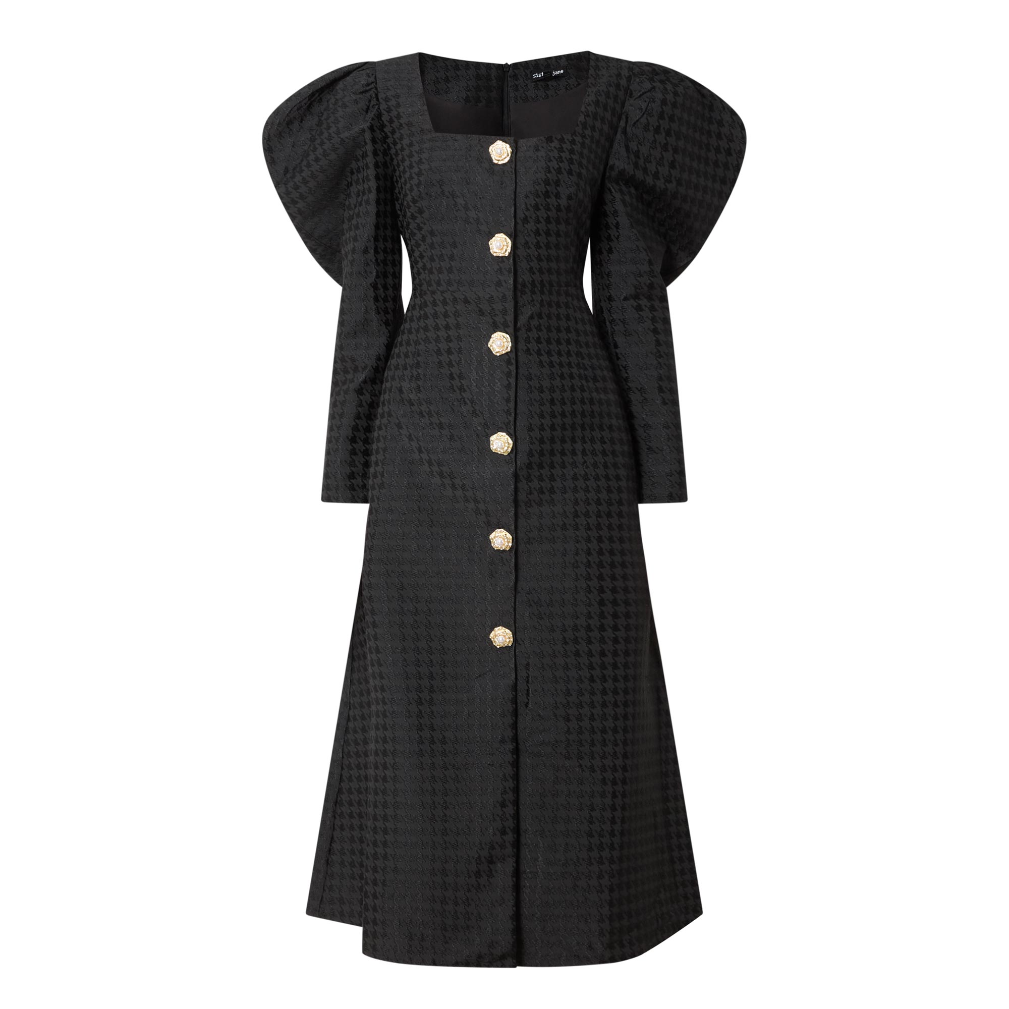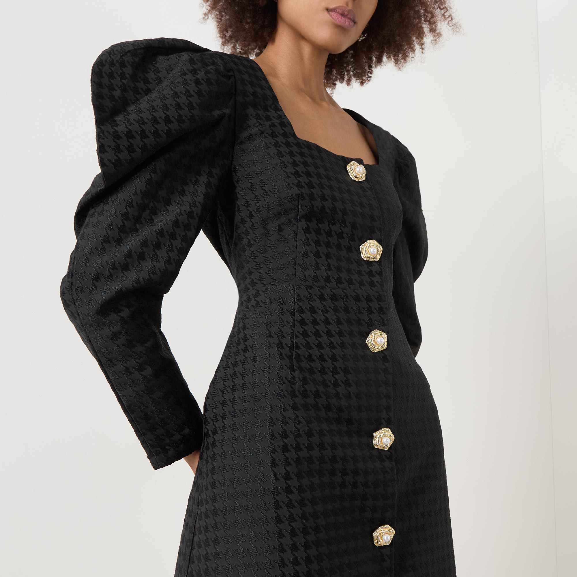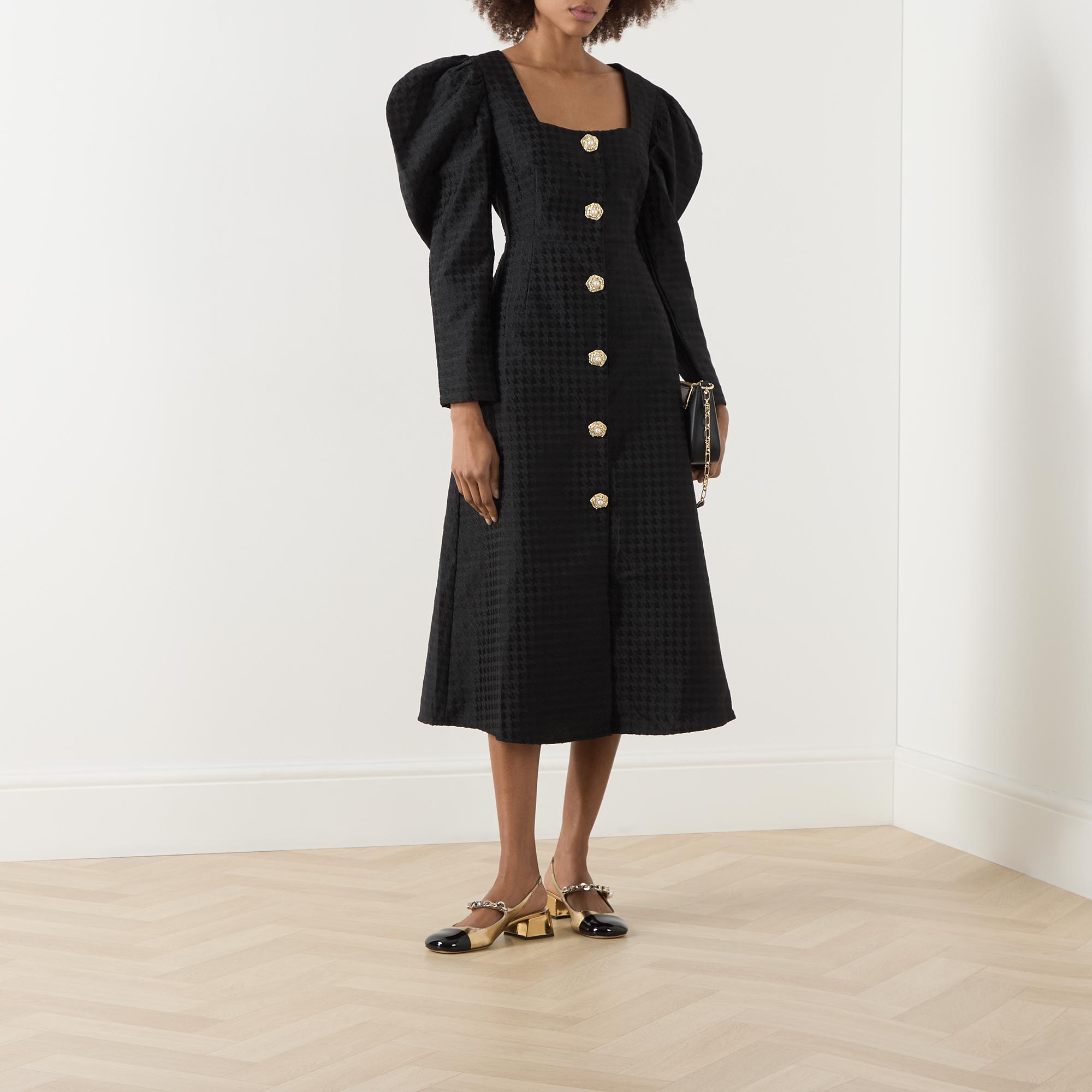 • Long puff sleeves, square-cut neckline, gold-tone button fastenings, back zip-fastening closure, jacquard pattern, flared silhouette, midi length