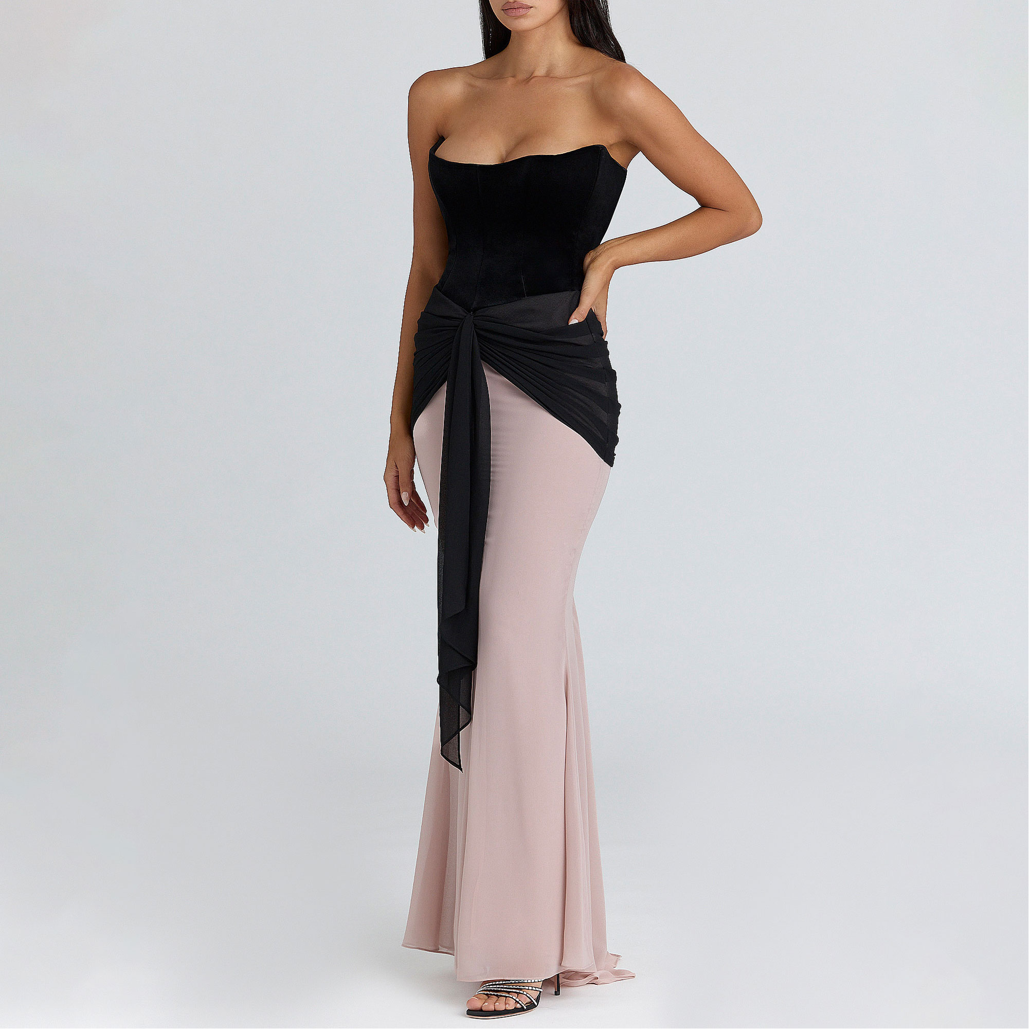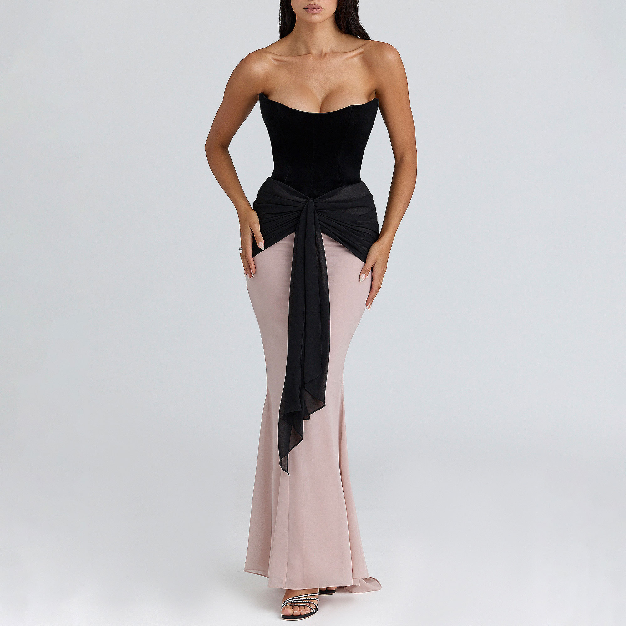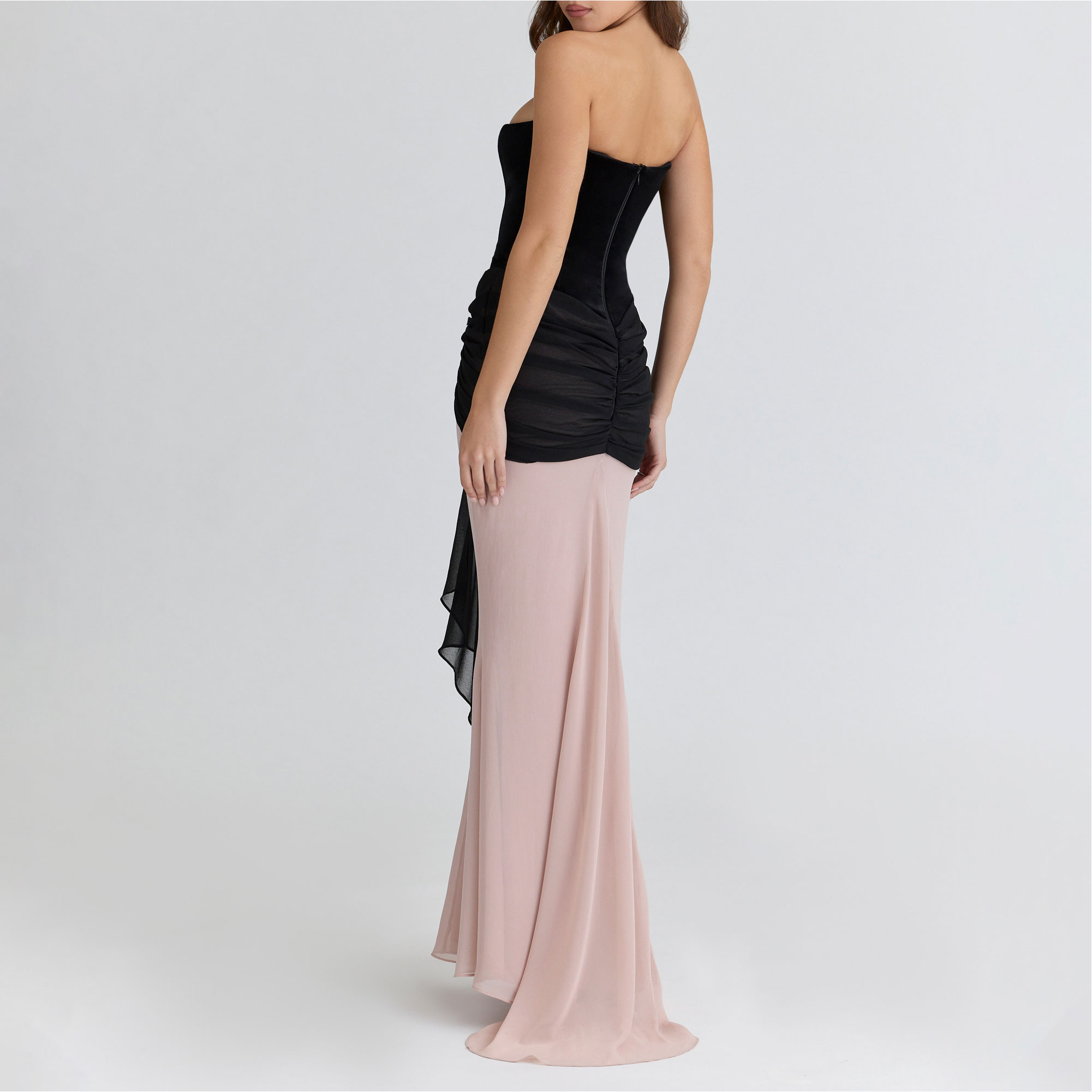- Bodice cut from stretch velvet to a structured shape, peaked bustline, boning, zip at the back, flowing chiffon skirt falls from the waist