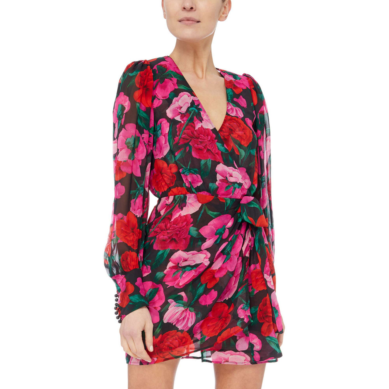 - Long sleeves, v-neck, floral print, wrap design, tie detail, mini length.
