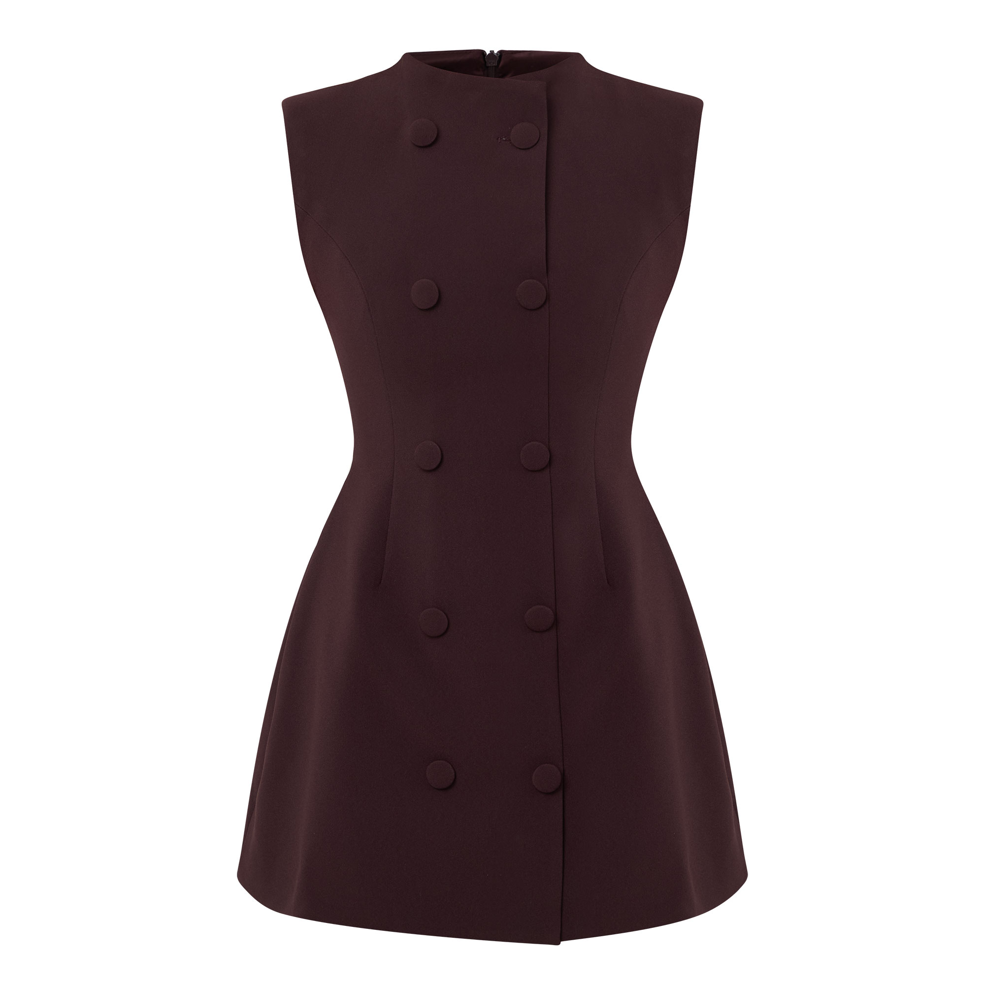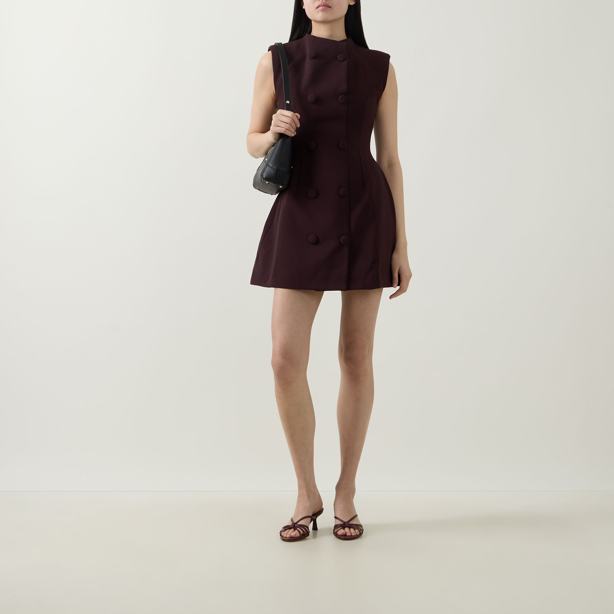 - High neckline, sleeveless, mini length, double-breasted button detailing to the front, cinched tailoring, flared hem, discreet zip fastening to the back