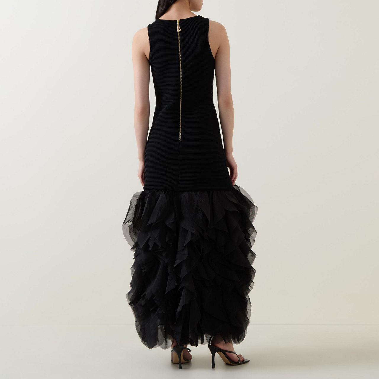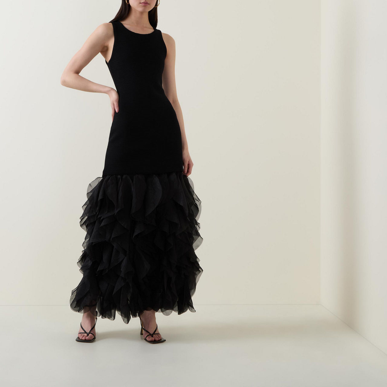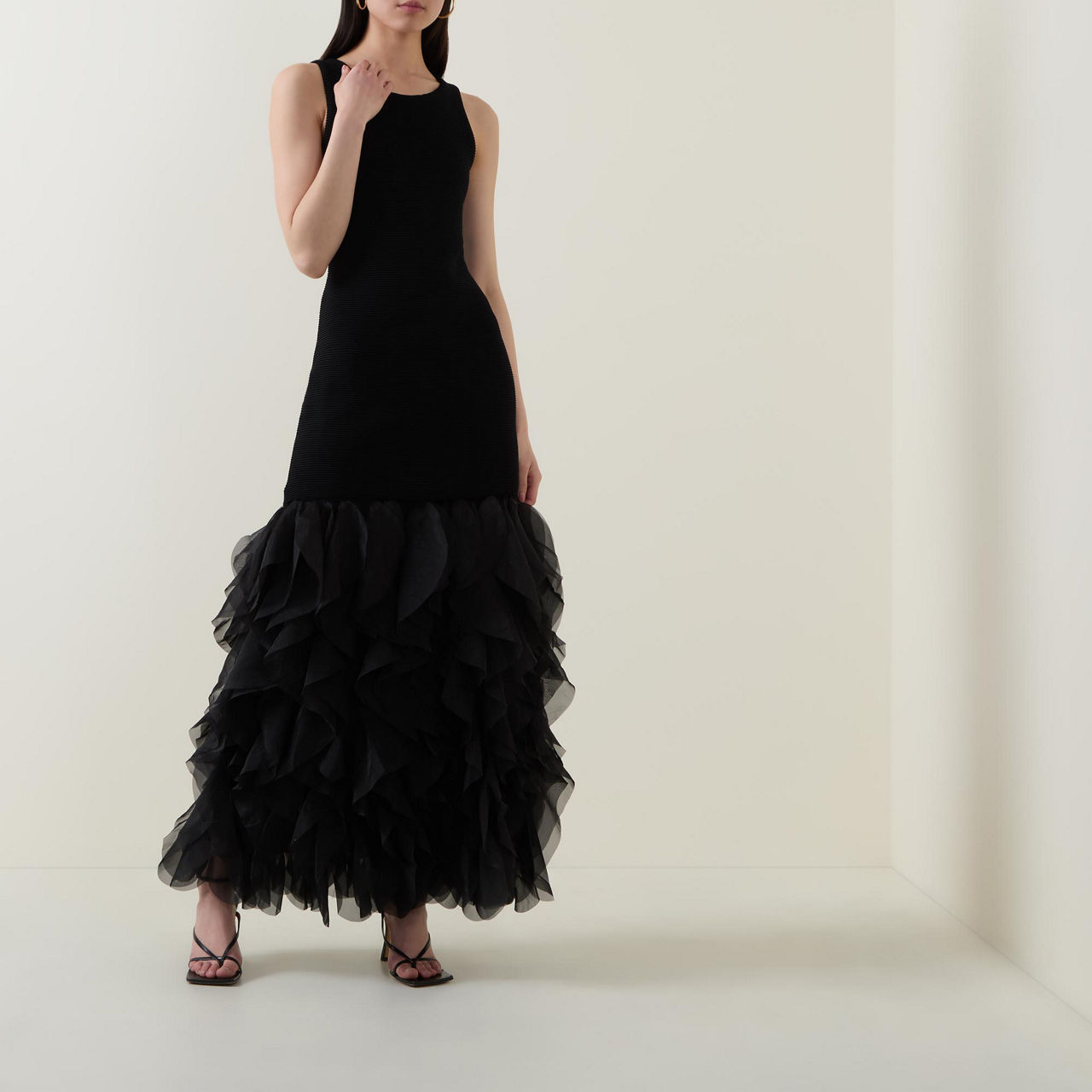 - Sleeveless, ribbed knit body, round neck, fitted style, gold-tone zip fastening, layered ruffle hem, maxi length