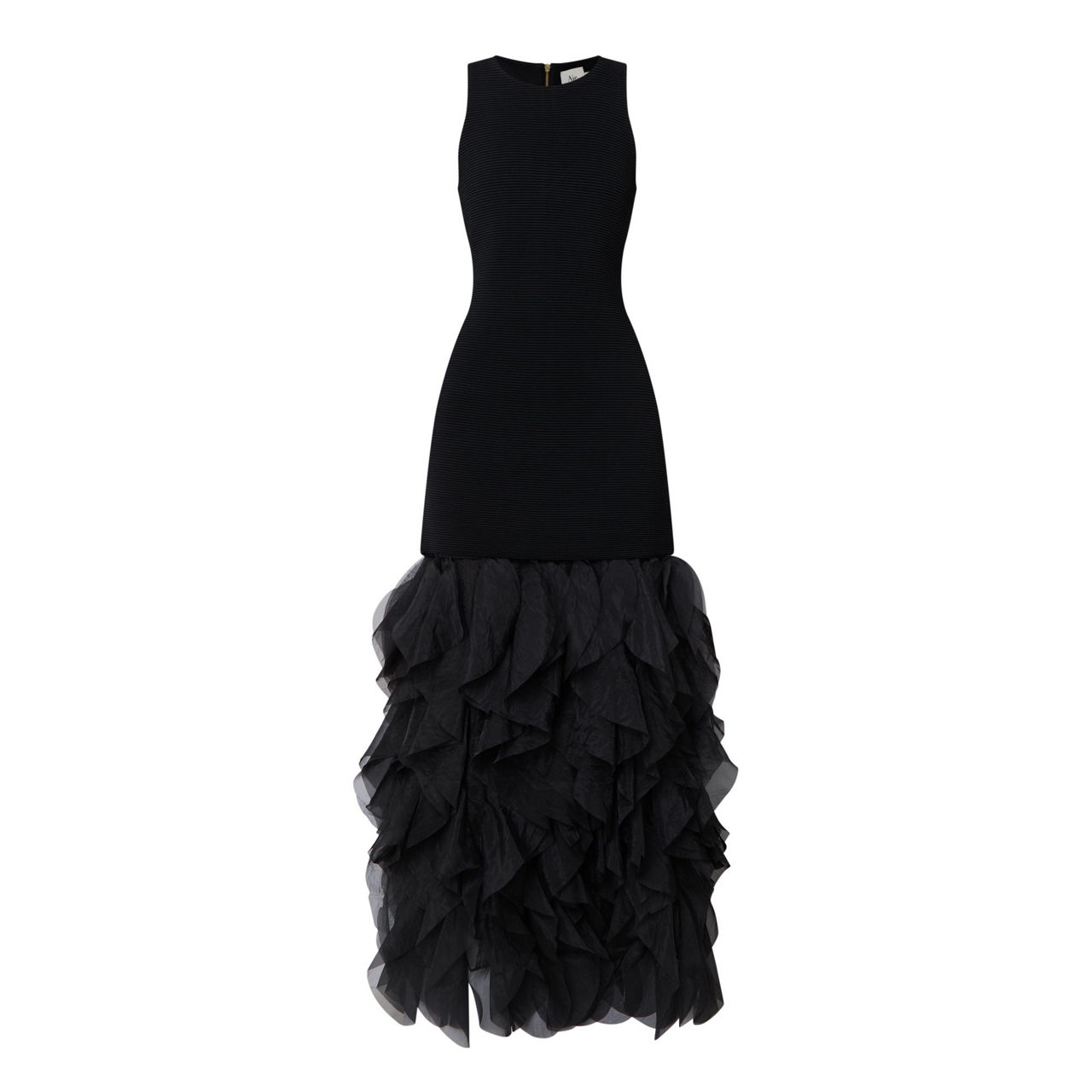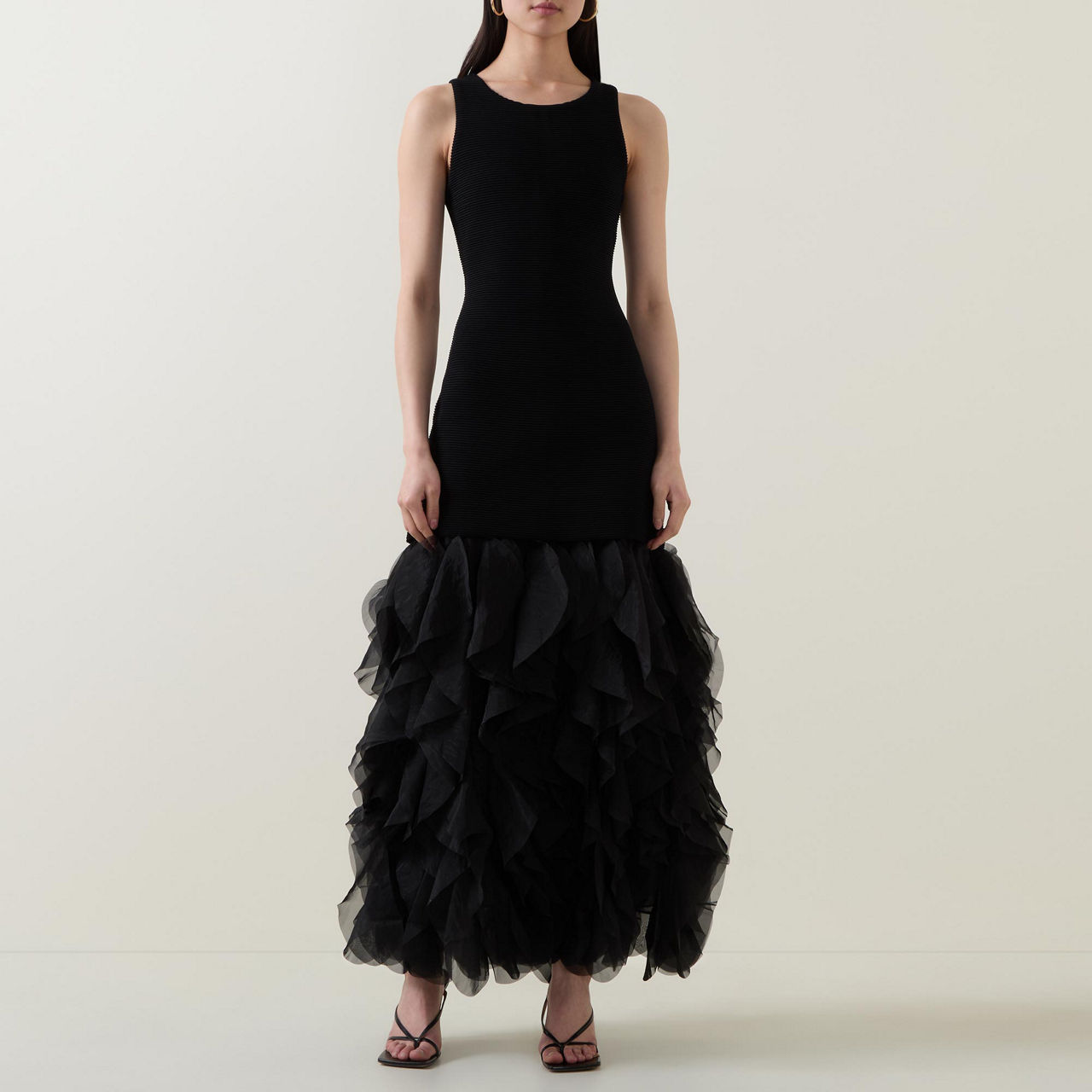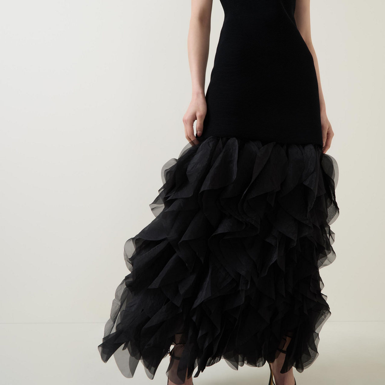 - Sleeveless, ribbed knit body, round neck, fitted style, gold-tone zip fastening, layered ruffle hem, maxi length