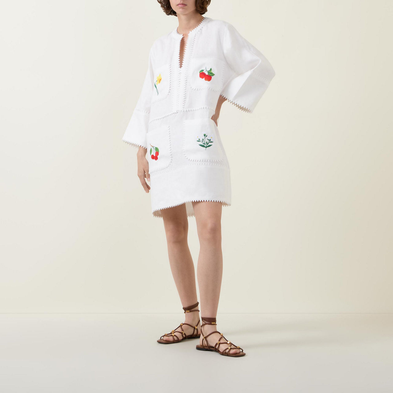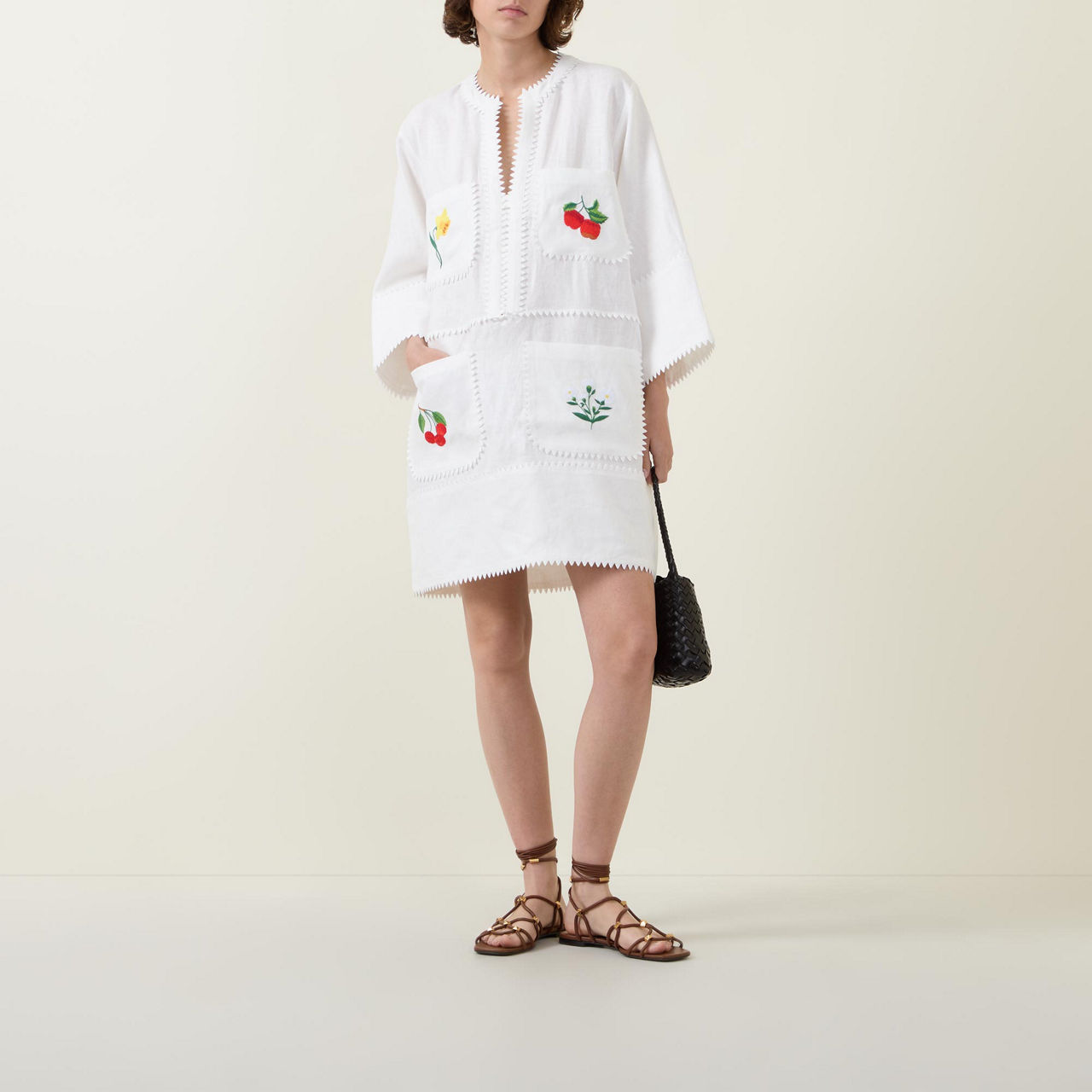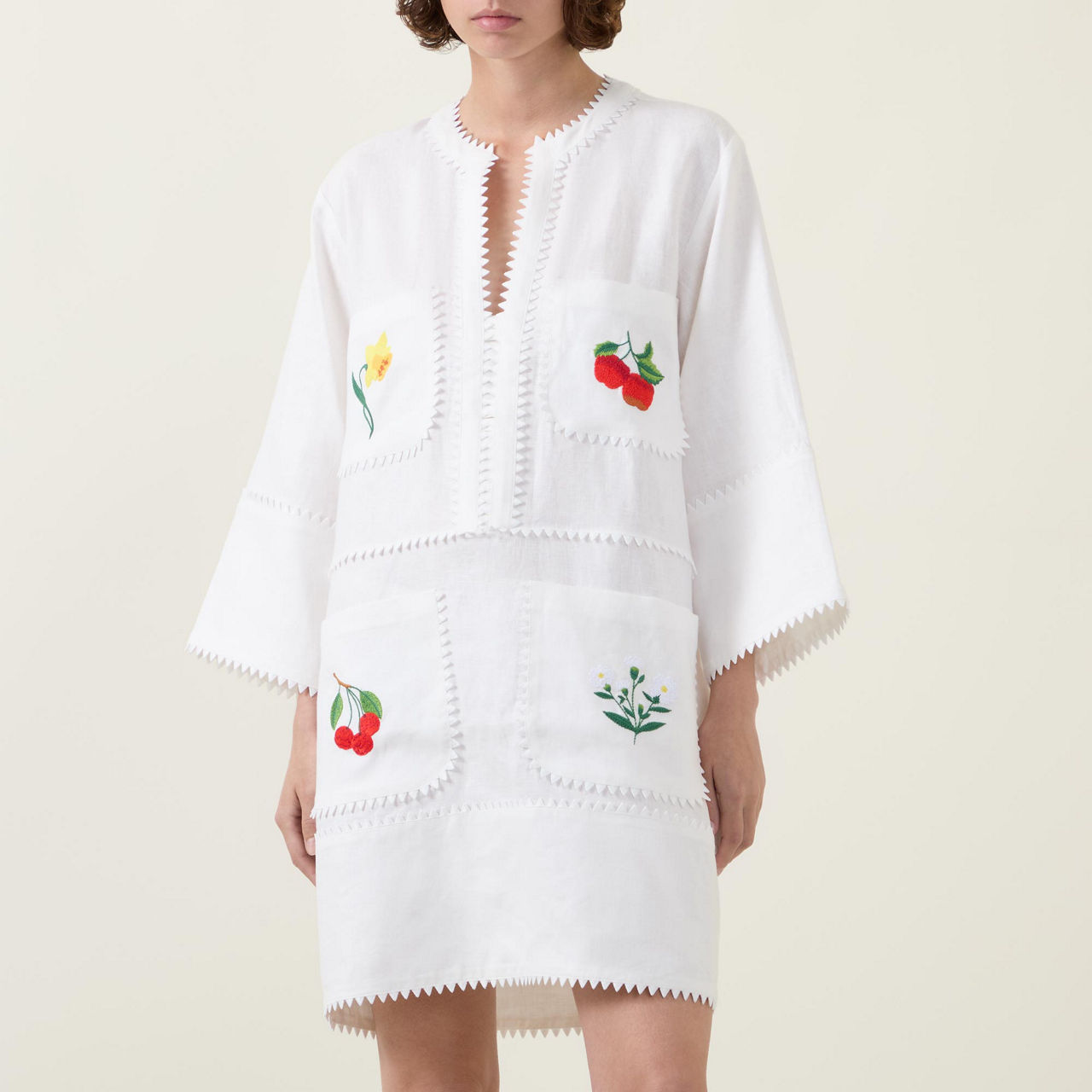 - Corozo buttons, mini length, saw-tooth lace trim, embroidered fruit and floral motifs, half-length sleeves, four patch pockets