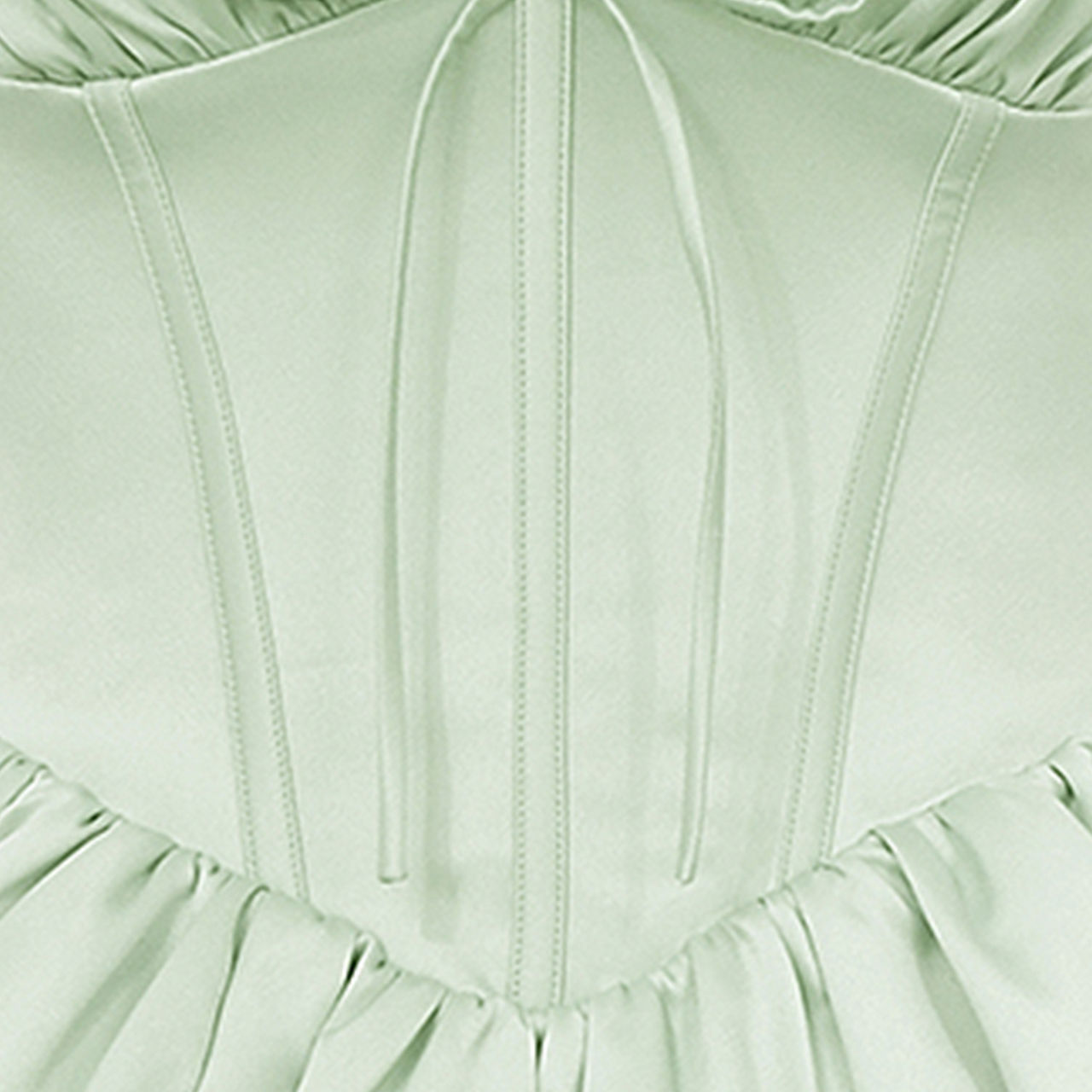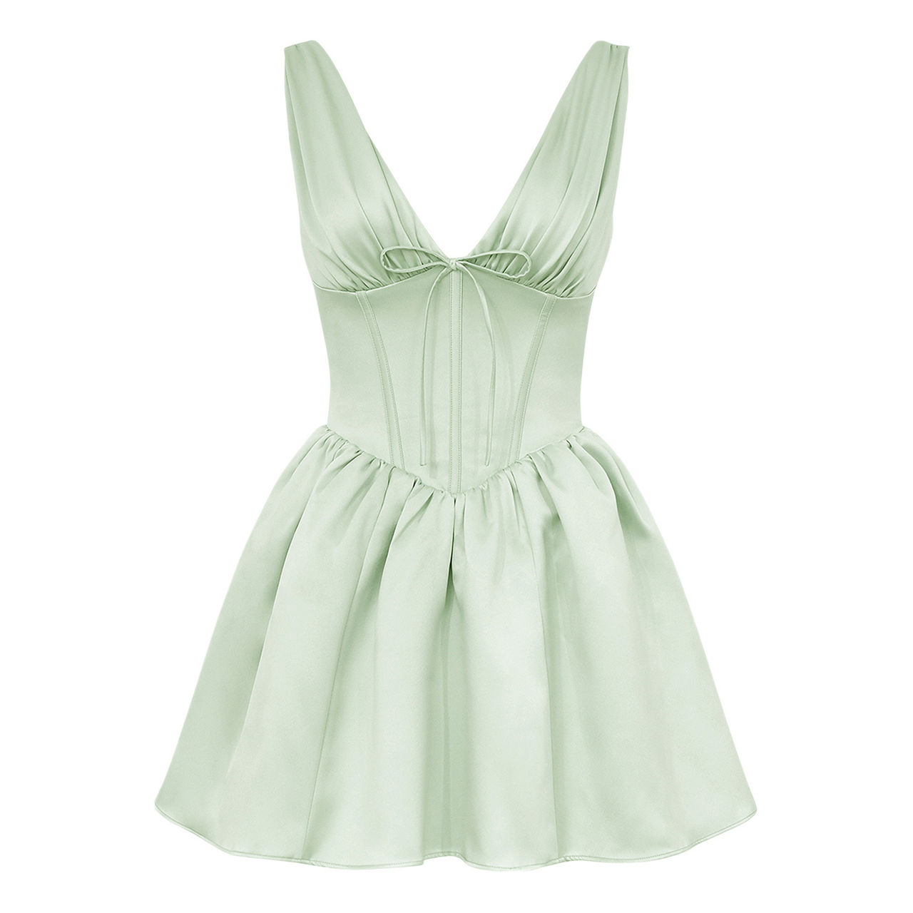 - Satin finish, boned bodice, plunging V-neckline that, front bow, ruche detailing, wide voluminous straps, flared skirt with pleat detailing, zip fastening