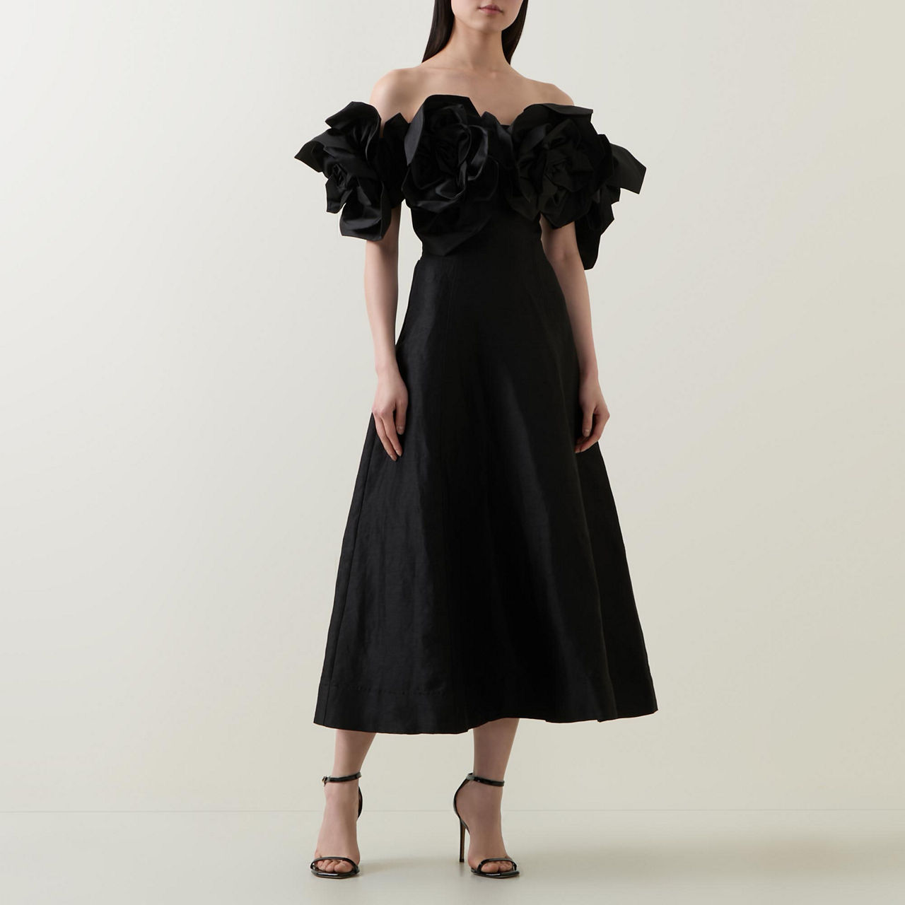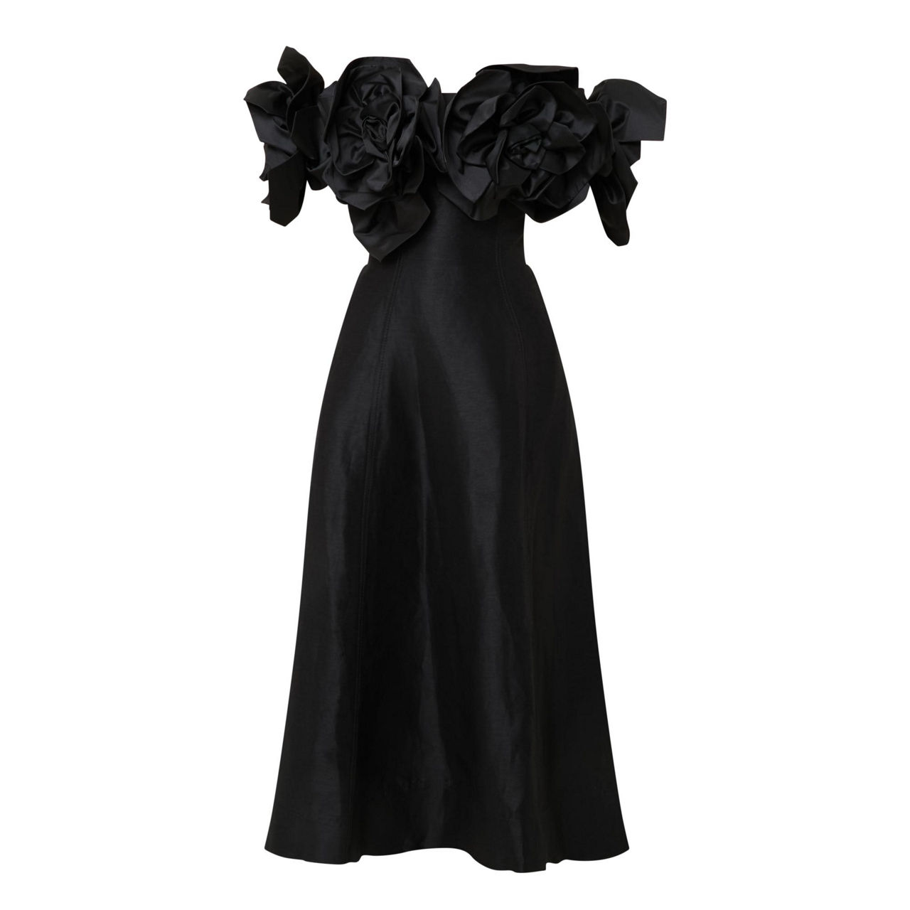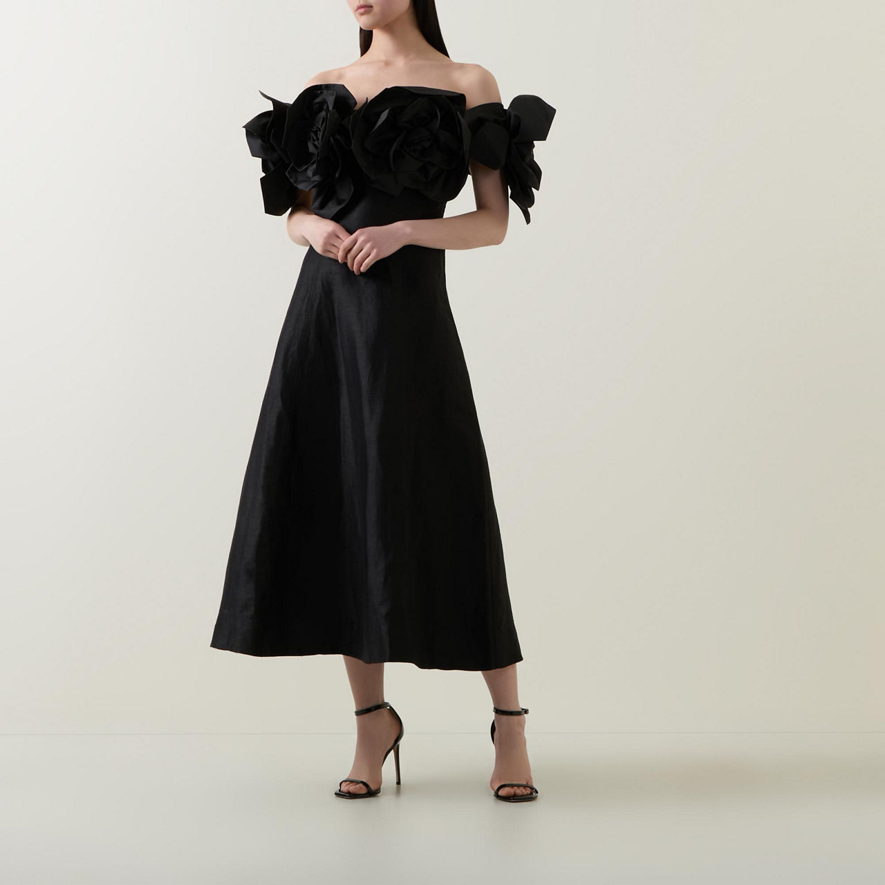 - Off-the-shoulder design, oversized flower embellishment on neckline and sleeves, rear zip-fastening closure, flared silhouette, midi length, smooth fabric