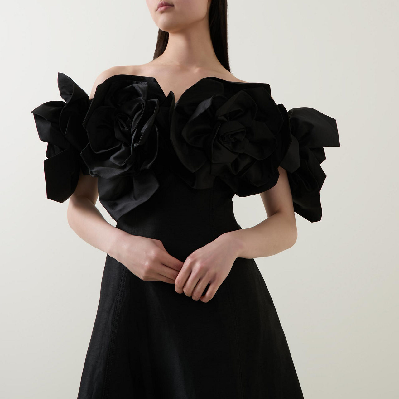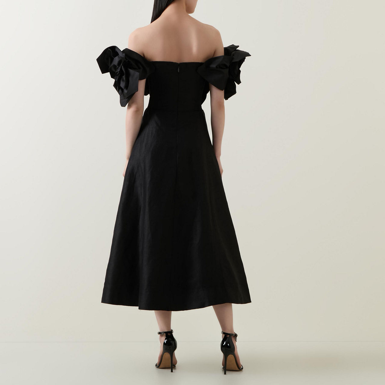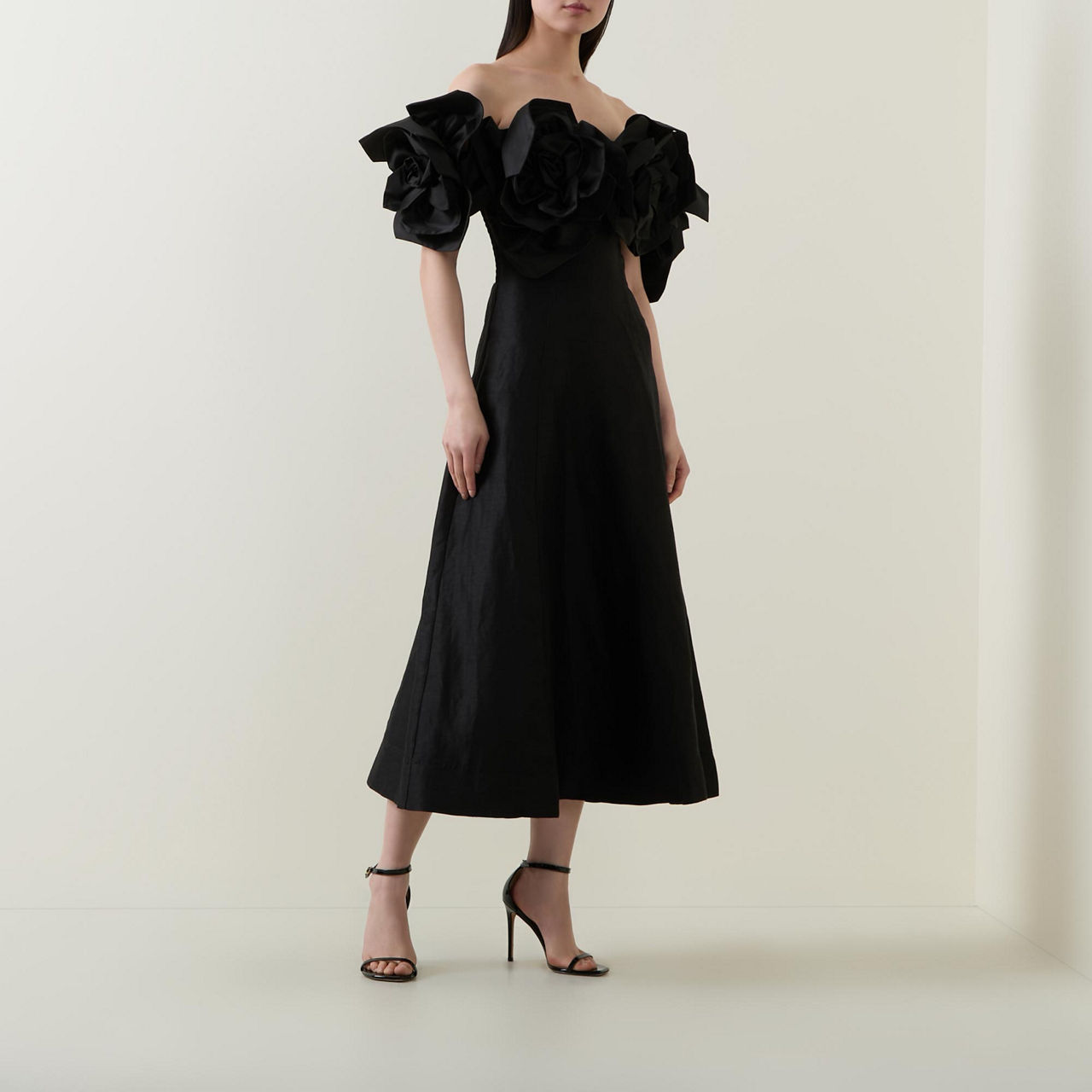 - Off-the-shoulder design, oversized flower embellishment on neckline and sleeves, rear zip-fastening closure, flared silhouette, midi length, smooth fabric