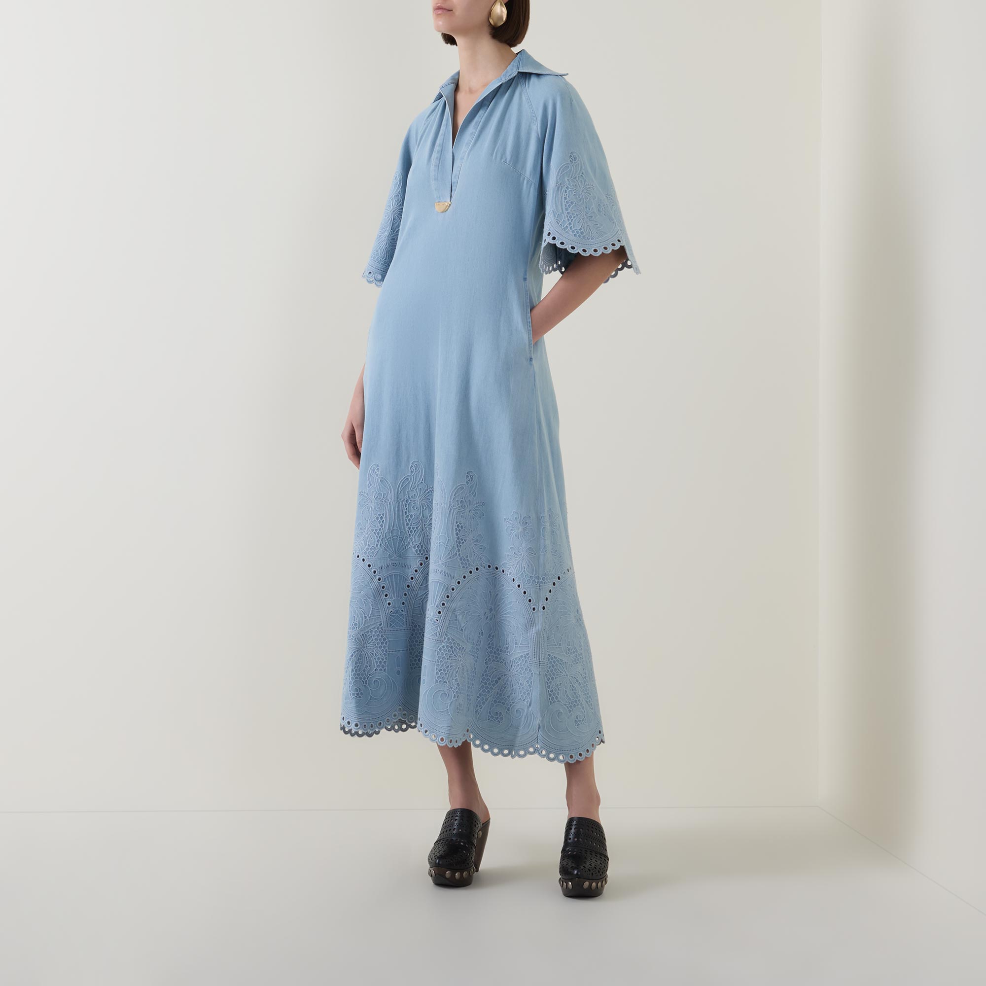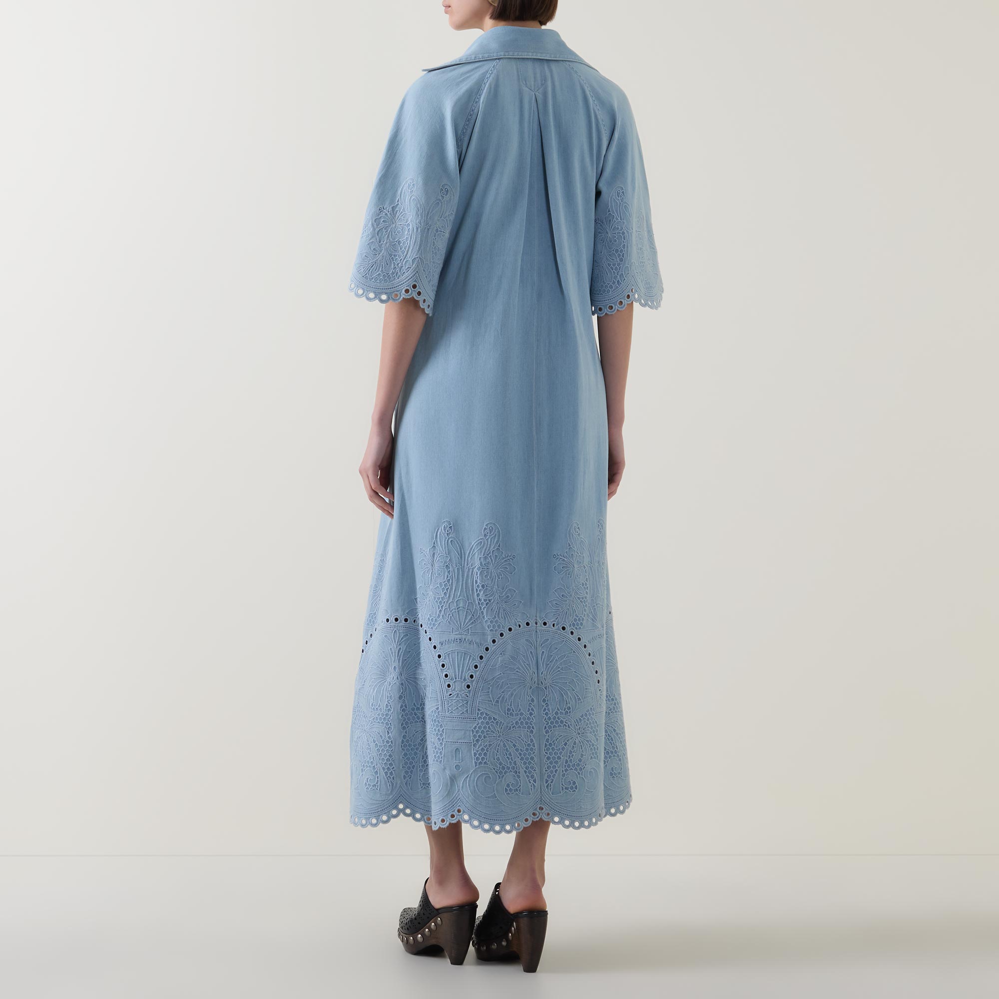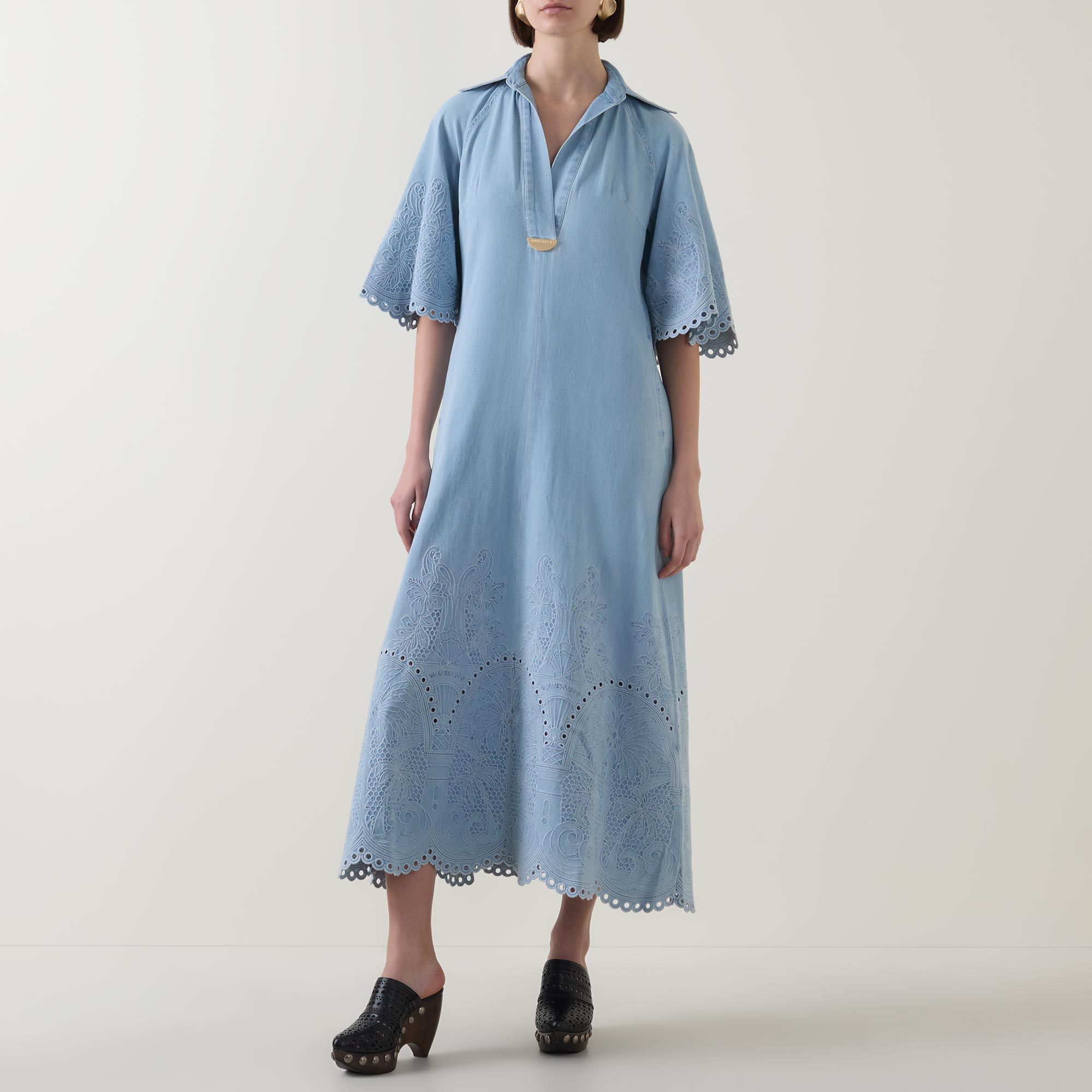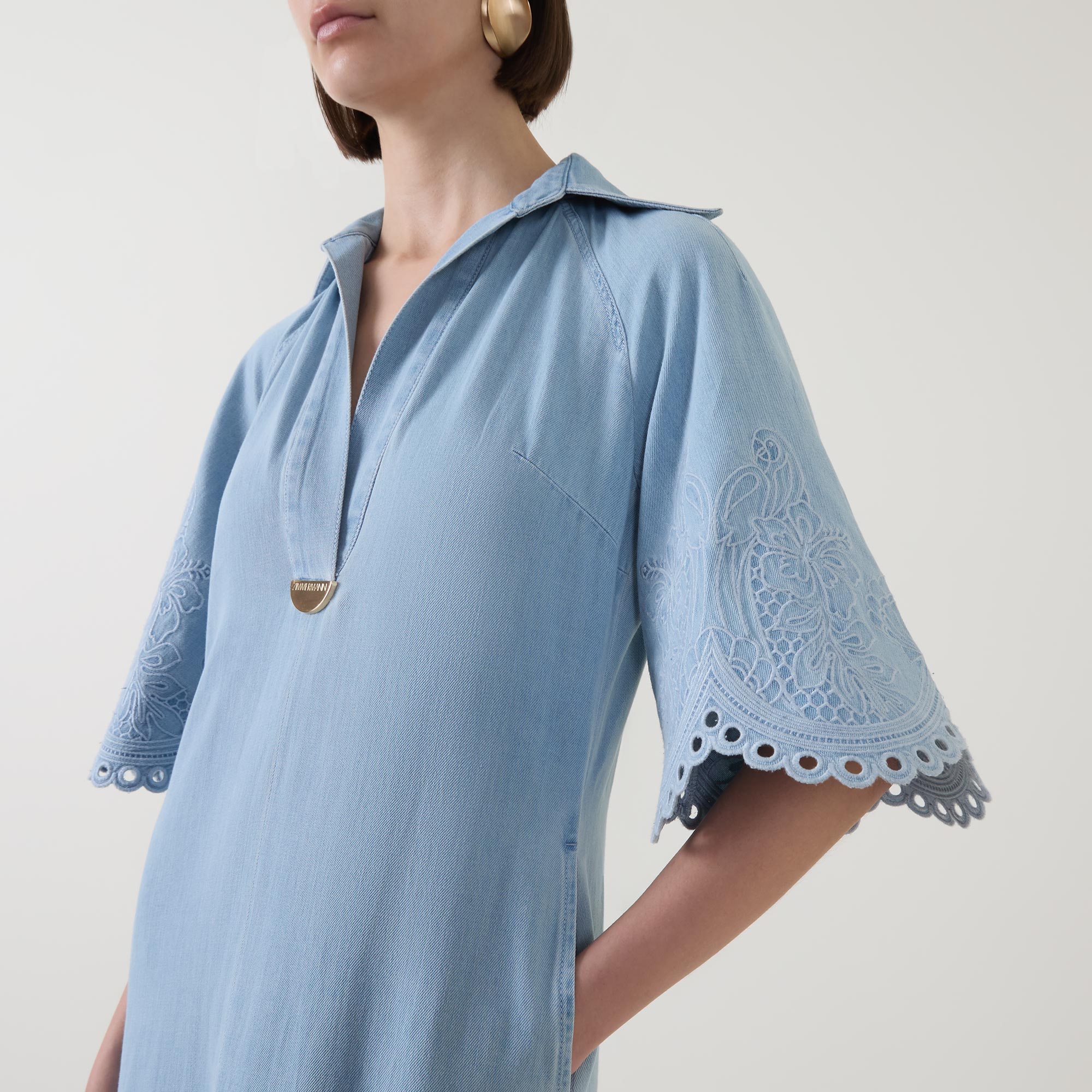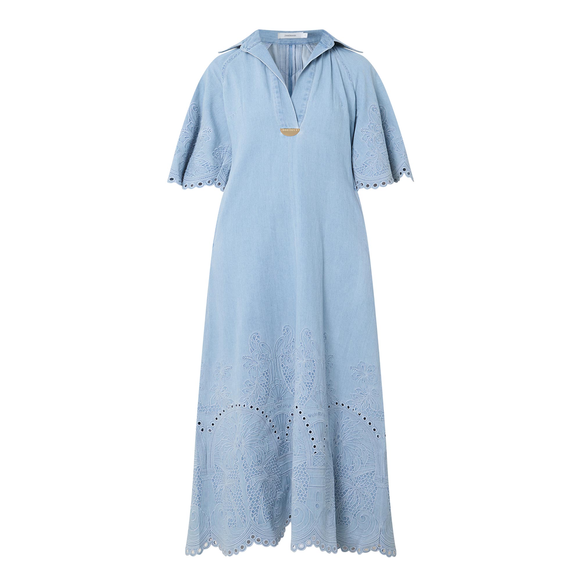The Twisted Romance Cruise 2026 collection from Zimmermann blends light, airy shapes with tailored structure and relaxed ease, perfectly exemplified by this dress. Featuring a structured spread collar and sharp V-neckline, it's framed by mid-length sleeves and adorned with delicate razor eyelet detailing and scalloped edges for a feminine touch, before flowing to a flared, midi-length silhouette in a chic denim finish.