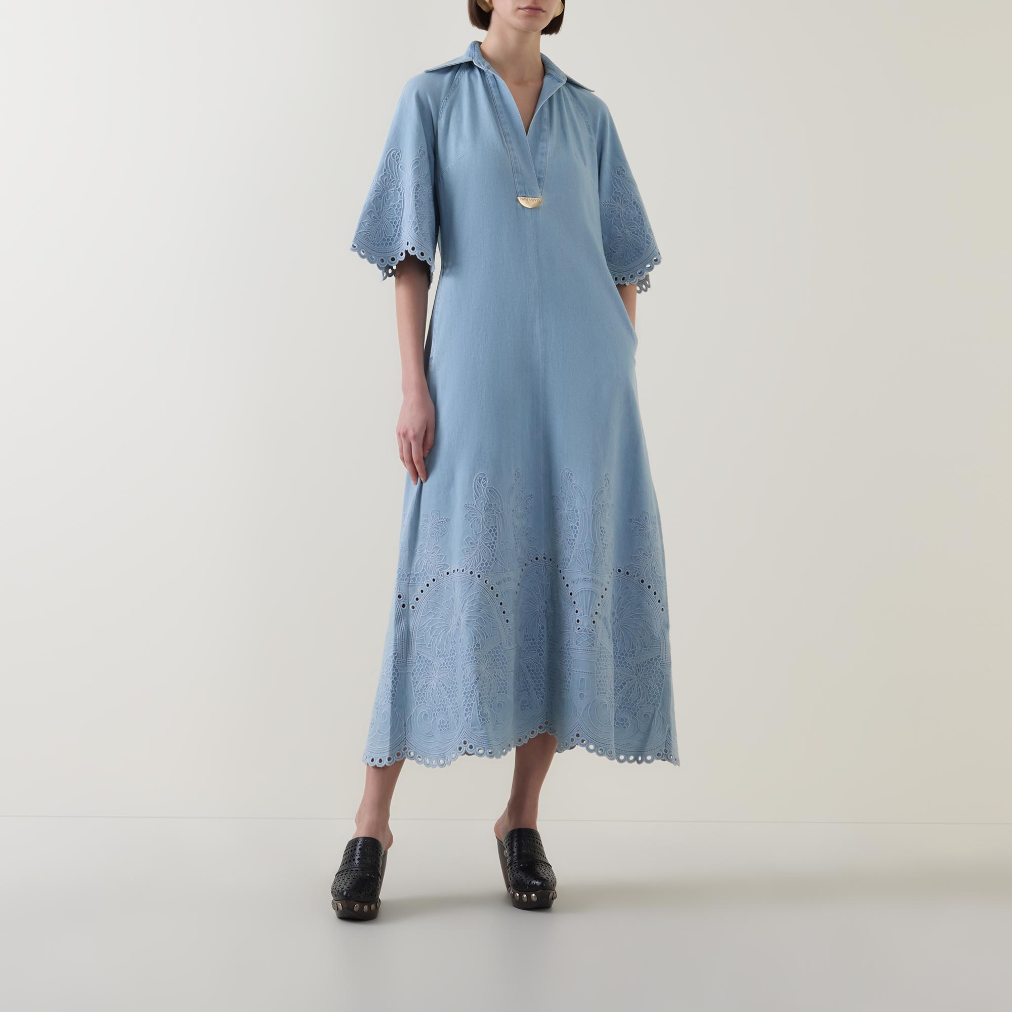 - Mid-length sleeves, spread collar, V-neckline, eyelet detailing, scalloped edges, two side in-seam pockets, midi length, smooth denim finish