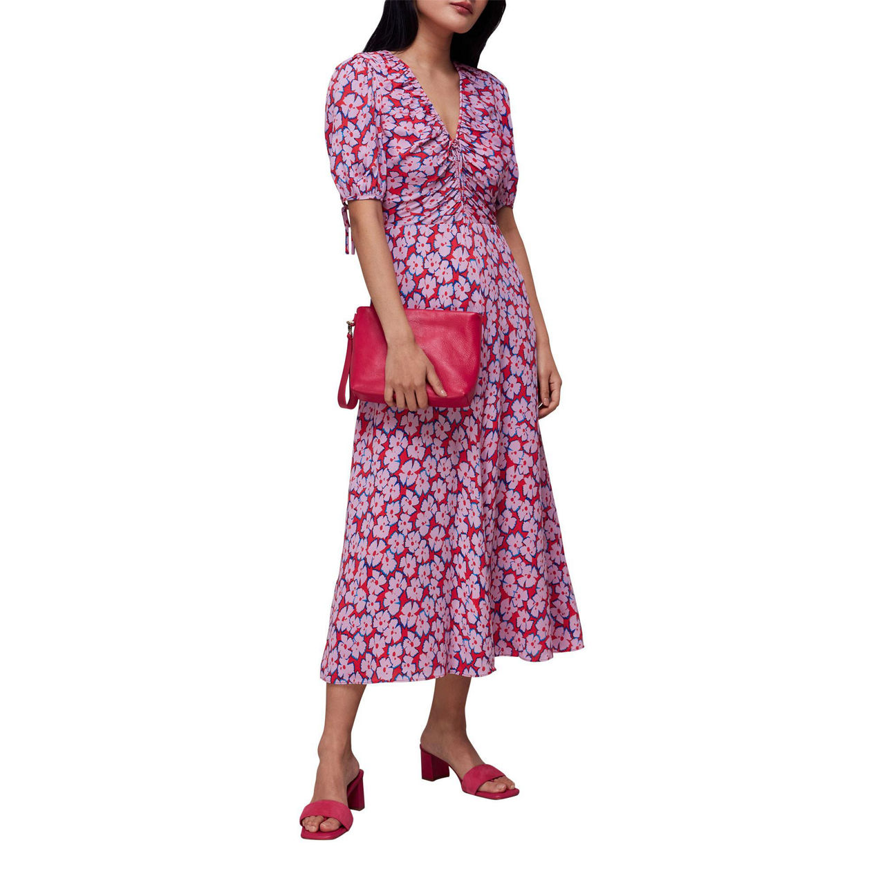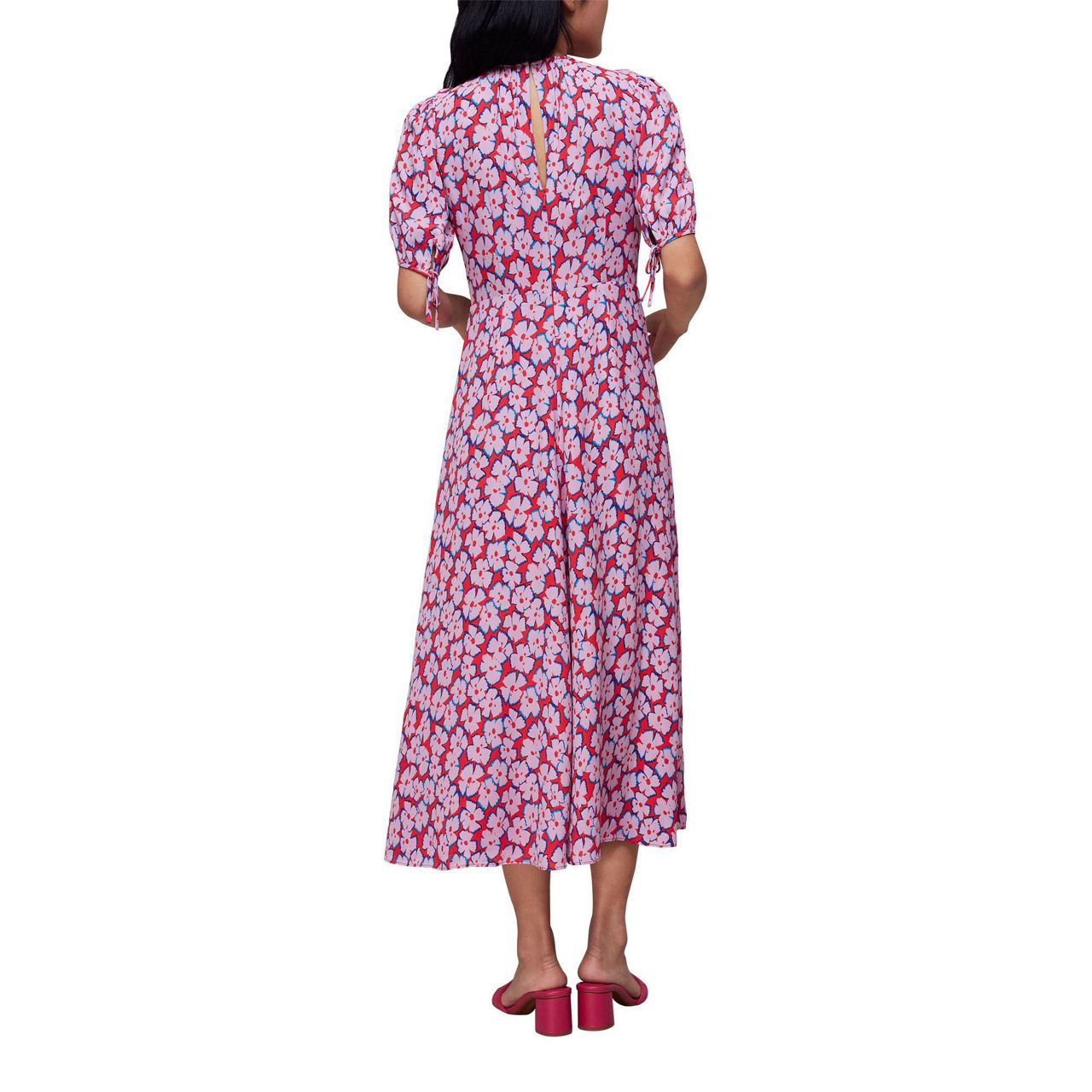 - Midi length, floral print, V-neckline, ruched detailing across the bodice, three-quarter puff sleeves, cuffs with tie detail, keyhole back, zip fastening