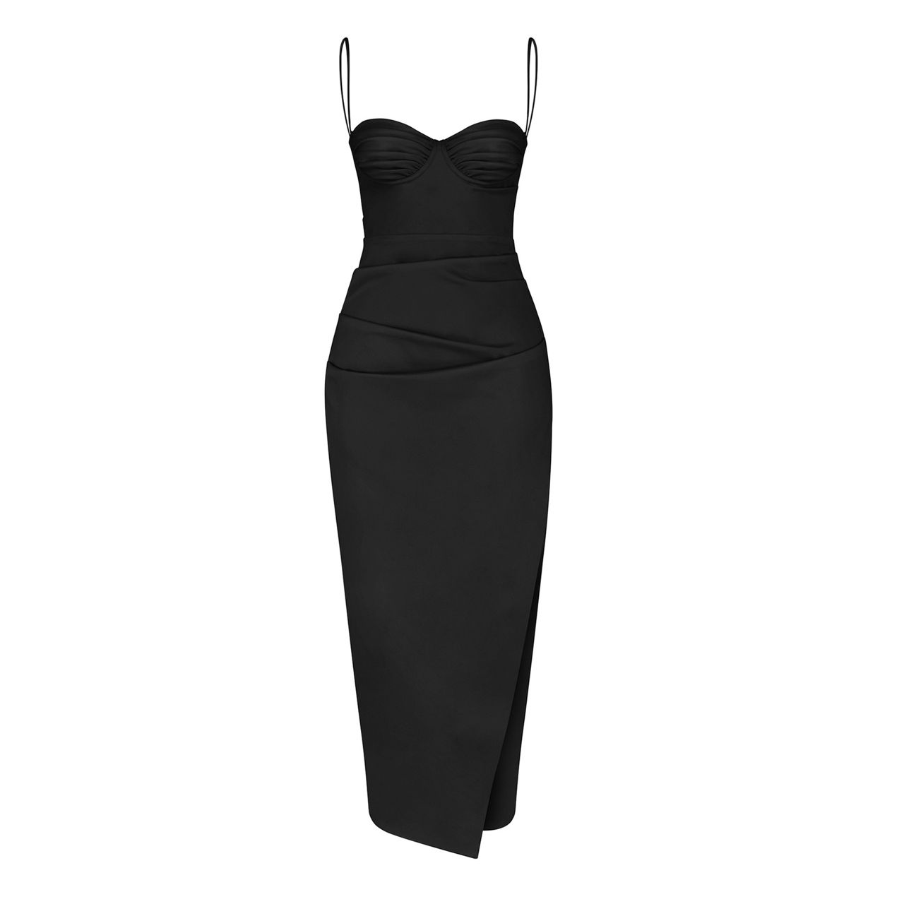 - Sweetheart neckline, thin adjustable straps, midi length, slit hemline, zip fastening at back, pleated details, smooth satin finish, boning and underwired cups