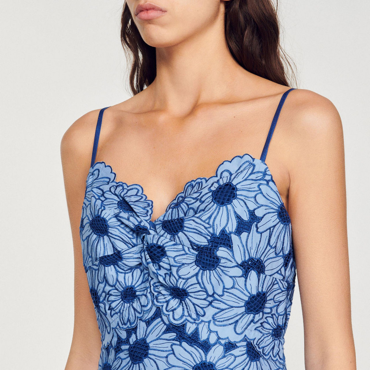 - Daisy guipure, flared skirt, adjustable narrow straps, twisted neckline, tie fastening at the back, back ties