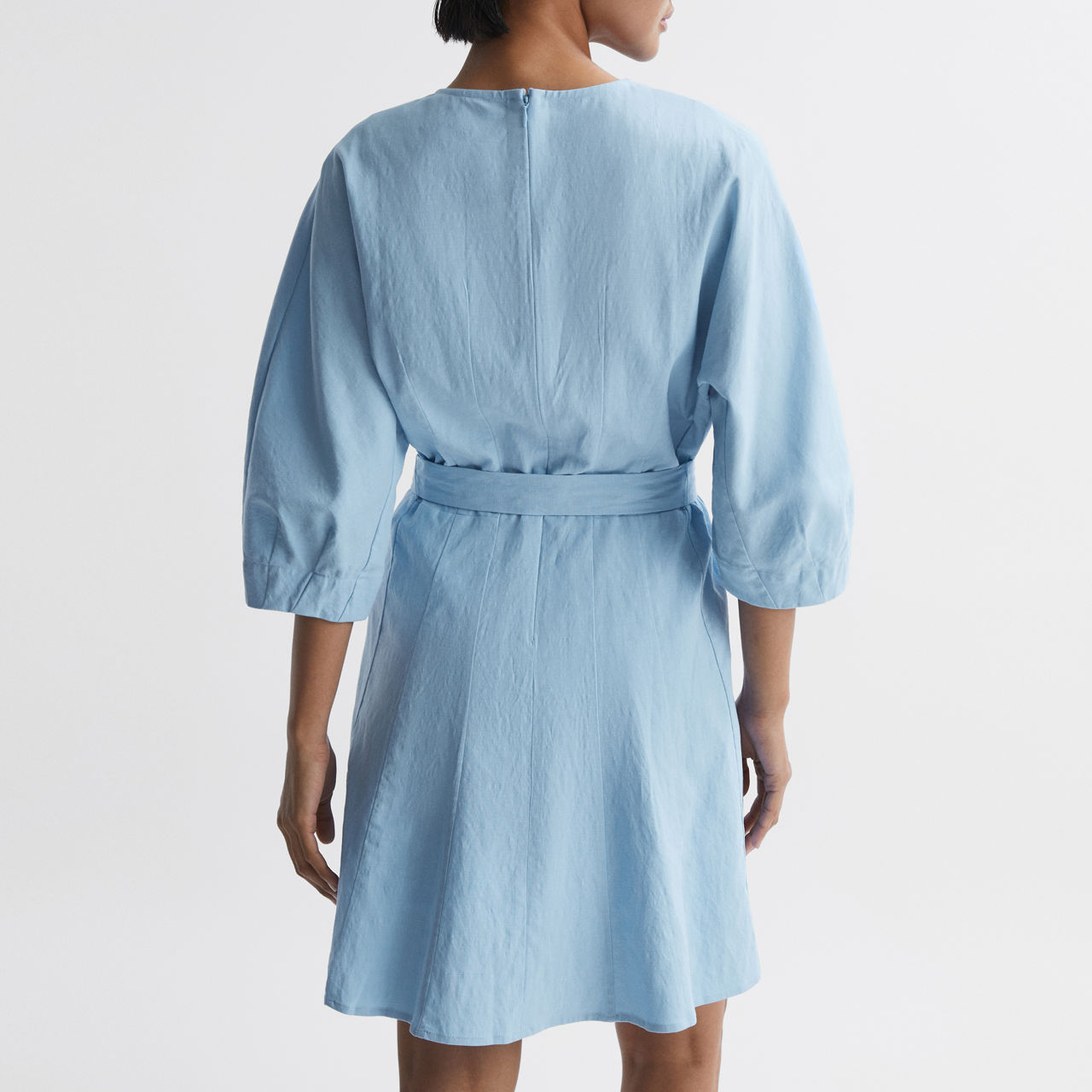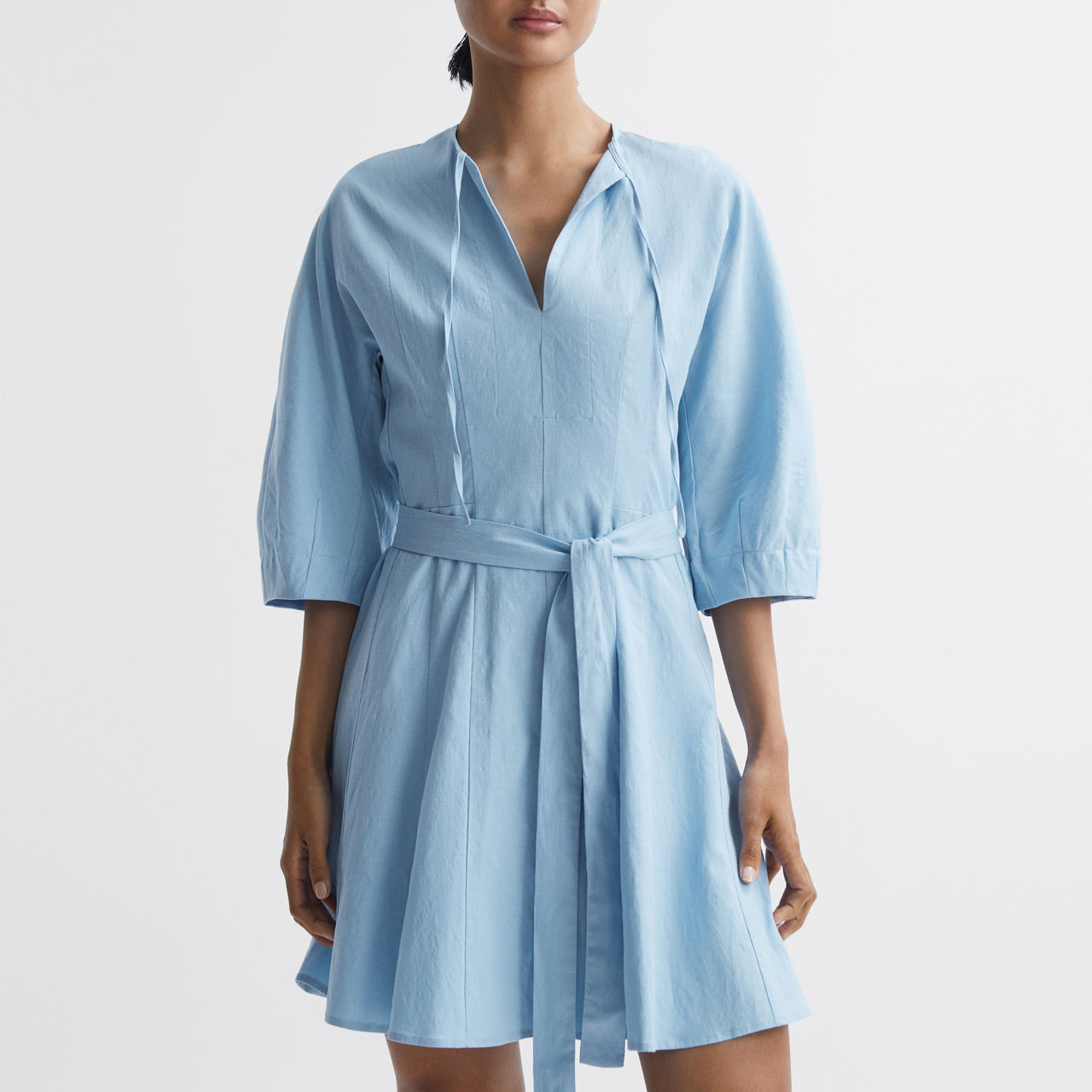 - Relaxed, mini length, 1/2 sleeves, V-neckline, belt