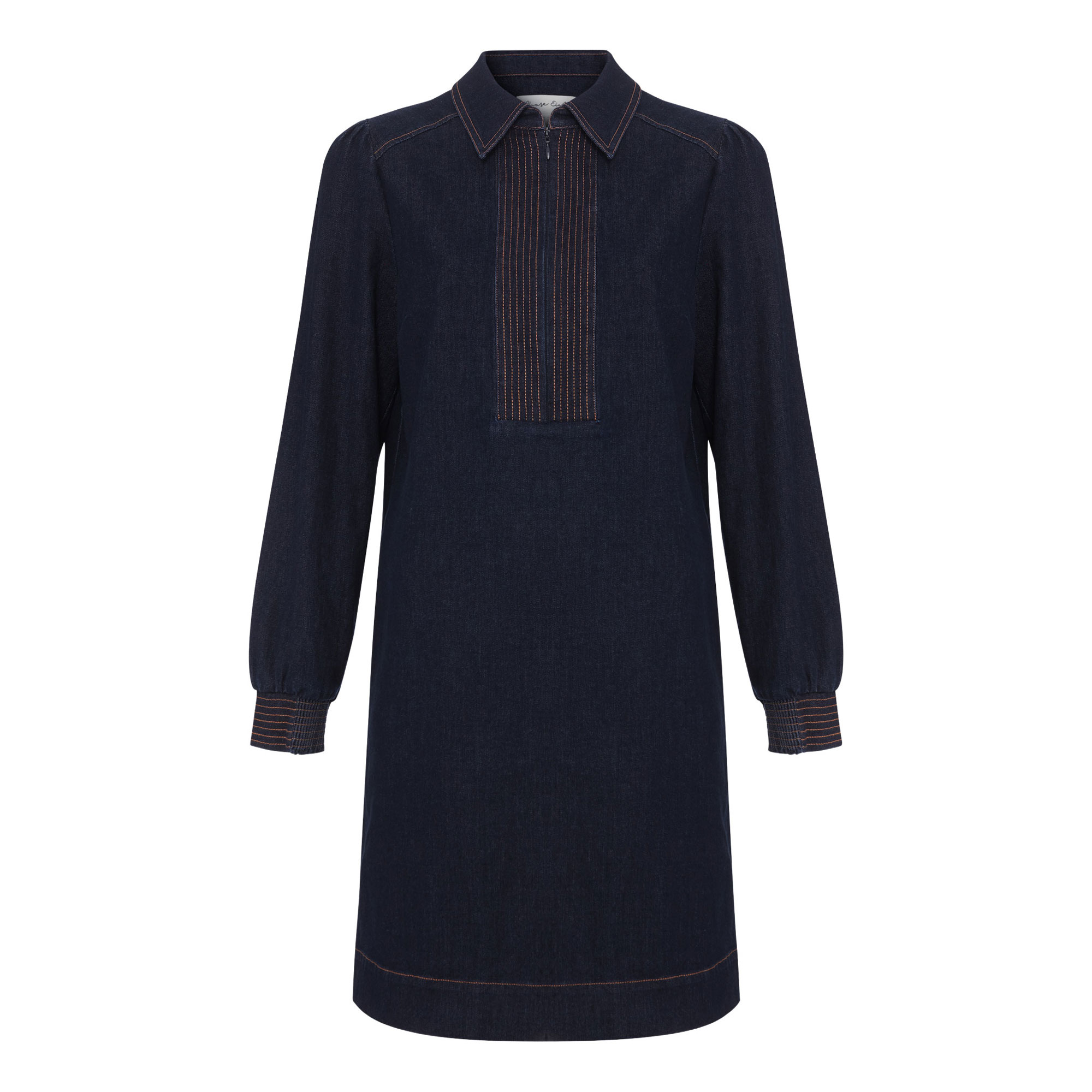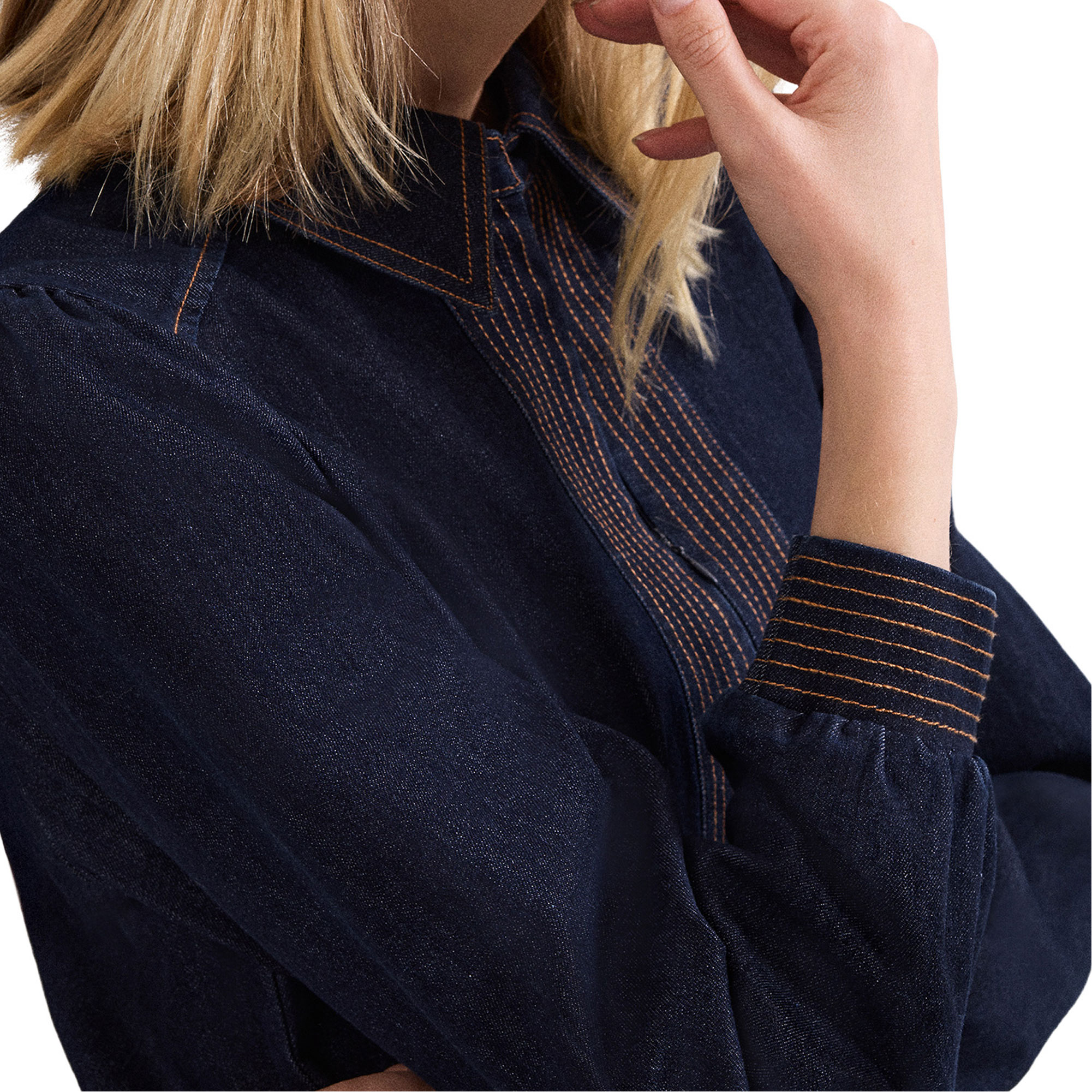 • Denim finish, point collar, three-quarter length zip, contrasting stitch details, versatile for daytime styling, logo detail