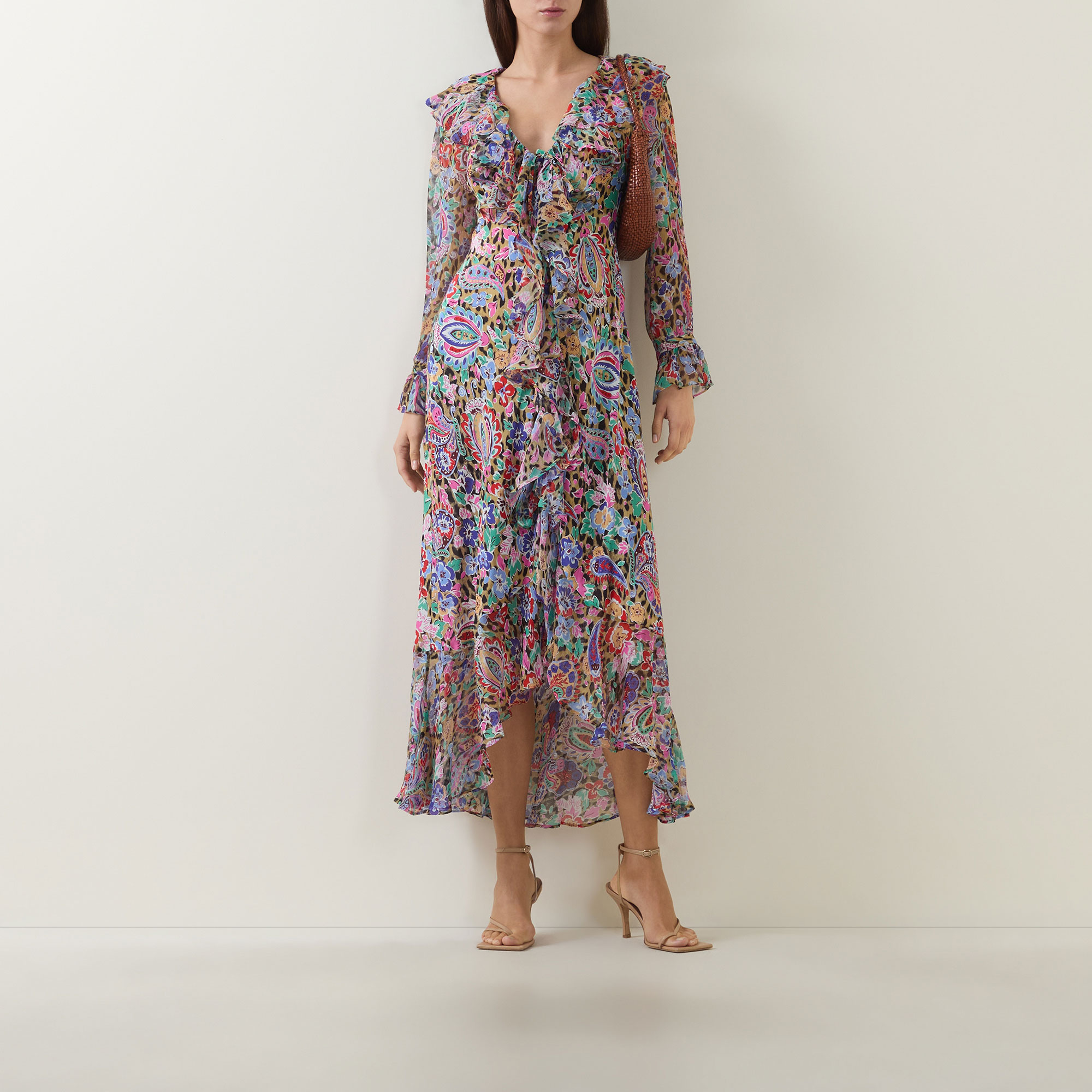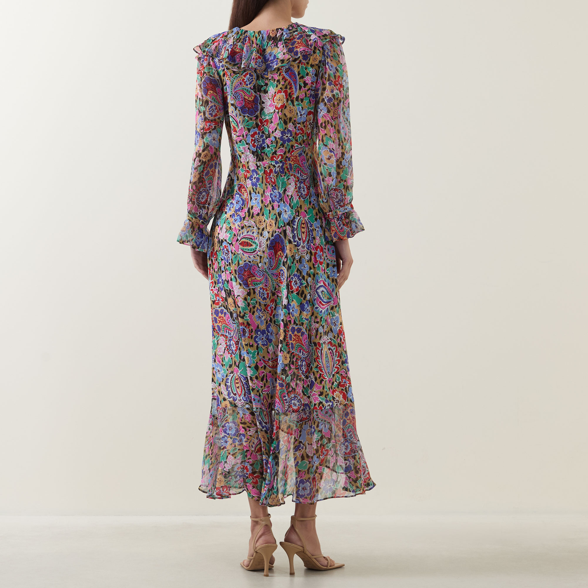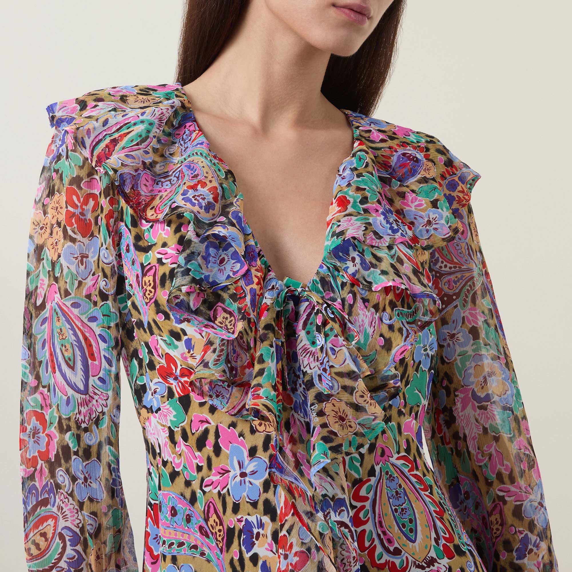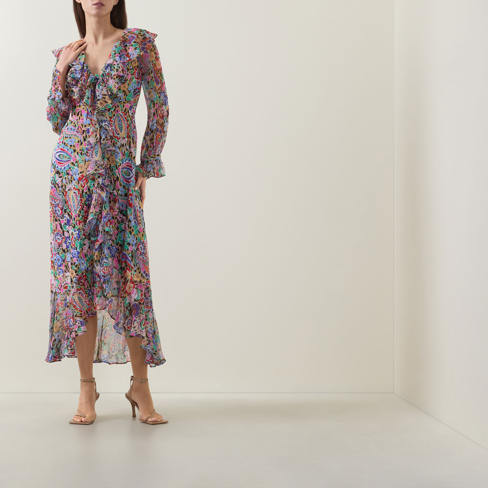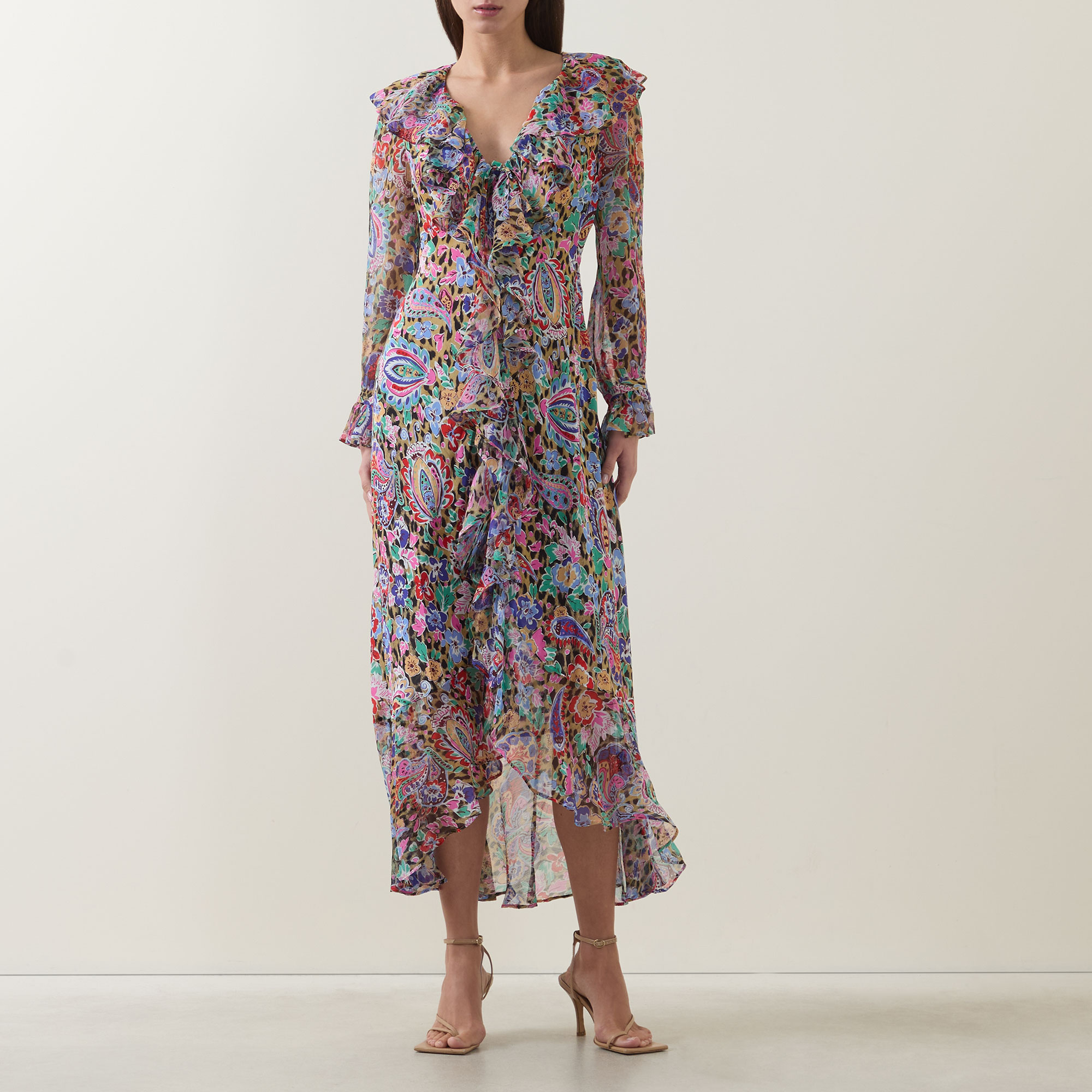 • V-neckline with ruffle trims, empire waist, long sleeves, midi length, asymmetric hemline, ruffle detailing, concealed side zip fastening, floral and leopard pattern