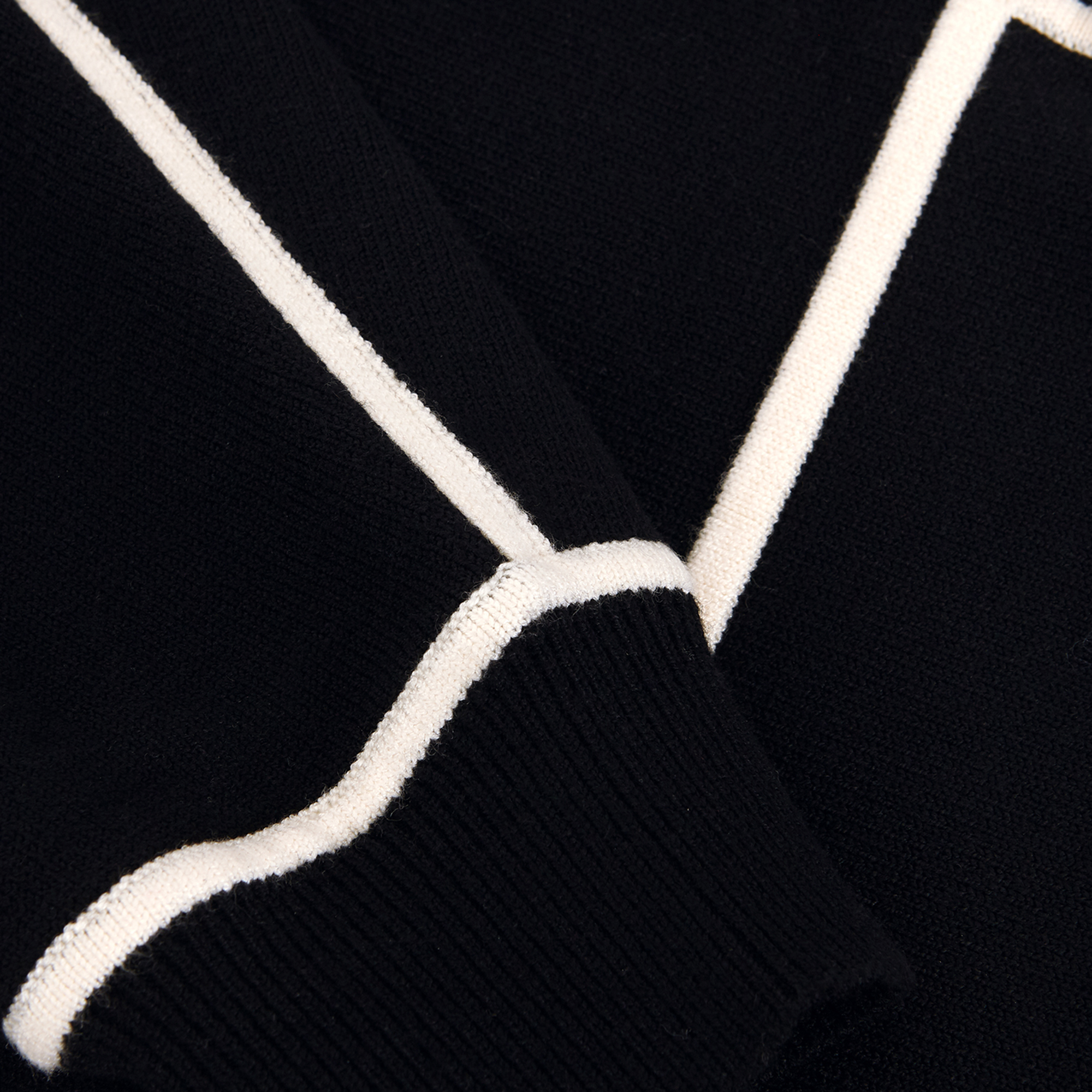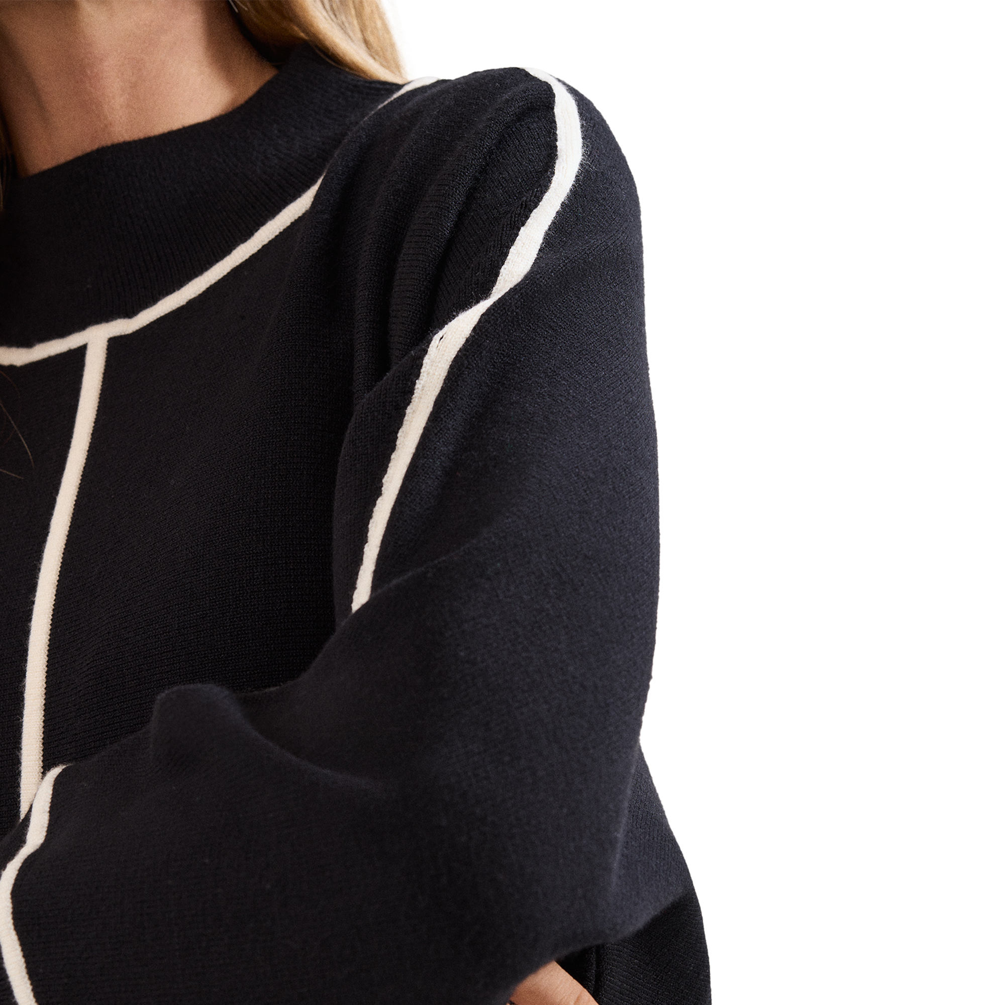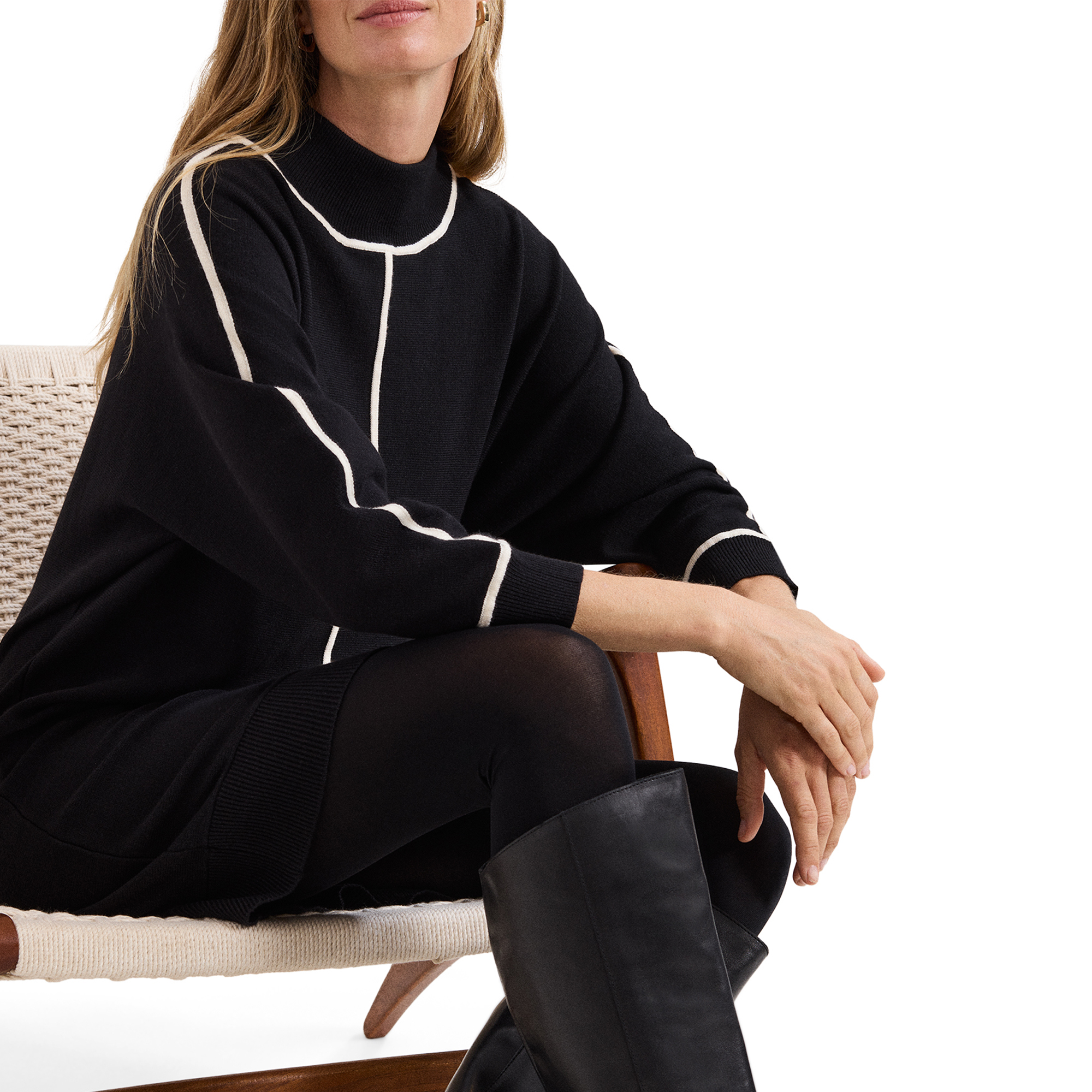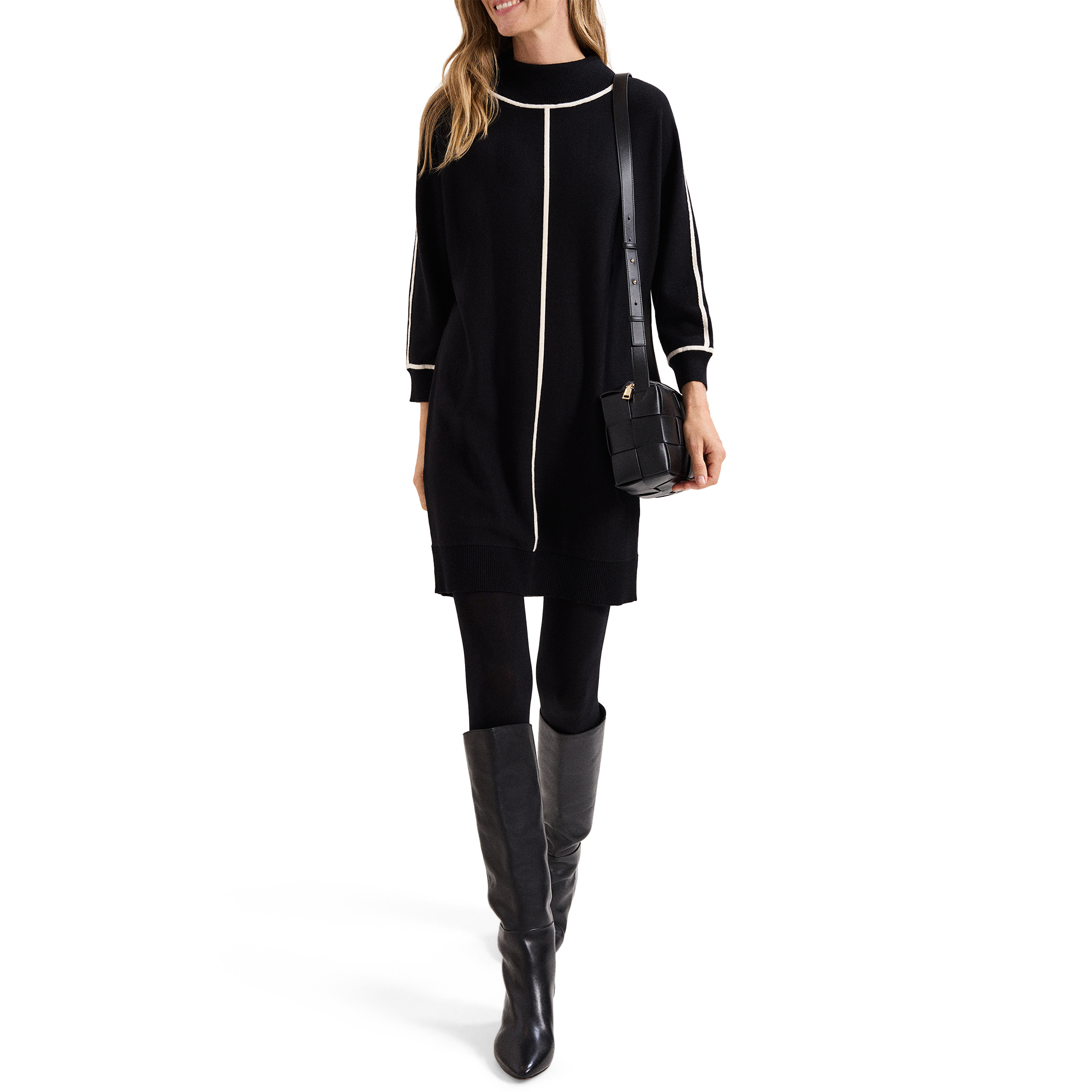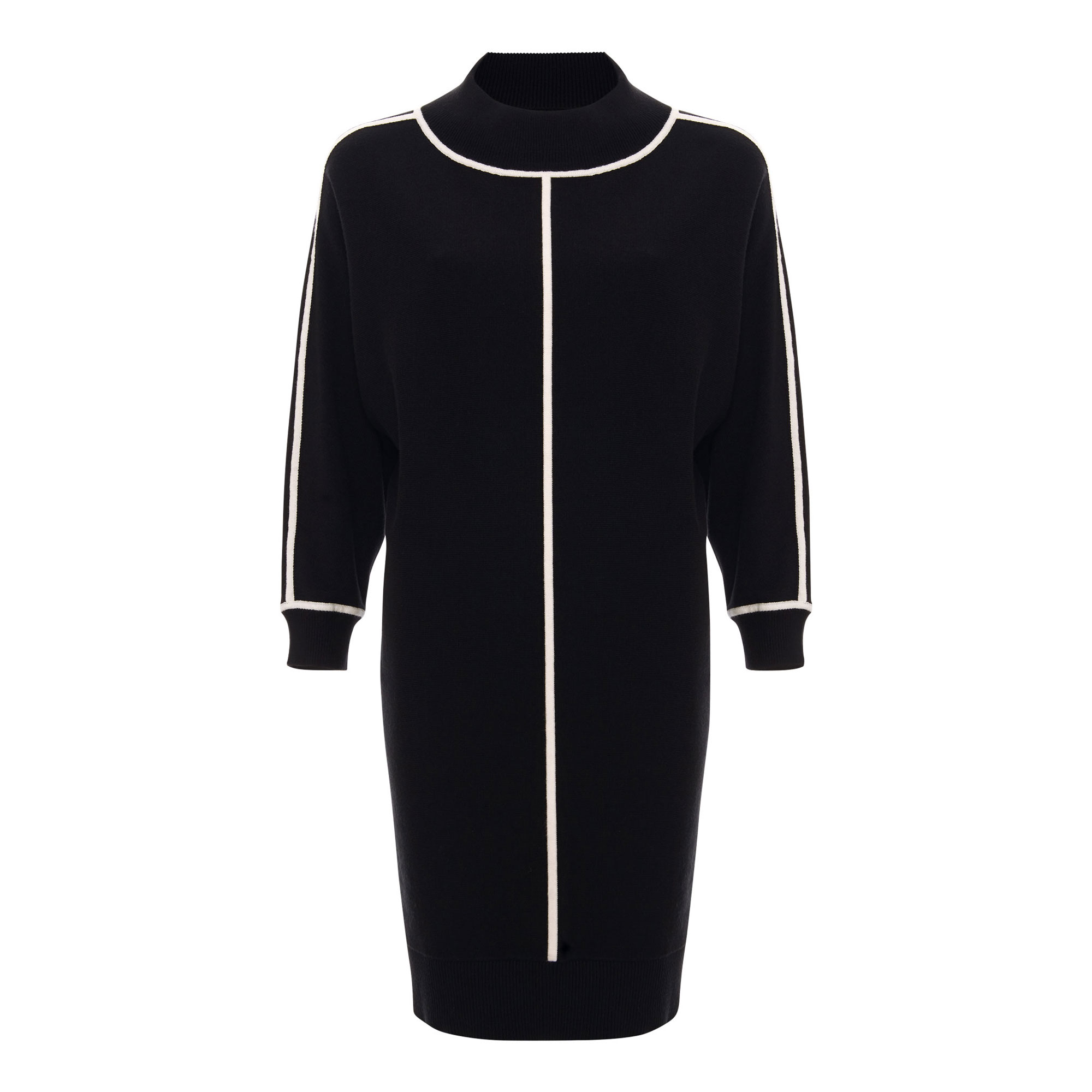 - Knitted, mini length, funnel neckline, contrast tipping, A-line silhouette, pull-on style, long sleeves