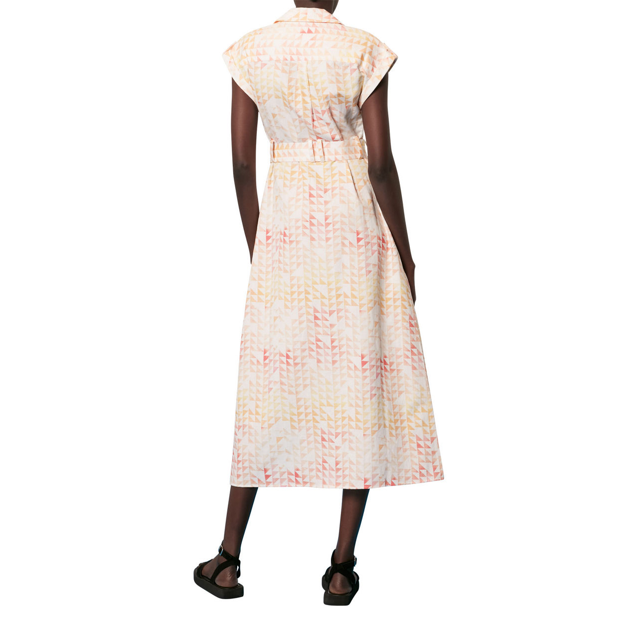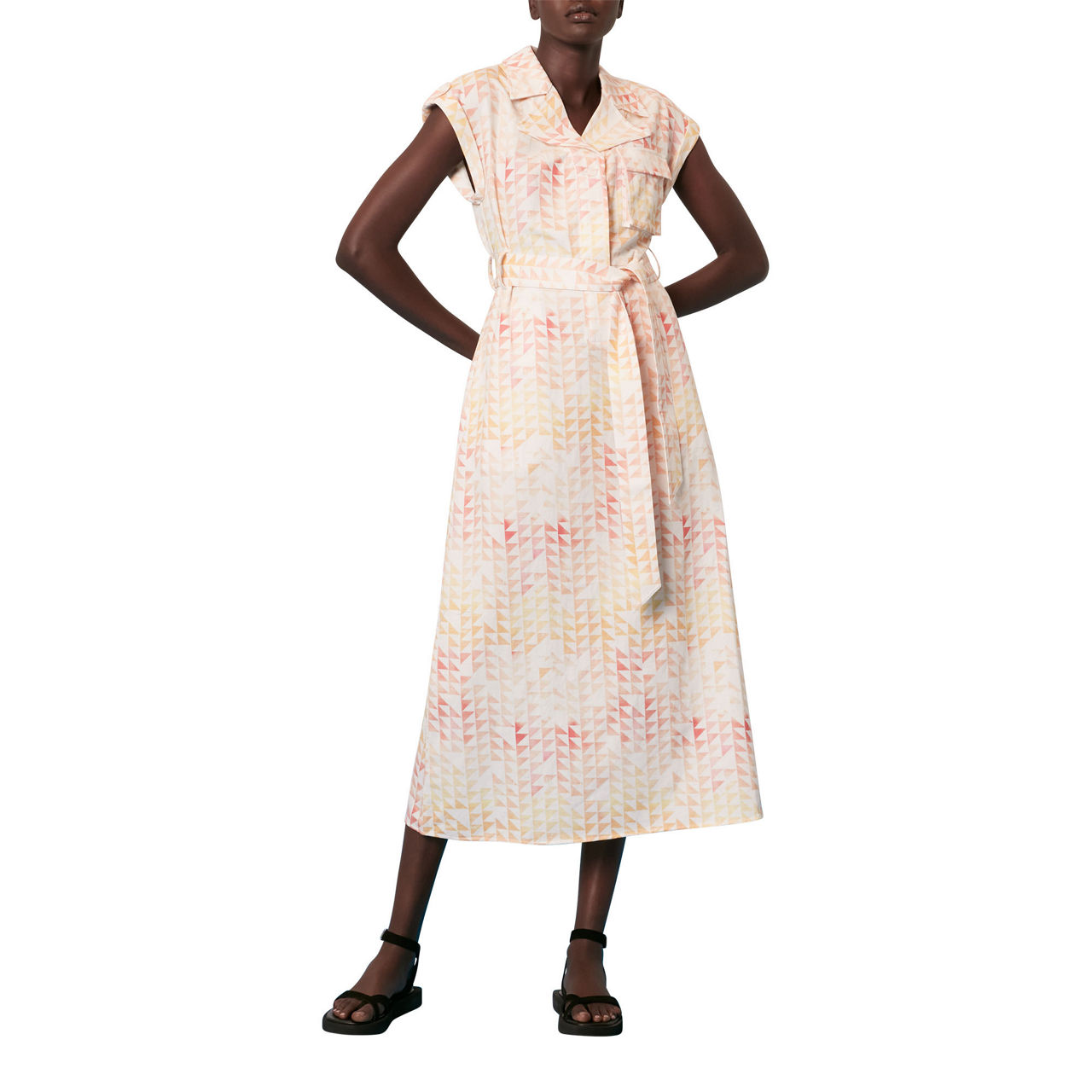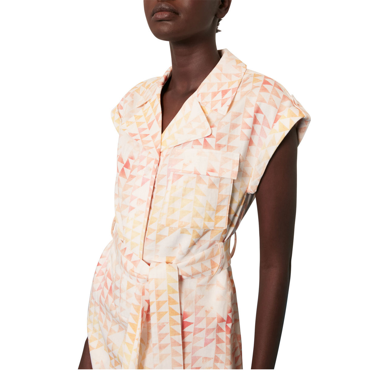 - Button fastening, hexagon print, patch pocket, tie waist, sleeveless, A-line skirt, midi length, notch lapel collar.