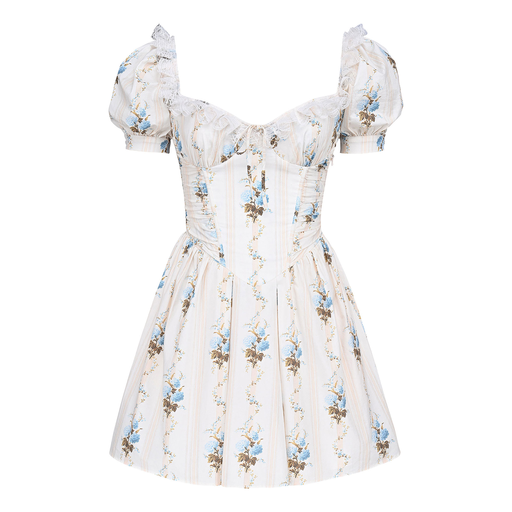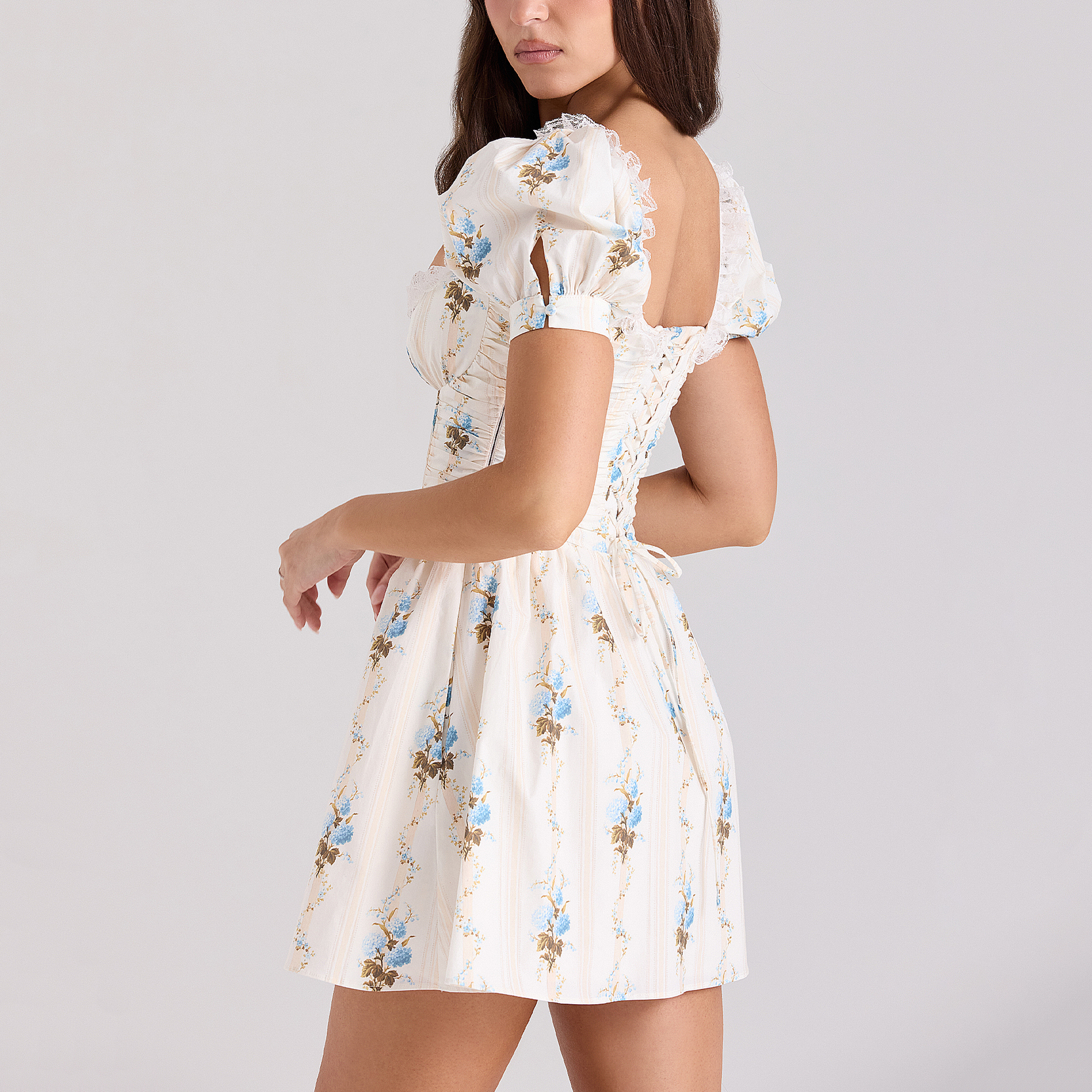 - Corseted design, fit-and-flare silhouette, wired cups, gathered panels, lace trim, side zip fastening, short puff sleeves, mini skirt