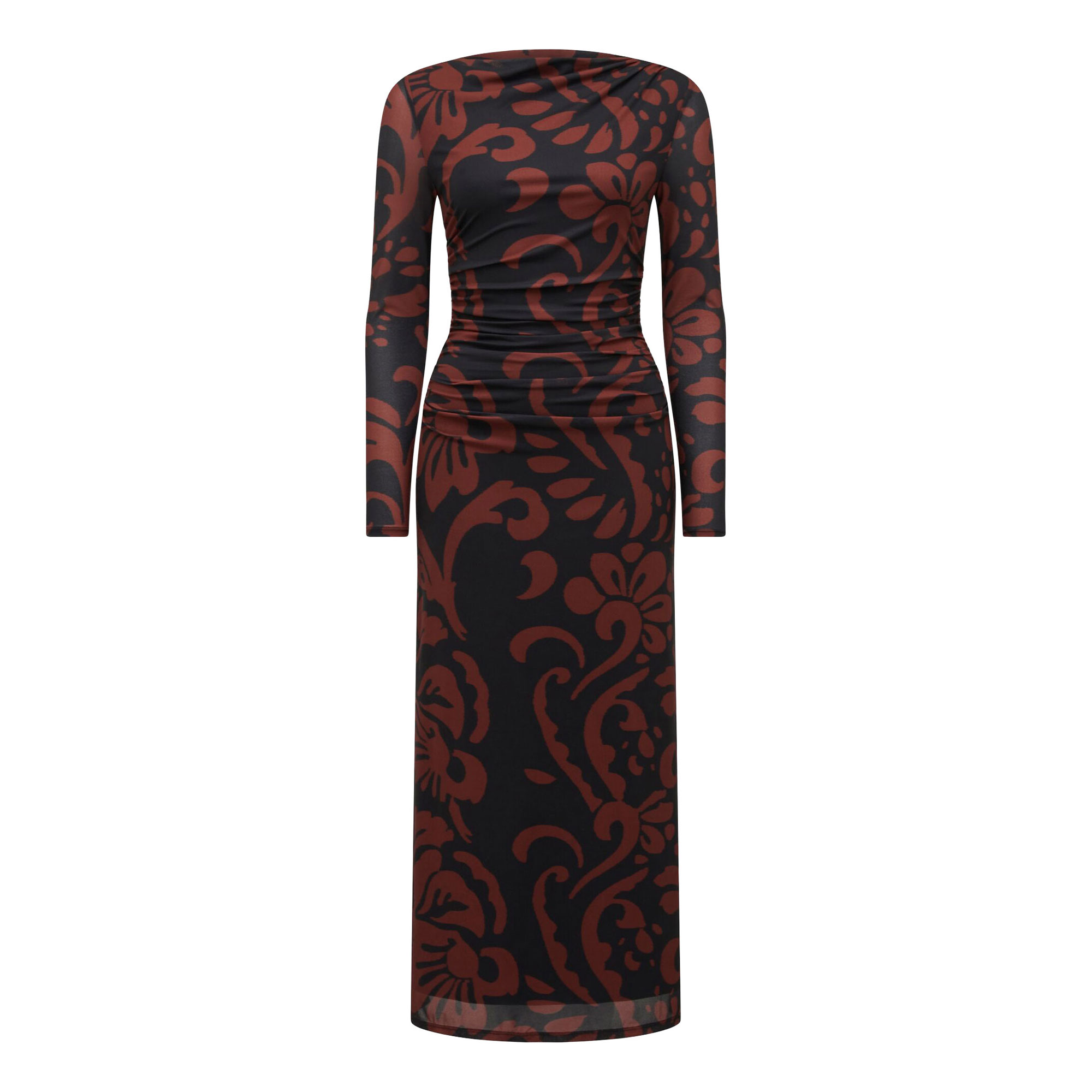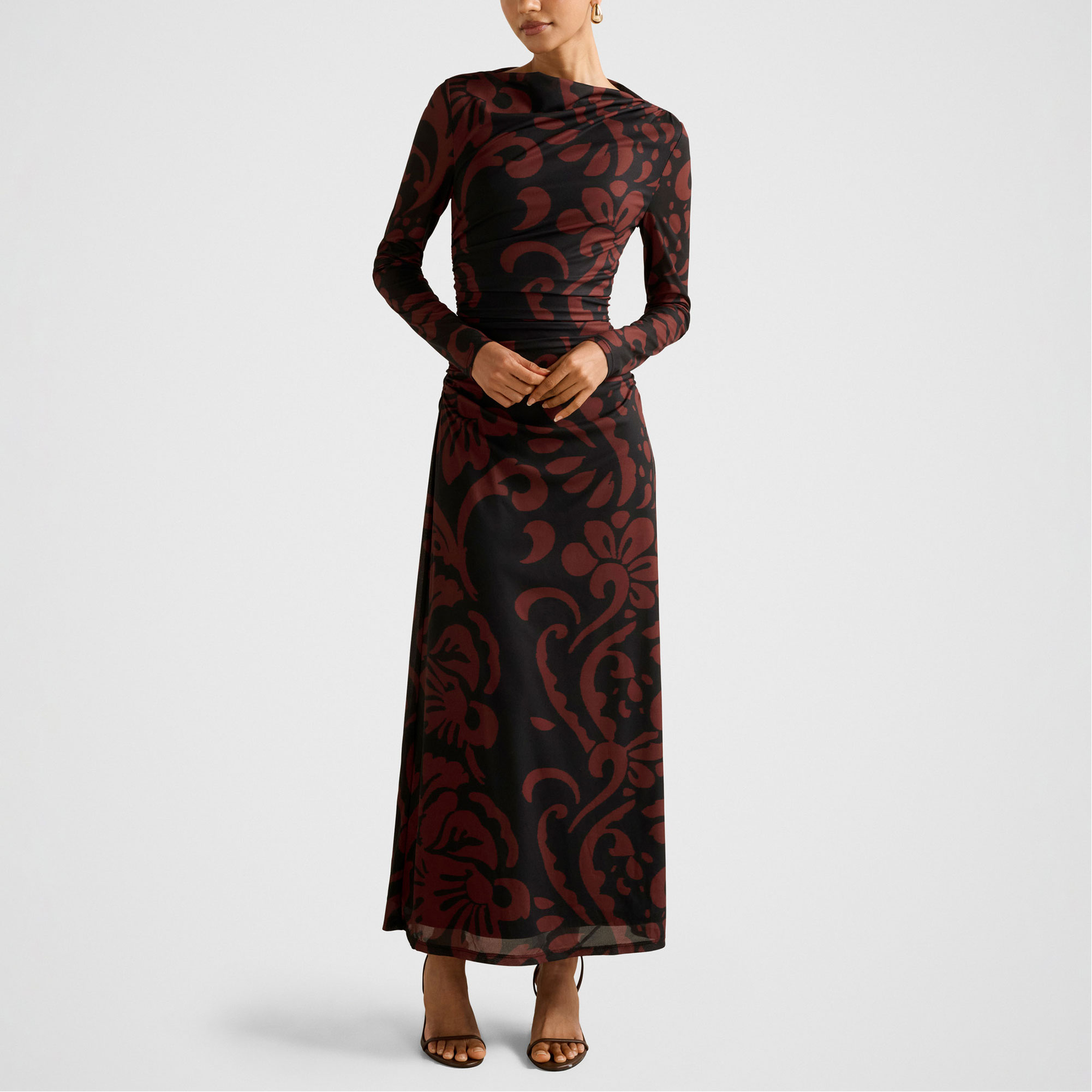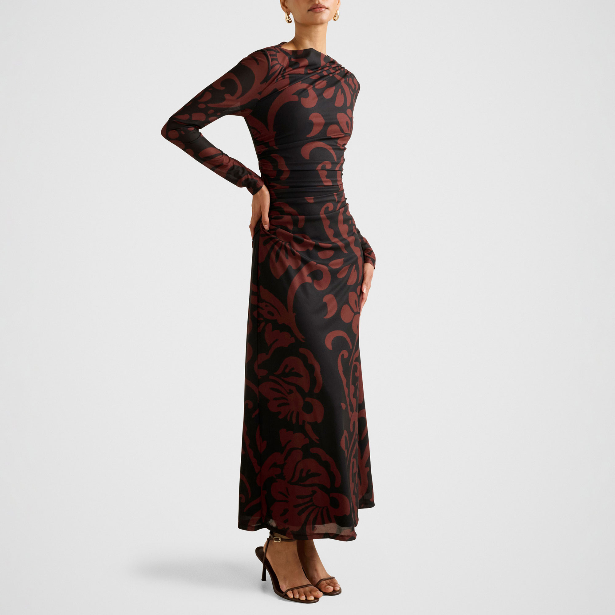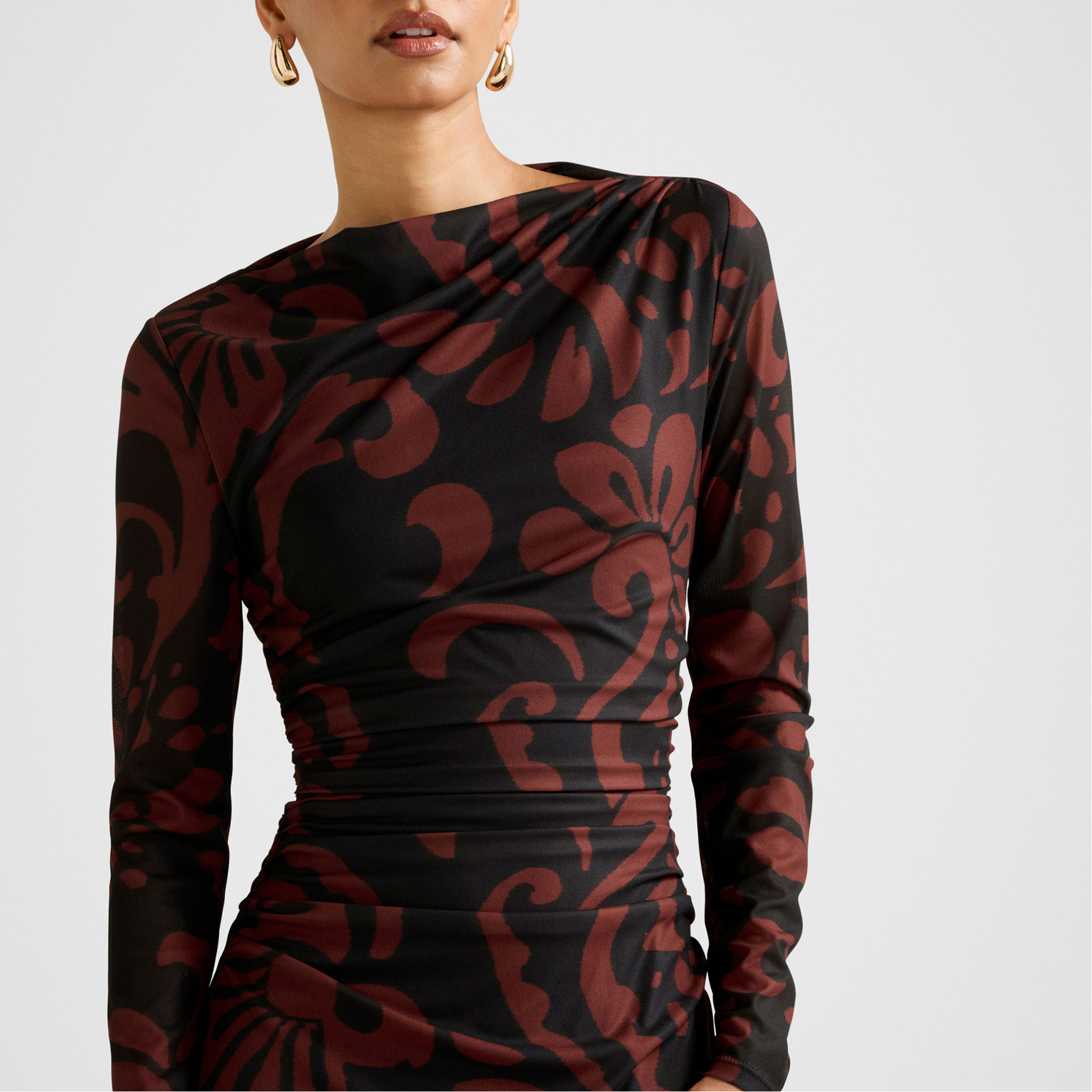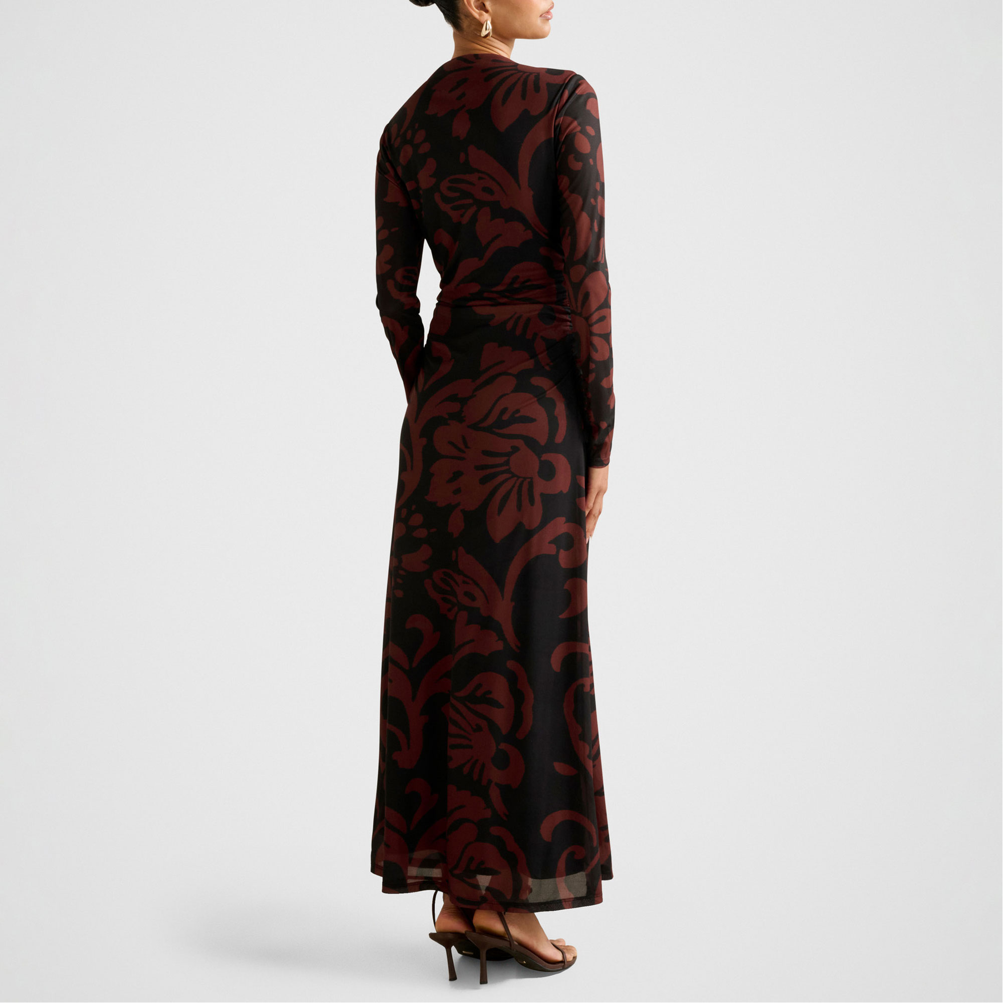 - High boat neckline, long fitted sleeves, gathered at the shoulders, ruched through the waist, column skirt silhouette, abstract floral patterning