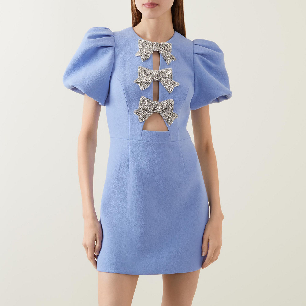 - Short puff sleeves, three crystal-embellished bows to the front, front cut-out panel, back zip-fastening closure, smooth fabric