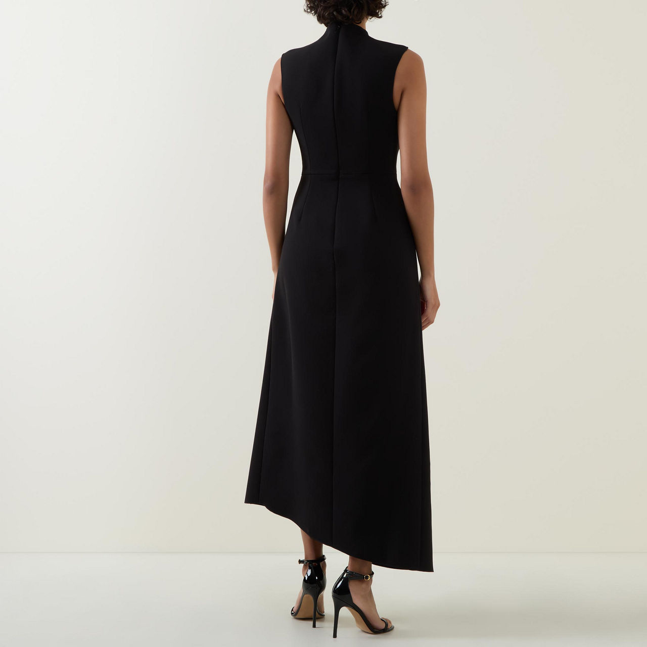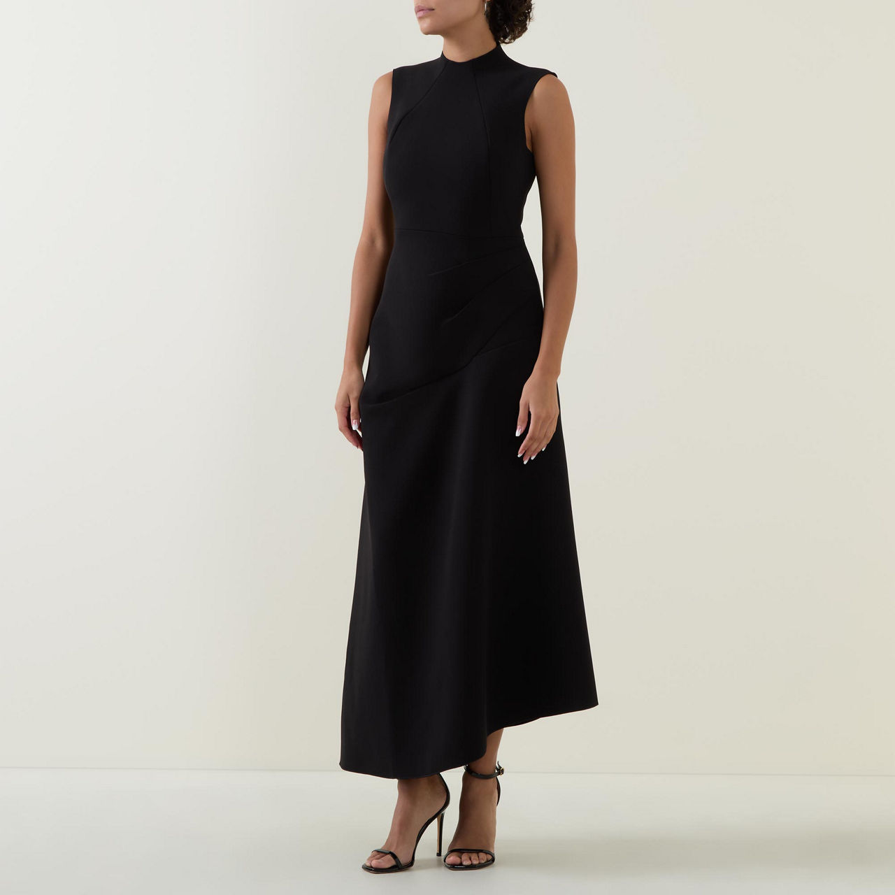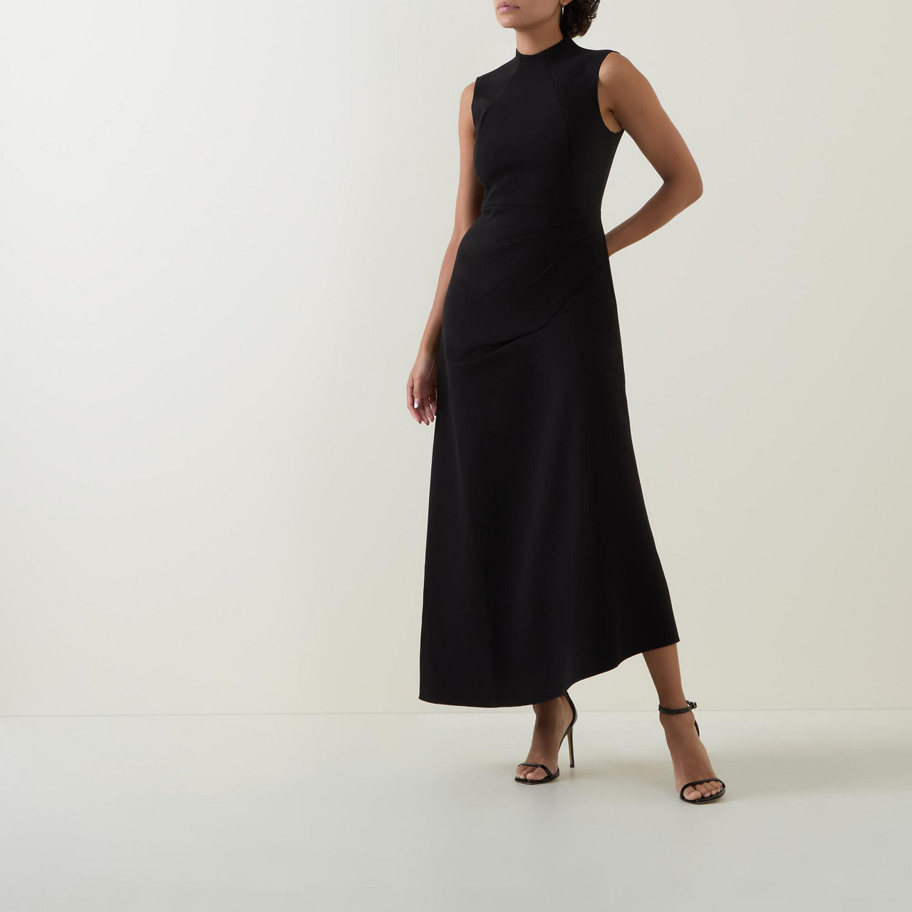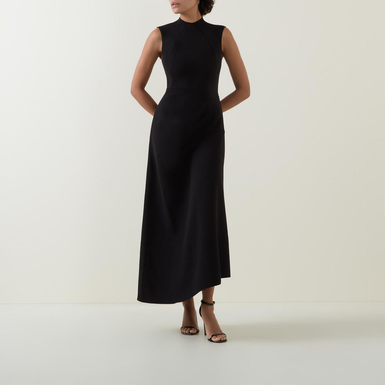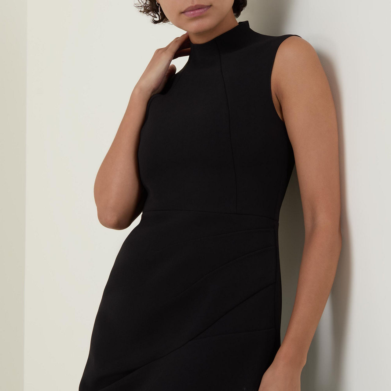 - Sleeveless, high neckline, back zip-fastening closure, flared silhouette, smooth fabric