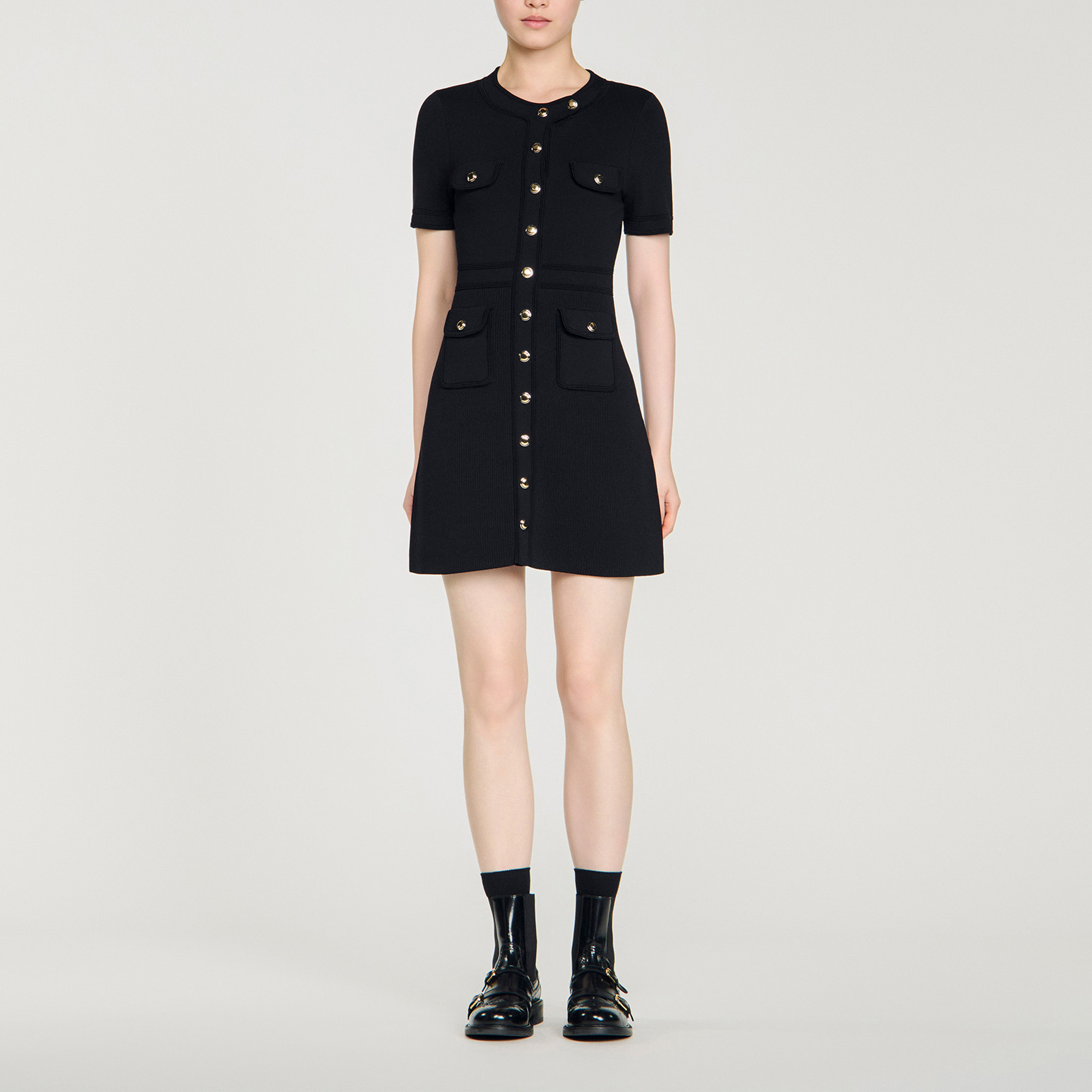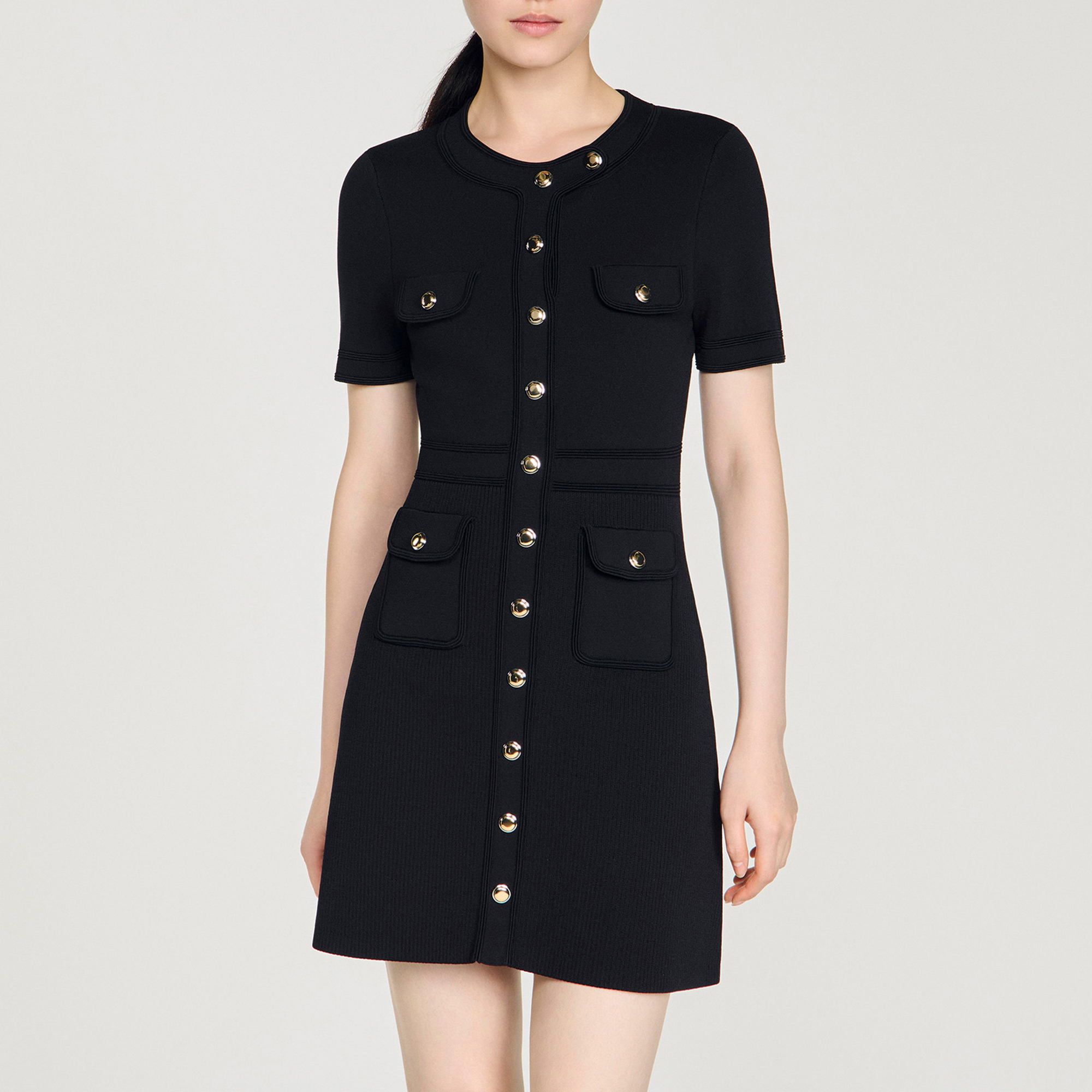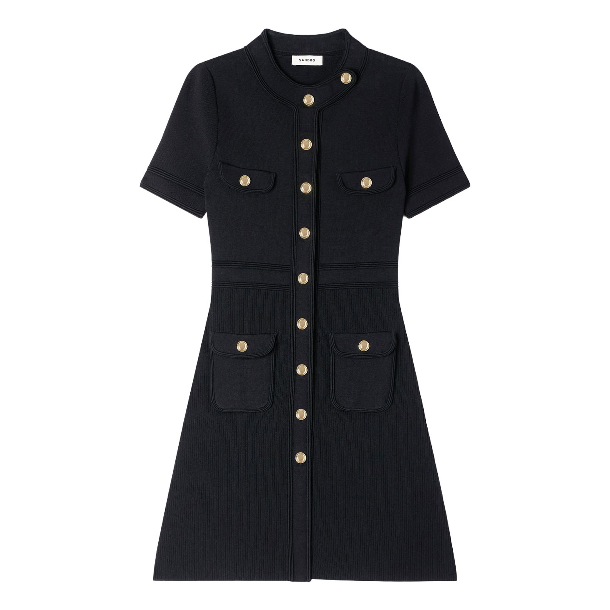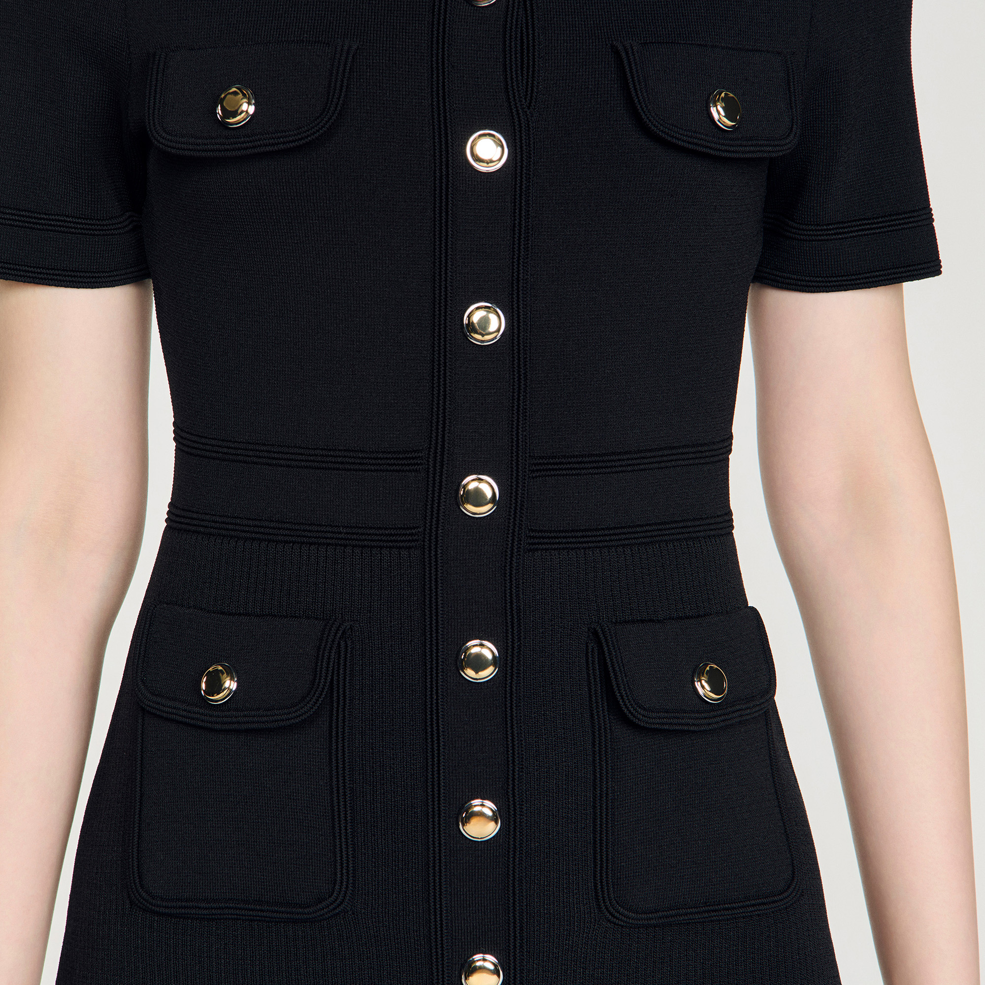 - Round neck, short sleeves, front button fastening, buttoned flap chest pocket, buttoned flap patch pockets, slightly flared skirt, knit construction