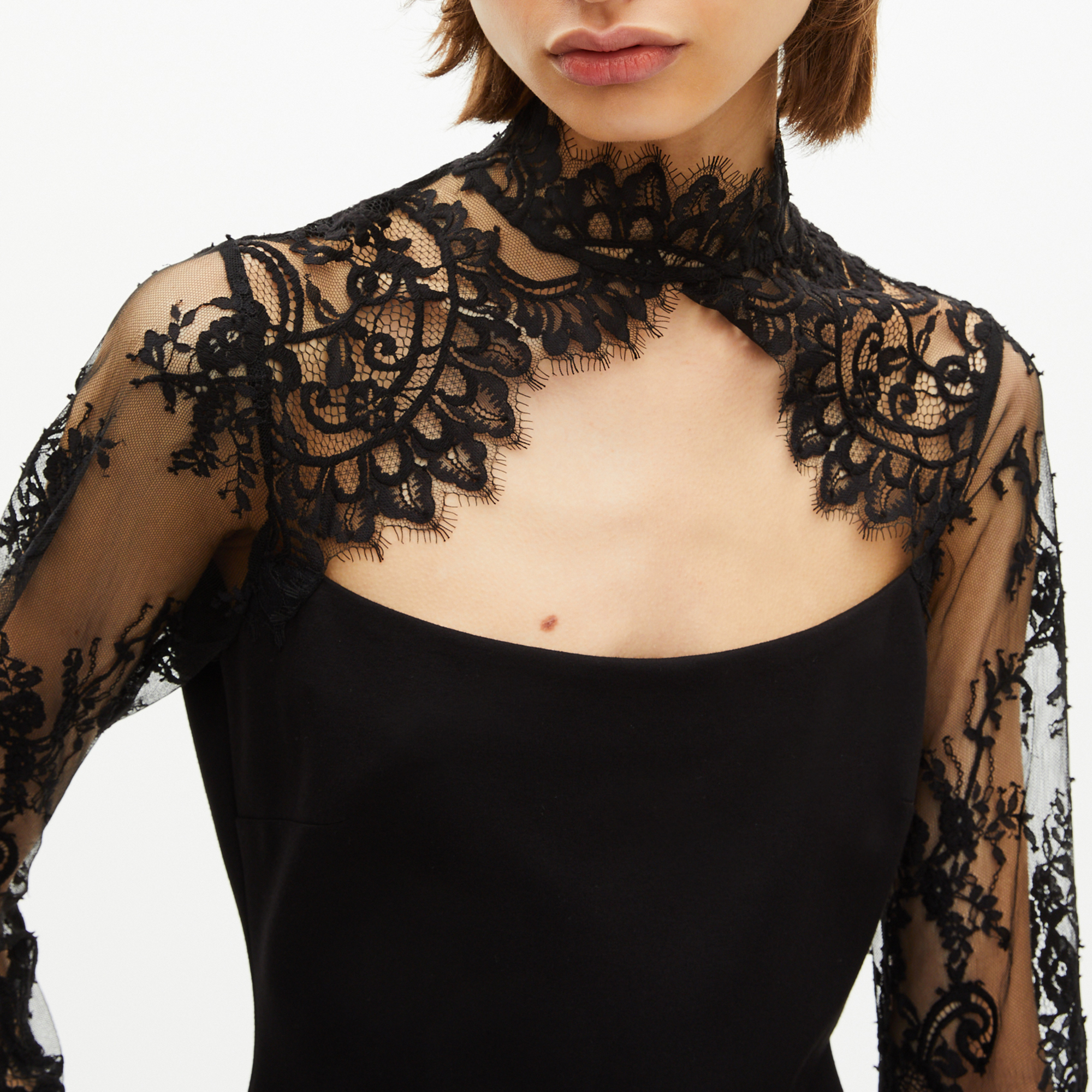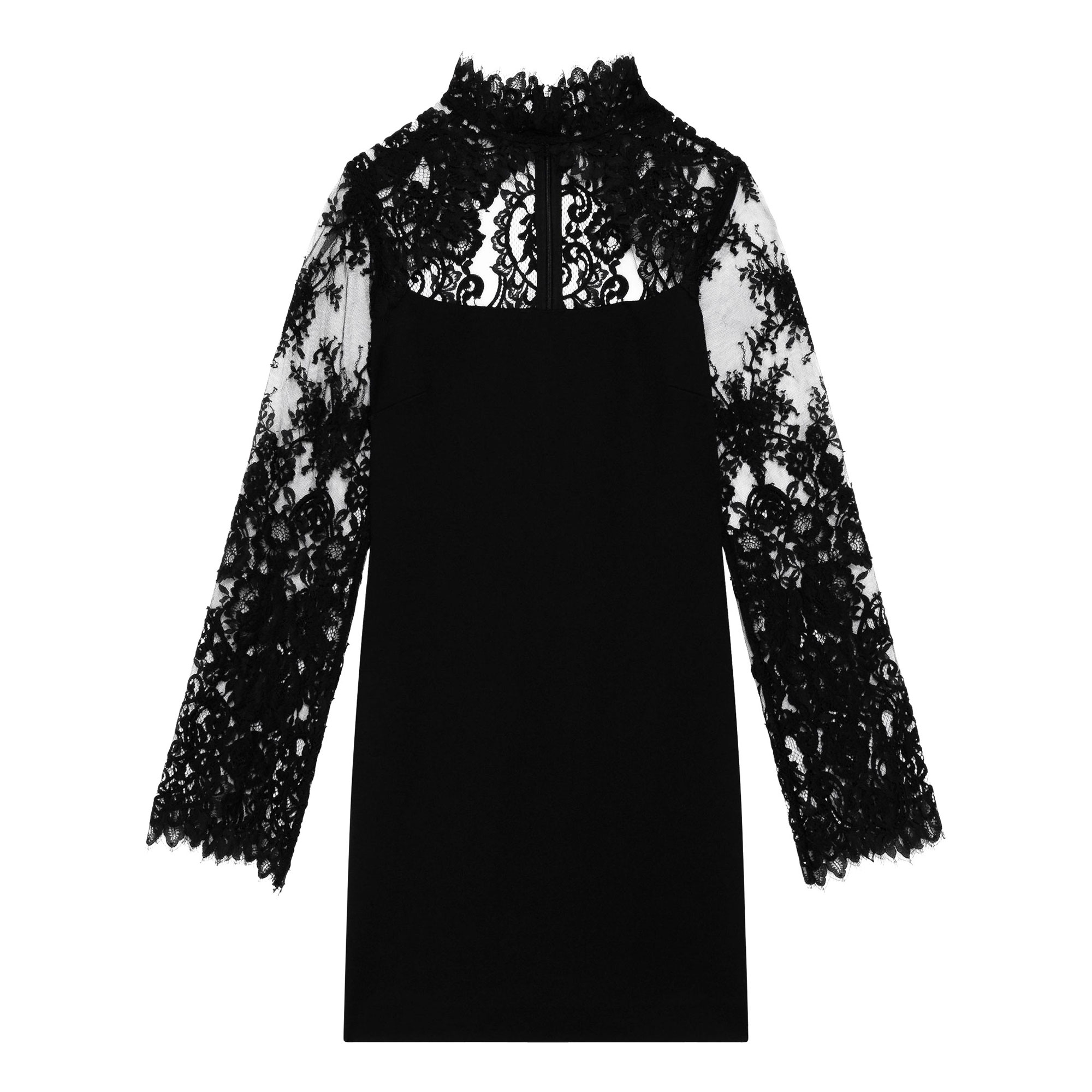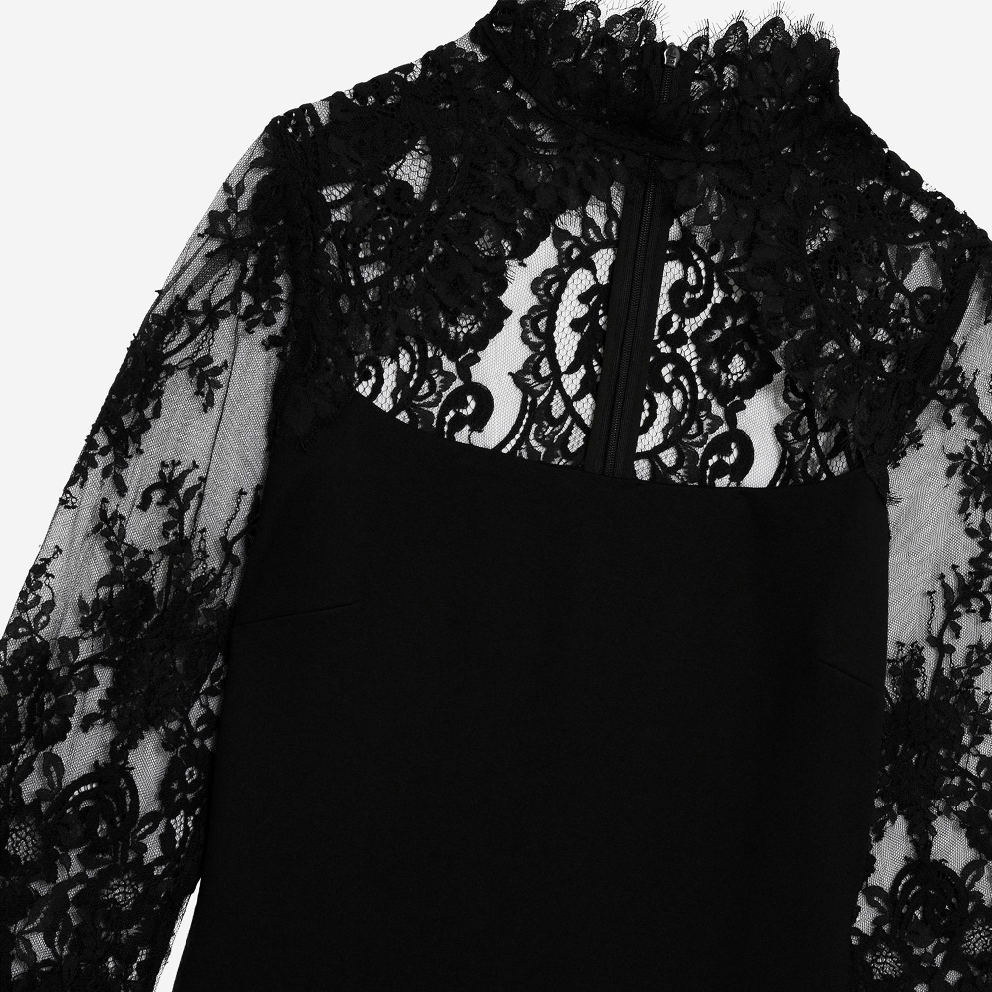 - Lace stand collar, long lace sleeves, invisible back zip, mini length