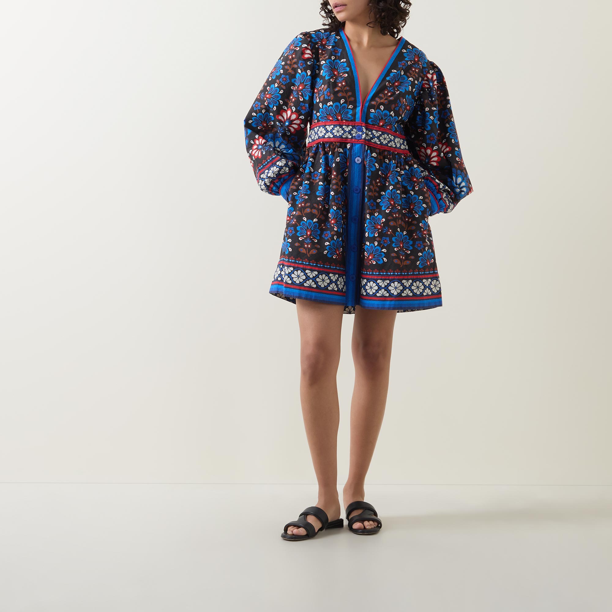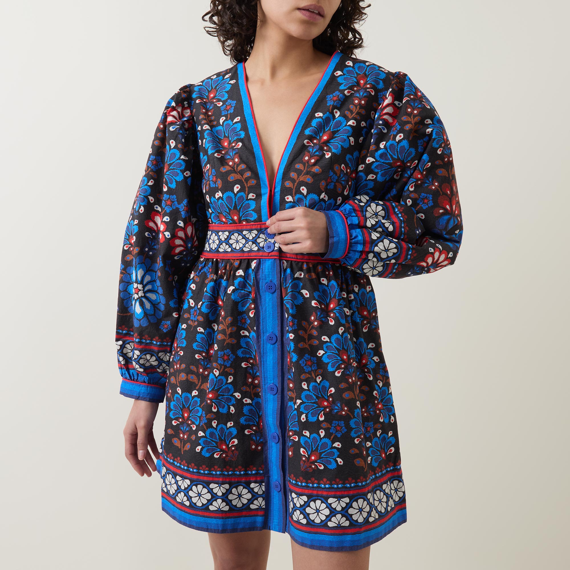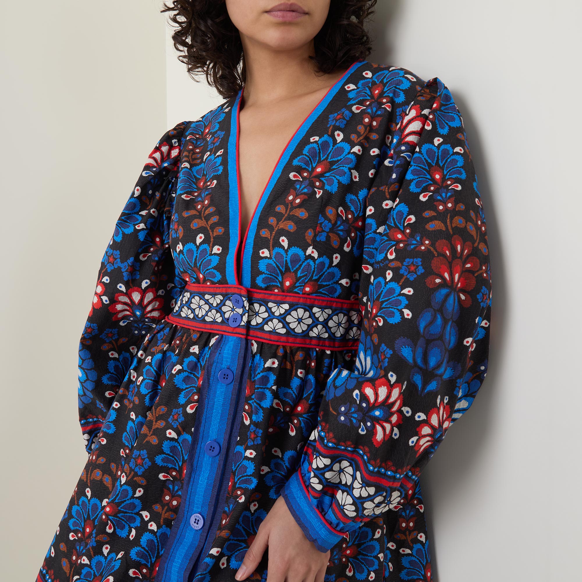 • V-neckline, long puff sleeves, buttoned cuffs, fitted waistband, concealed side zip fastening, front placket, flared skirt, two side entry pockets, straight hem, playful print throughout